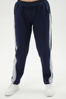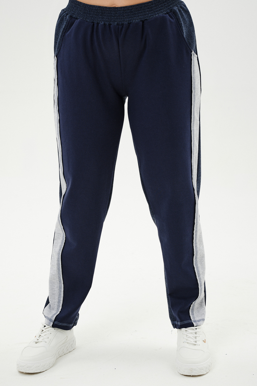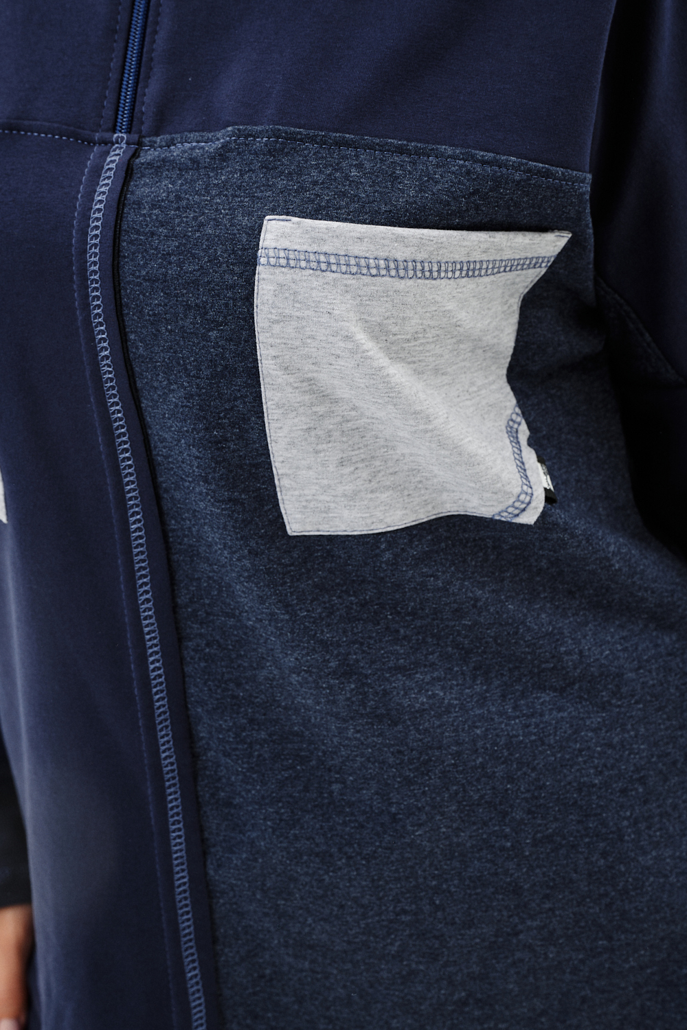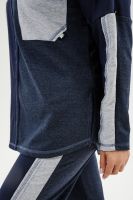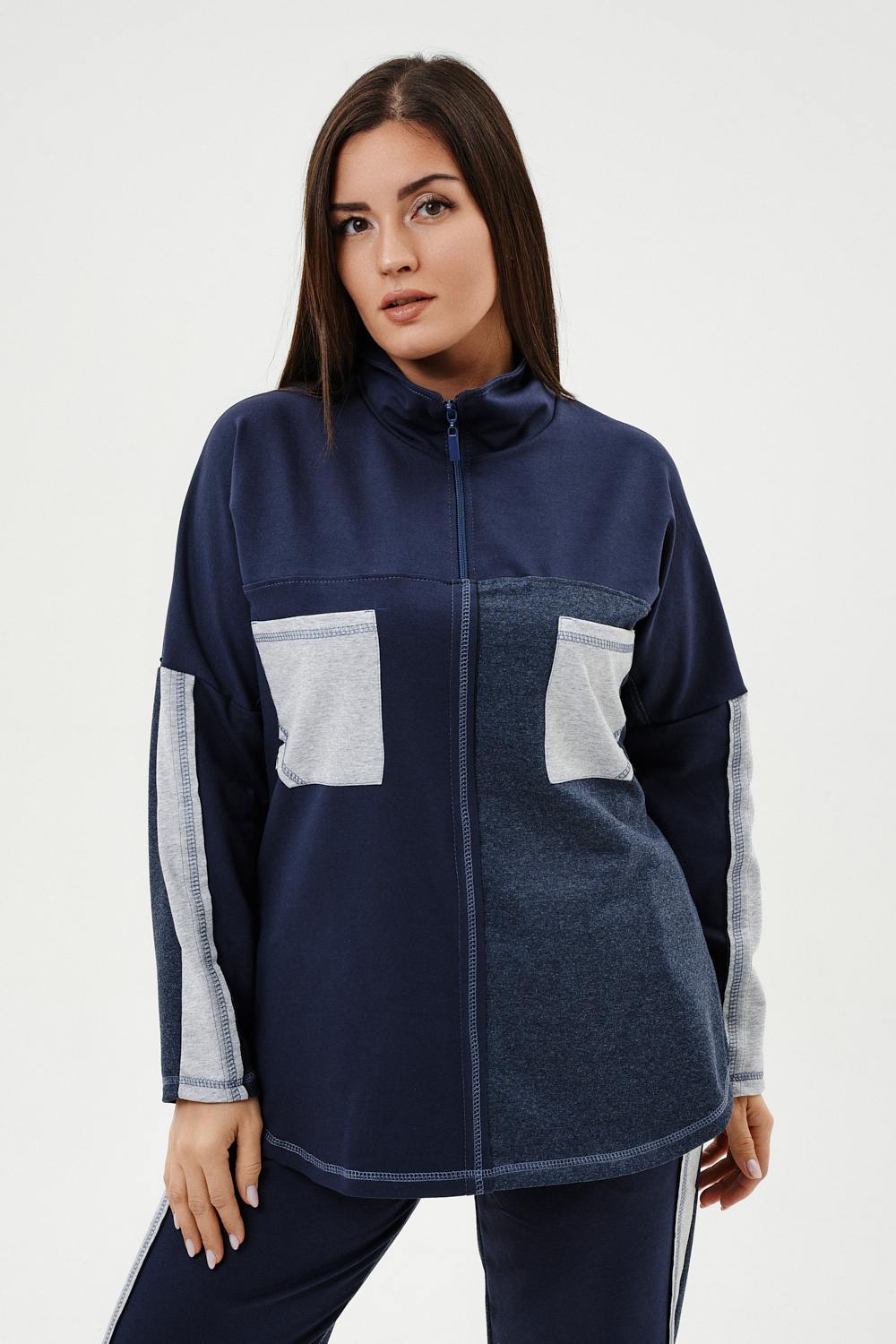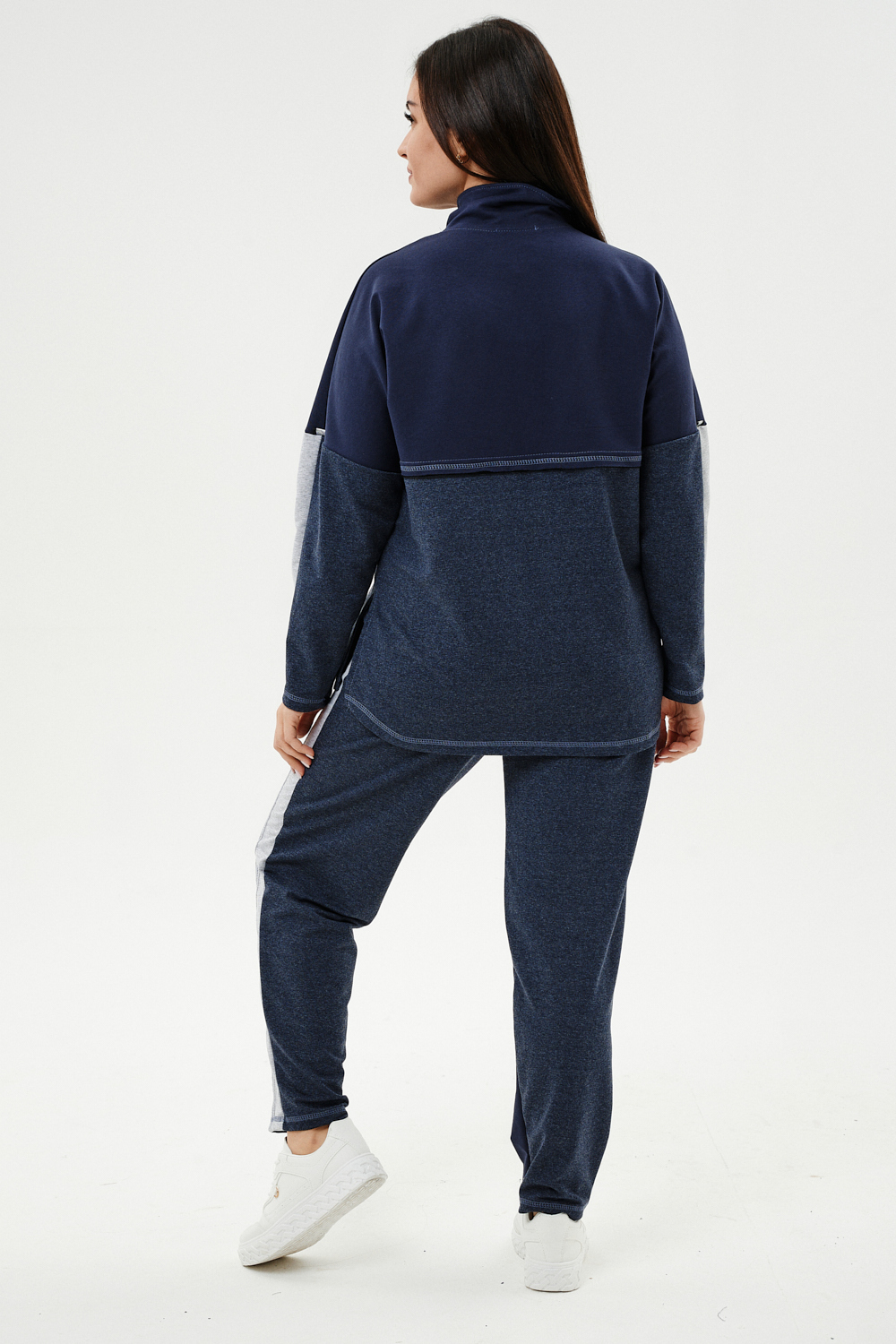 Костюм женский: толстовка и брюки. Толстовка прямого силуэта, брюки свободные по бедрам, зауженные к низу. Рукав цельнокроенный со швом. Воротник-стойка застегивается на тесьму-молнию. В костюме удачно сочетается однотонный футер с меланжированным. На спинке и полочке кокетки. Нагрудные карманы, лампасы на рукавах и брюках из контрастной отделочной ткани. На передних половинках брюк внутренние карманы.