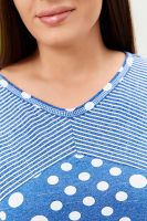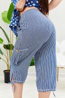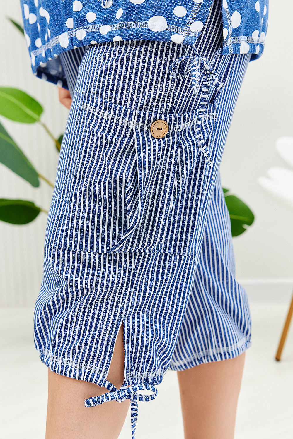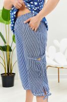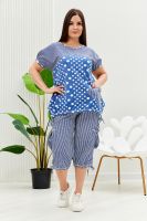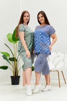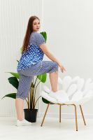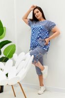 Костюм женский, туника и бриджи. Туника расширенная к низу с боковыми разрезами, низ фиксируется завязками. Горловина Y-образная, рукав короткий цельнокроенный, около плечевого шва небольшая сборка. Кокетка полочки и спинки из двух частей в полоску, соединяющихся под наклоном. На полочке накладной фигурный карман. Бриджи прямого силуэта, внизу брюк разрезы и утяжки. На передних частях внутренние карманы и боковые с бантовой складкой. Пояс выполнен на многоигольной машине.