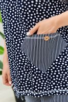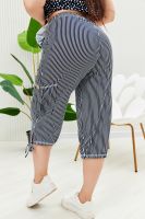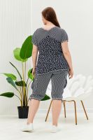 Костюм женский, туника и бриджи. Туника расширенная к низу с боковыми разрезами, низ фиксируется завязками. Горловина Y-образная, рукав короткий цельнокроенный, около плечевого шва небольшая сборка. Кокетка полочки и спинки из двух частей в полоску, соединяющихся под наклоном. На полочке накладной фигурный карман. Бриджи прямого силуэта, внизу брюк разрезы и утяжки. На передних частях внутренние карманы и боковые с бантовой складкой. Пояс выполнен на многоигольной машине.