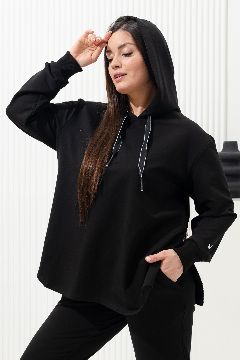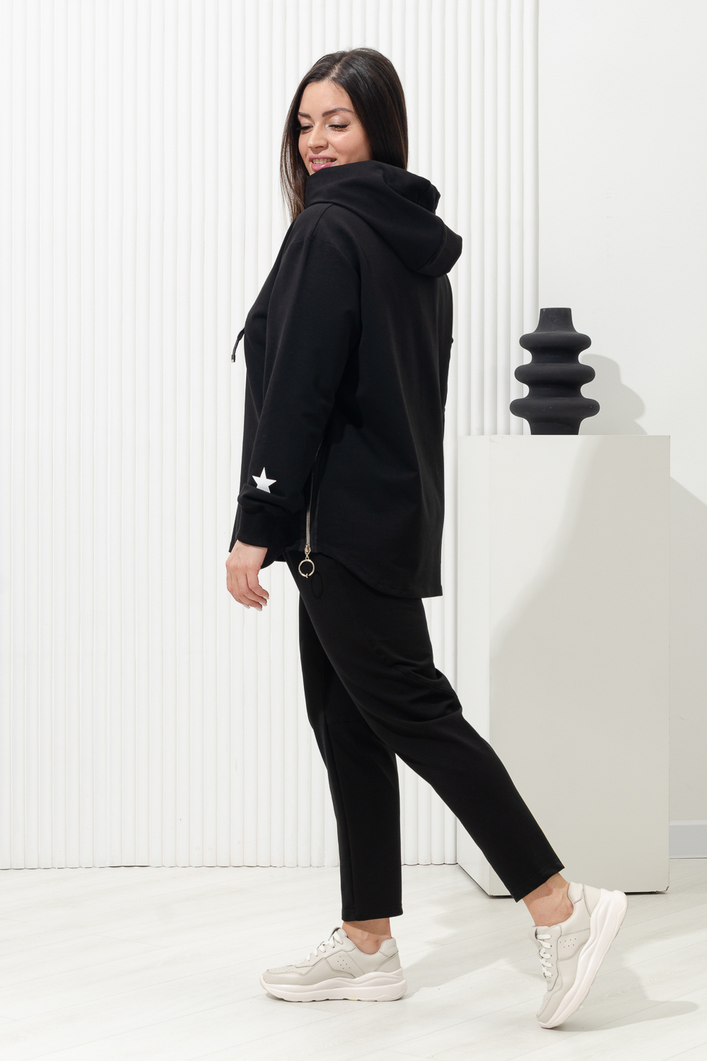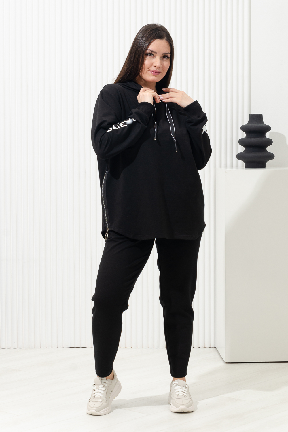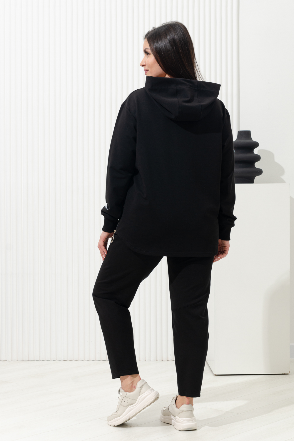 Костюм женский: толстовка и брюки. Брюки женские, свободные по бедрам, зауженные к низу. На передних частях брюк внутренние карманы. На задних частях брюк фигурные рельефы, переходящие в боковой шов. Толстовка прямого силуэта с капюшоном. Рукав спущенный. Низ толстовки фигурный, сбоку стильные молнии, при расстегивании образуют разрезы. На рукавах модный принт.