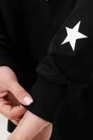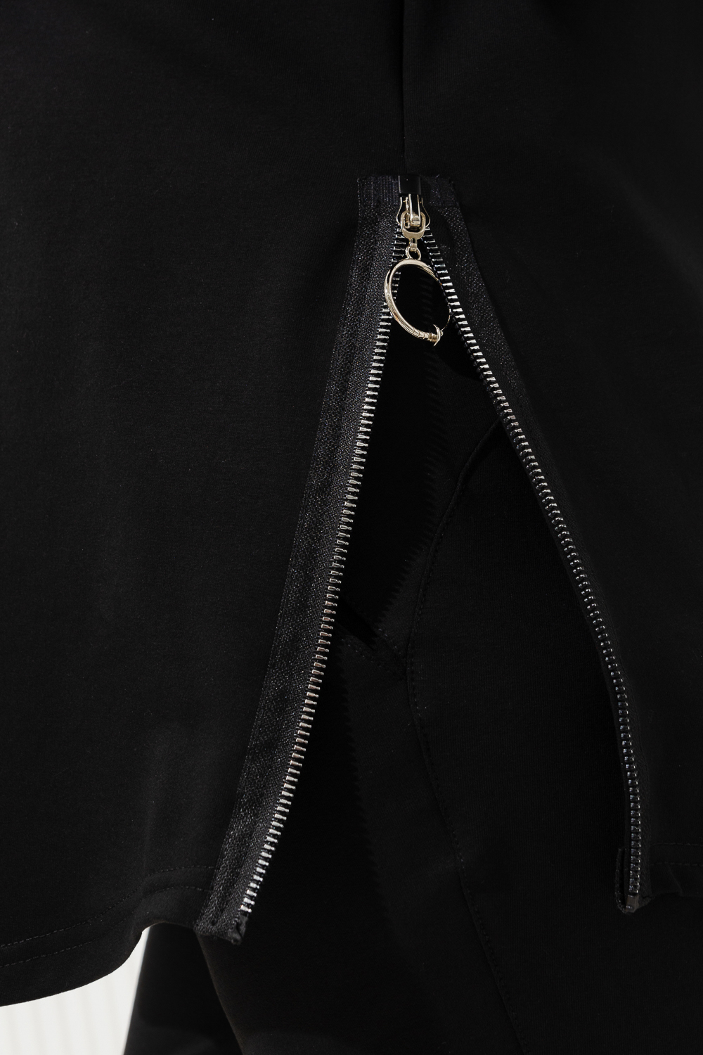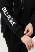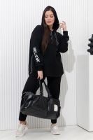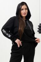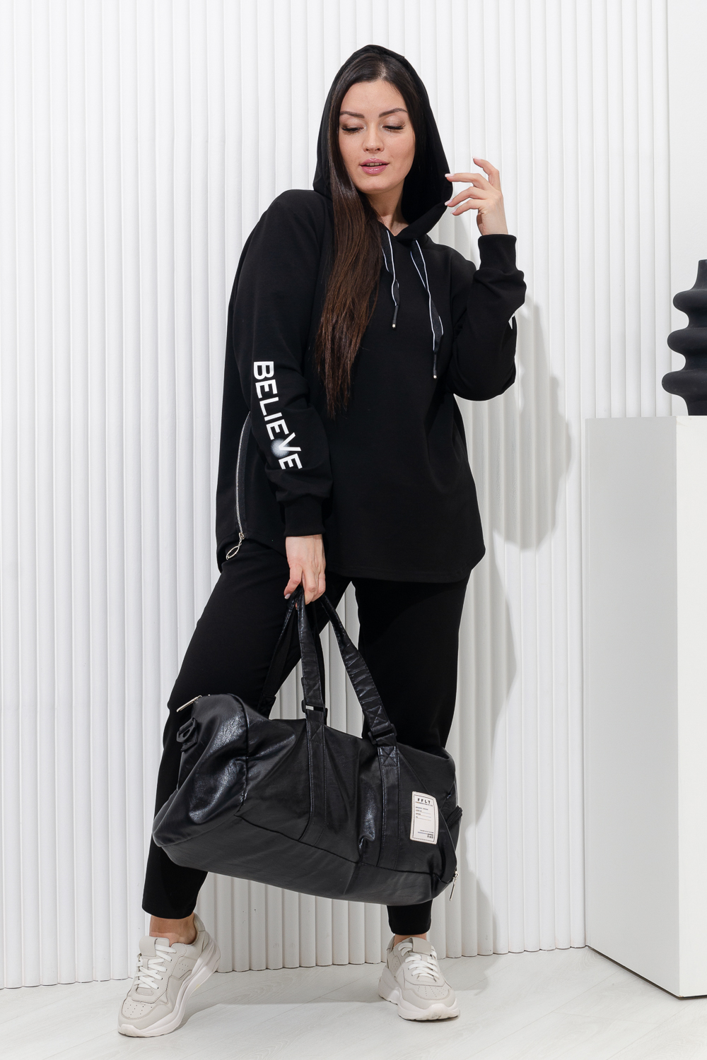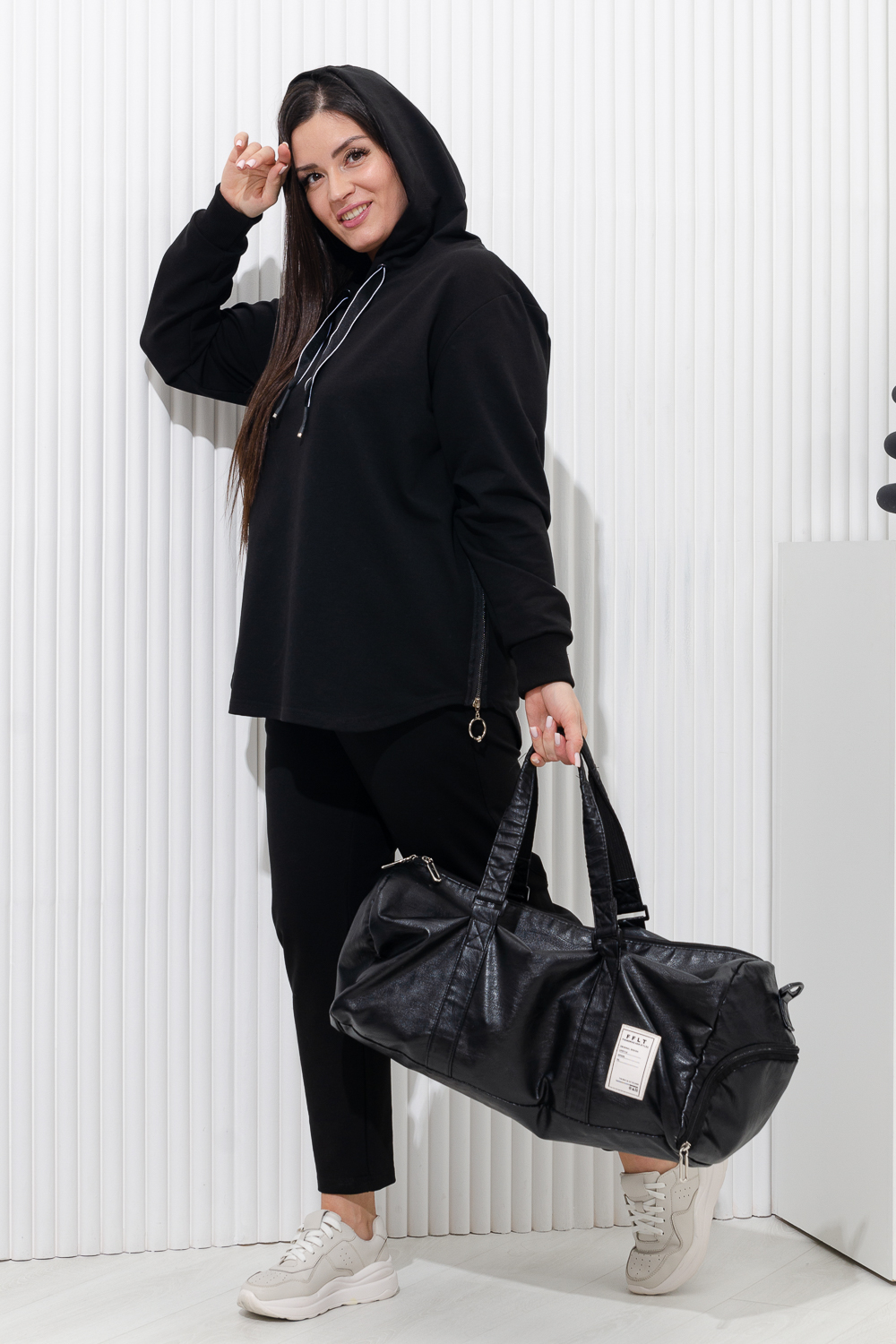 Костюм женский: толстовка и брюки. Брюки женские, свободные по бедрам, зауженные к низу. На передних частях брюк внутренние карманы. На задних частях брюк фигурные рельефы, переходящие в боковой шов. Толстовка прямого силуэта с капюшоном. Рукав спущенный. Низ толстовки фигурный, сбоку стильные молнии, при расстегивании образуют разрезы. На рукавах модный принт.