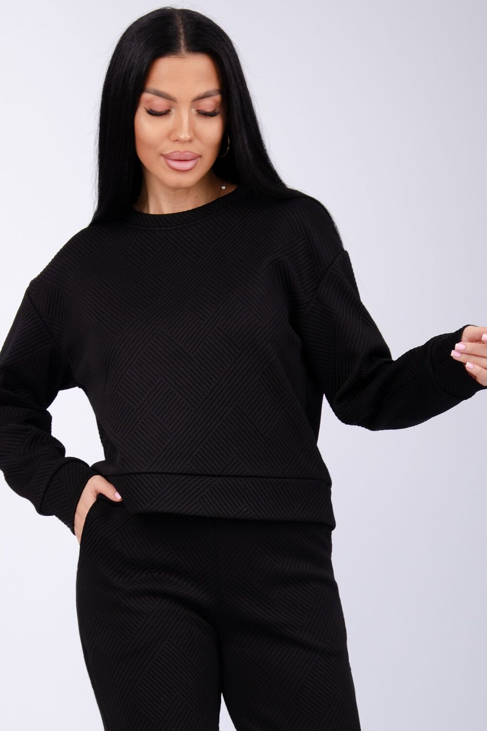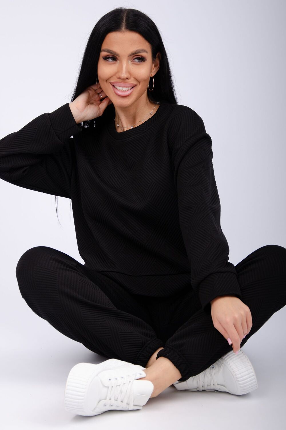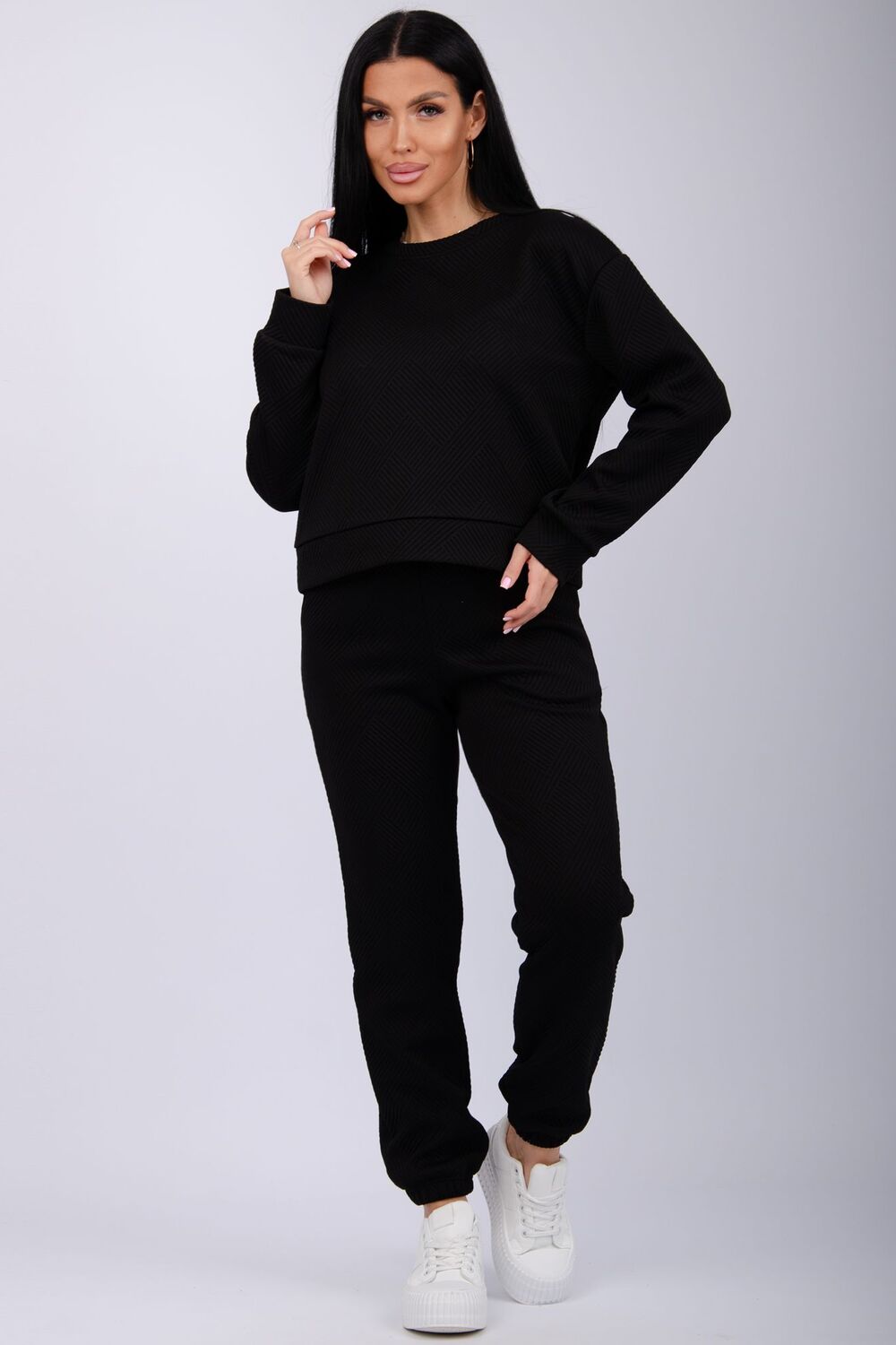 Удобный костюм для повседневной носки и активного отдыха и выхода в свет. Варианты цветов вас приятно удивят: глубокий черный, шоколадный коричневый, серый графит и милый молочный. Верх: джемпер с манжетами на рукавах, низ: прямые брюки на резинке. Приятная фактурная ткань с объёмным геометрическим узором придаст элегантность вашему образу. Костюм легко комбинировать с кроссовками и ботинками. Отличный выбор для осени и зимы.