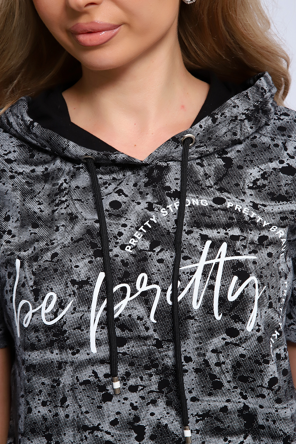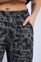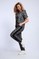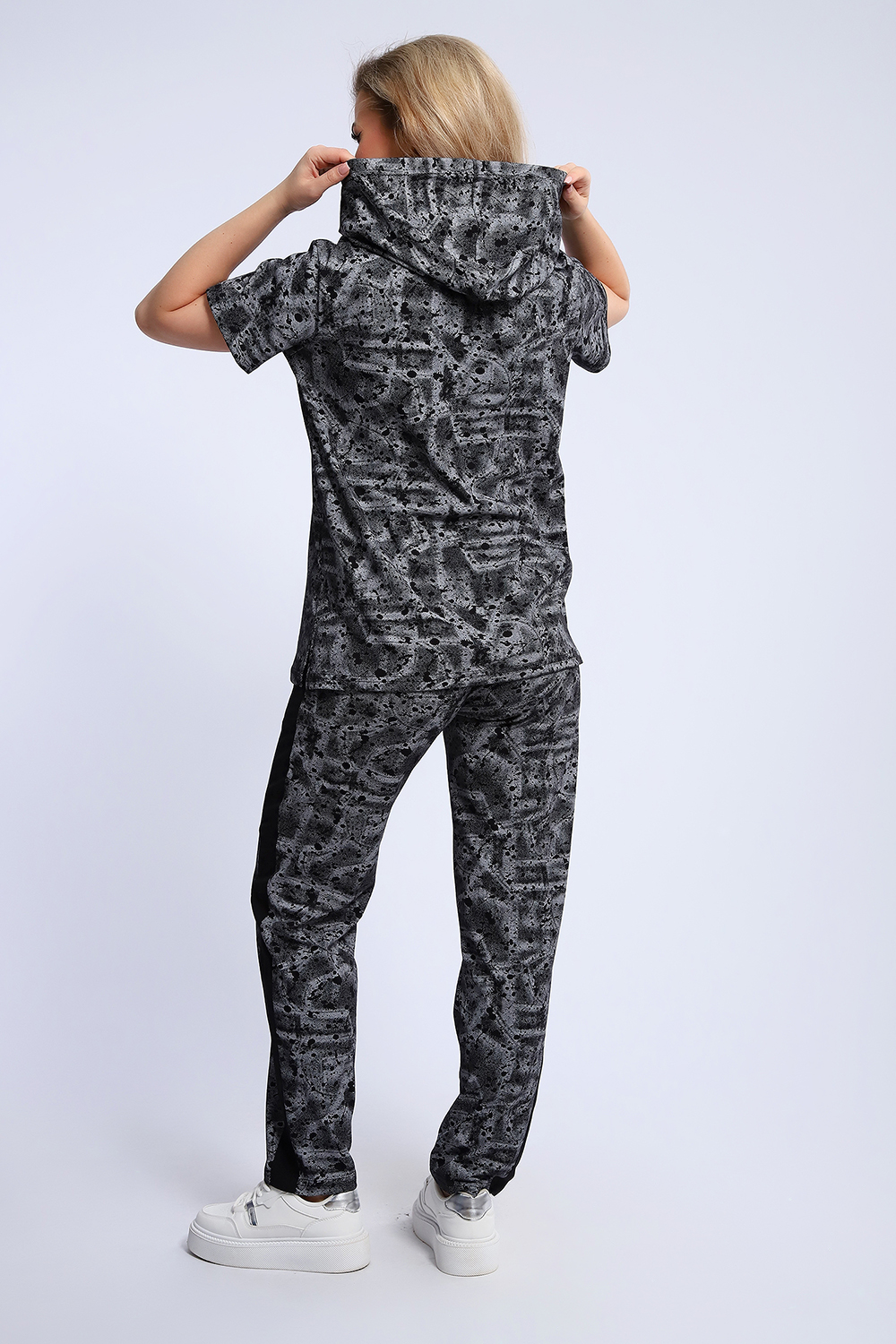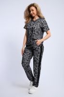 Стильный костюм из легкой дышащей ткани, имитирующей расцветкой рисунок на коже ящерицы. Дополнительно полочка кофты декорирована контрастной надписью и капюшоном с изящной лентой, регулирующей объем. Этот универсальный и практичный повседневный костюм в спортивном стиле будет удобным и комфортным во многих ситуациях. Комплект отлично подойдет для спорта, бега или танцев. Брюки свободные с яркими лампасами, двумя боковыми карманами, на широком поясе с резинкой. Каждую вещь вполне можно использовать по отдельности. Комплект отлично подойдет для женщин любого возраста и поможет хозяйке выглядеть стильно, при этом даря чувство комфорта!