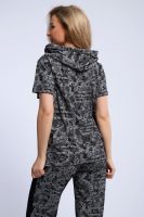 Стильный костюм из легкой дышащей ткани, имитирующей расцветкой рисунок на коже ящерицы. Дополнительно полочка кофты декорирована контрастной надписью и капюшоном с изящной лентой, регулирующей объем. Этот универсальный и практичный повседневный костюм в спортивном стиле будет удобным и комфортным во многих ситуациях. Комплект отлично подойдет для спорта, бега или танцев. Брюки свободные с яркими лампасами, двумя боковыми карманами, на широком поясе с резинкой. Каждую вещь вполне можно использовать по отдельности. Комплект отлично подойдет для женщин любого возраста и поможет хозяйке выглядеть стильно, при этом даря чувство комфорта!