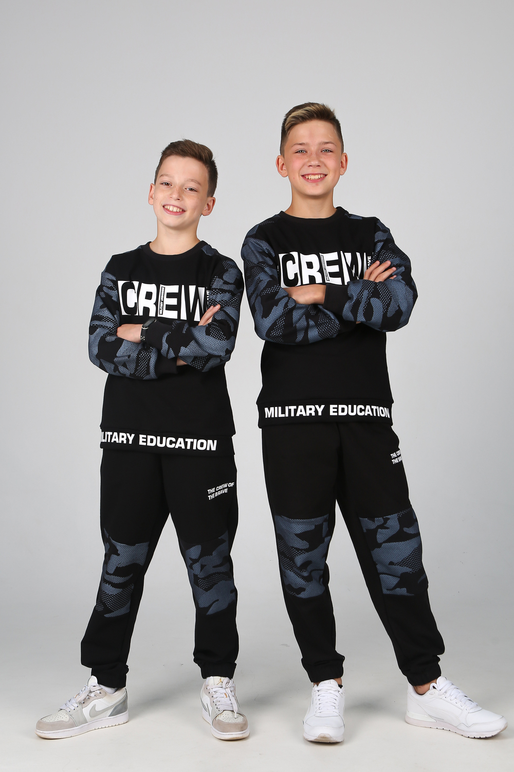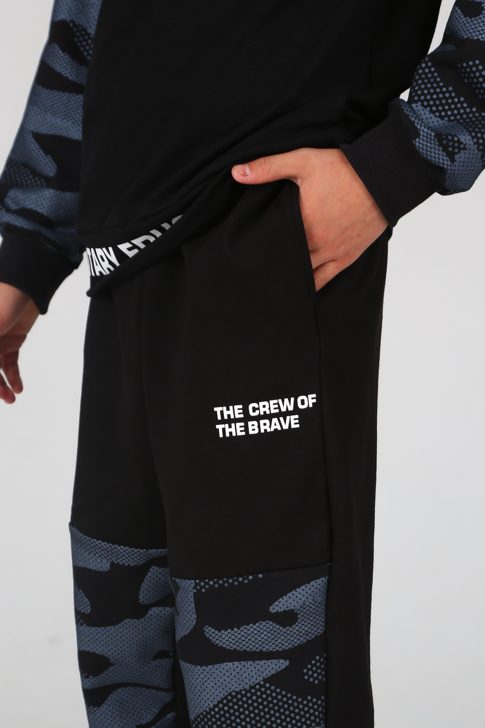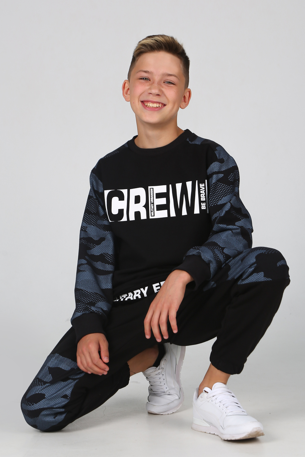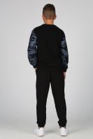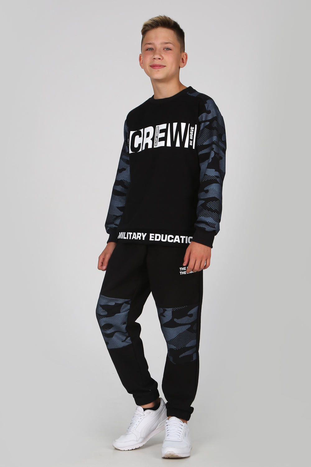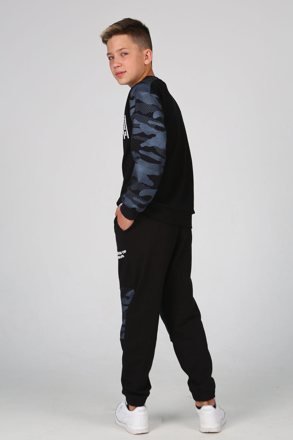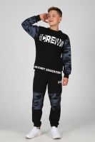 Замечательный комплект из комбинированного трикотажа, состоит из свитшота и джоггеров. Свитшот прямого кроя, круглый вырез горловины, длинный рукав с эластичным манжетом, с яркими текстовыми принтами на полочке и поясе. Джоггеры с боковыми карманами, цельнокроеным поясом и манжетом с вшитой внутри резинкой, на передней половинке текстовый принт.