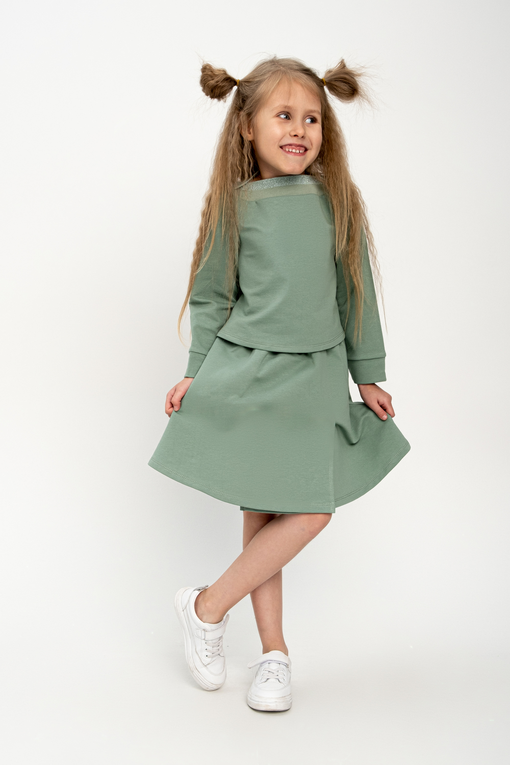 Костюм из мягкого футера. Свитшот с прямыми рукавами, ворот отделан подвязом в тон, юбка свободного края с запахом. Футер двунитка качество пенье. Лёгкий в уходе. При стирке не линяет, не деформируется, не закатывается