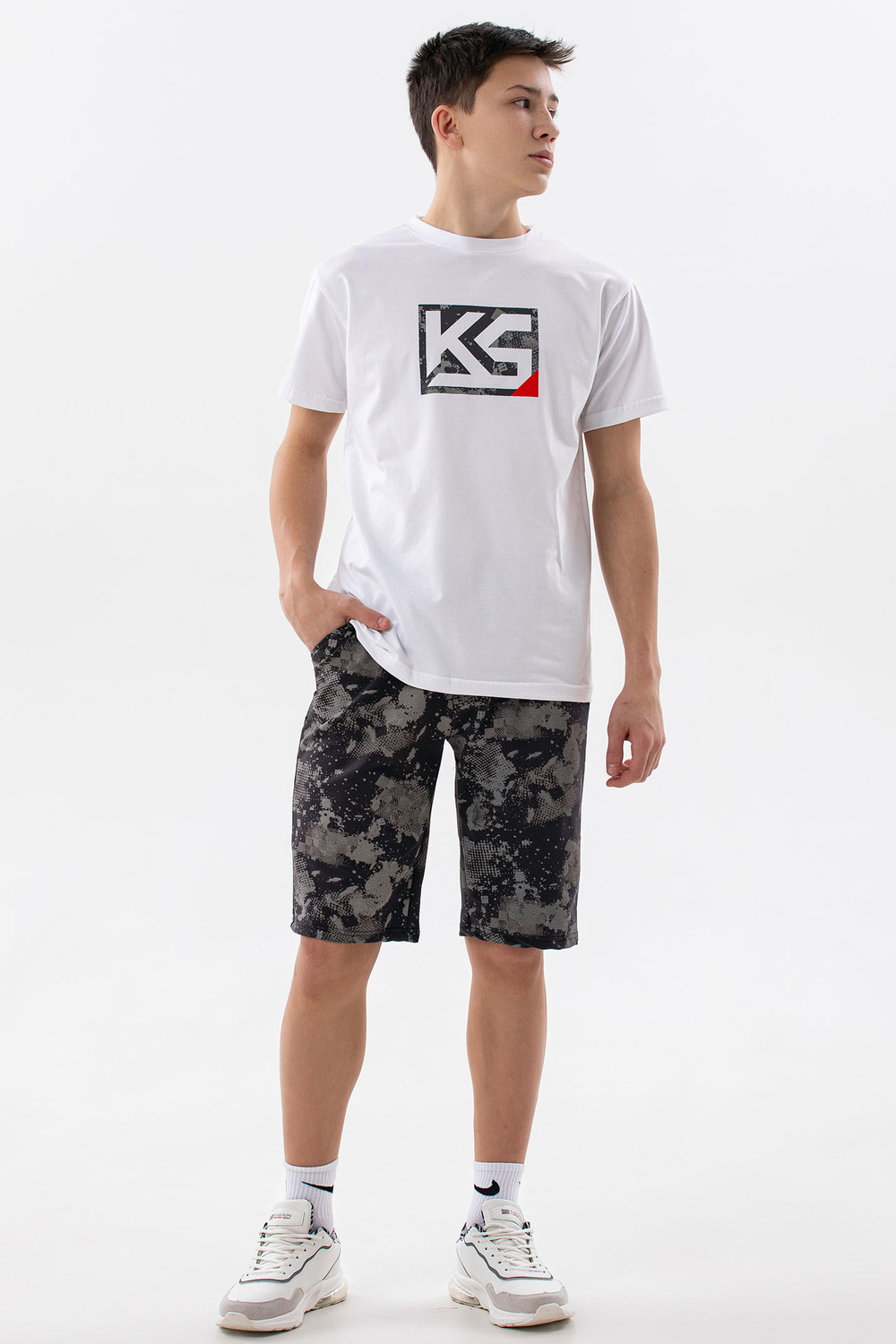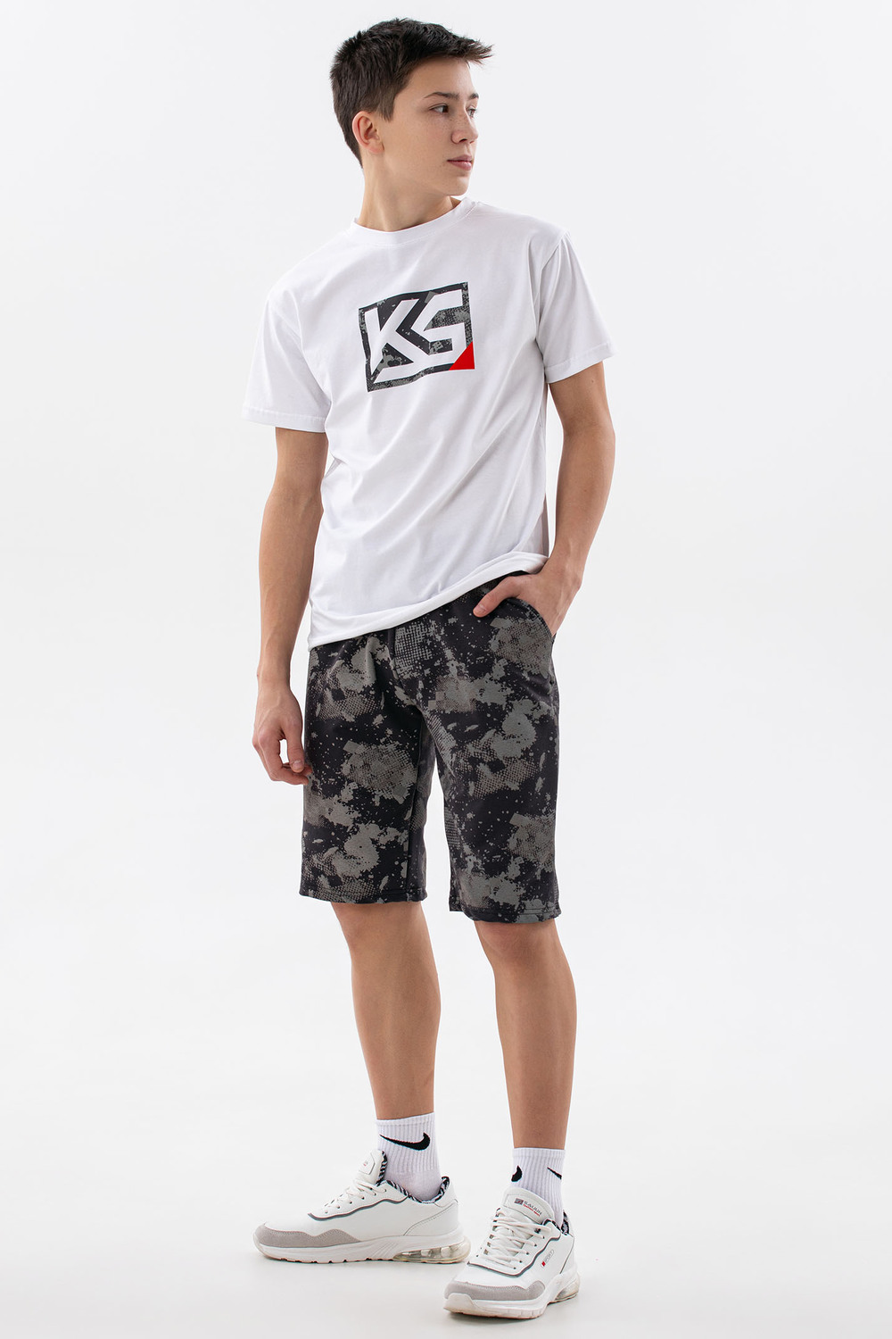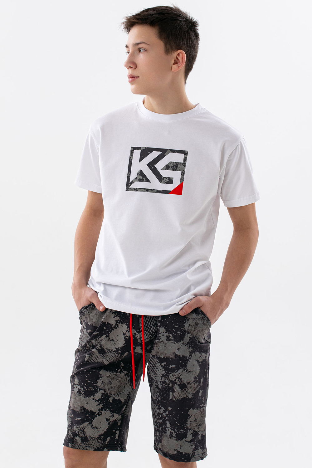 Костюм для подростков состоит из двух изделий - футболки и шорт. Футболка выполнена из ткани с абстрактным принтом. Футболка прямого свободного кроя, круглый вырез горловины, втачной рукав. Шорты выполнены из футера 2-х нитки, прямого кроя, с удобной посадкой. С боковыми карманами и красным шнурком.