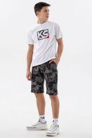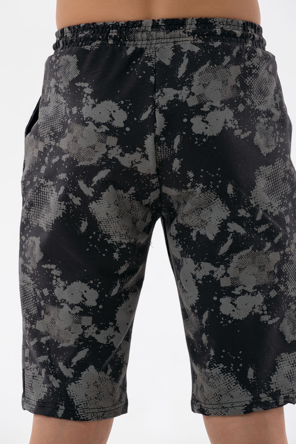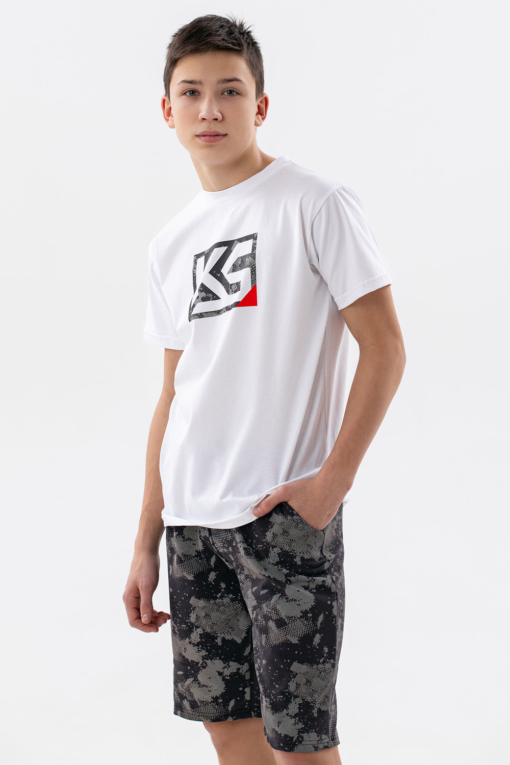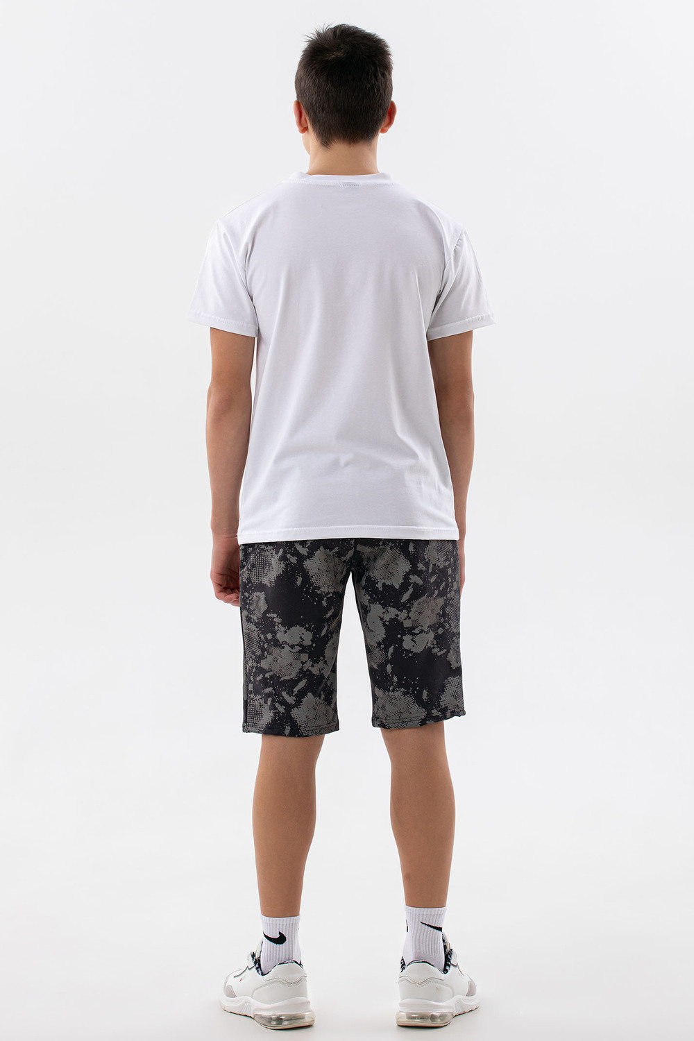 Костюм для подростков состоит из двух изделий - футболки и шорт. Футболка выполнена из ткани с абстрактным принтом. Футболка прямого свободного кроя, круглый вырез горловины, втачной рукав. Шорты выполнены из футера 2-х нитки, прямого кроя, с удобной посадкой. С боковыми карманами и красным шнурком.