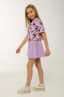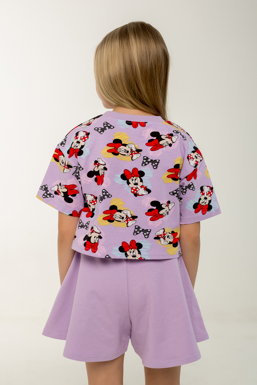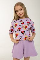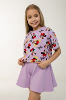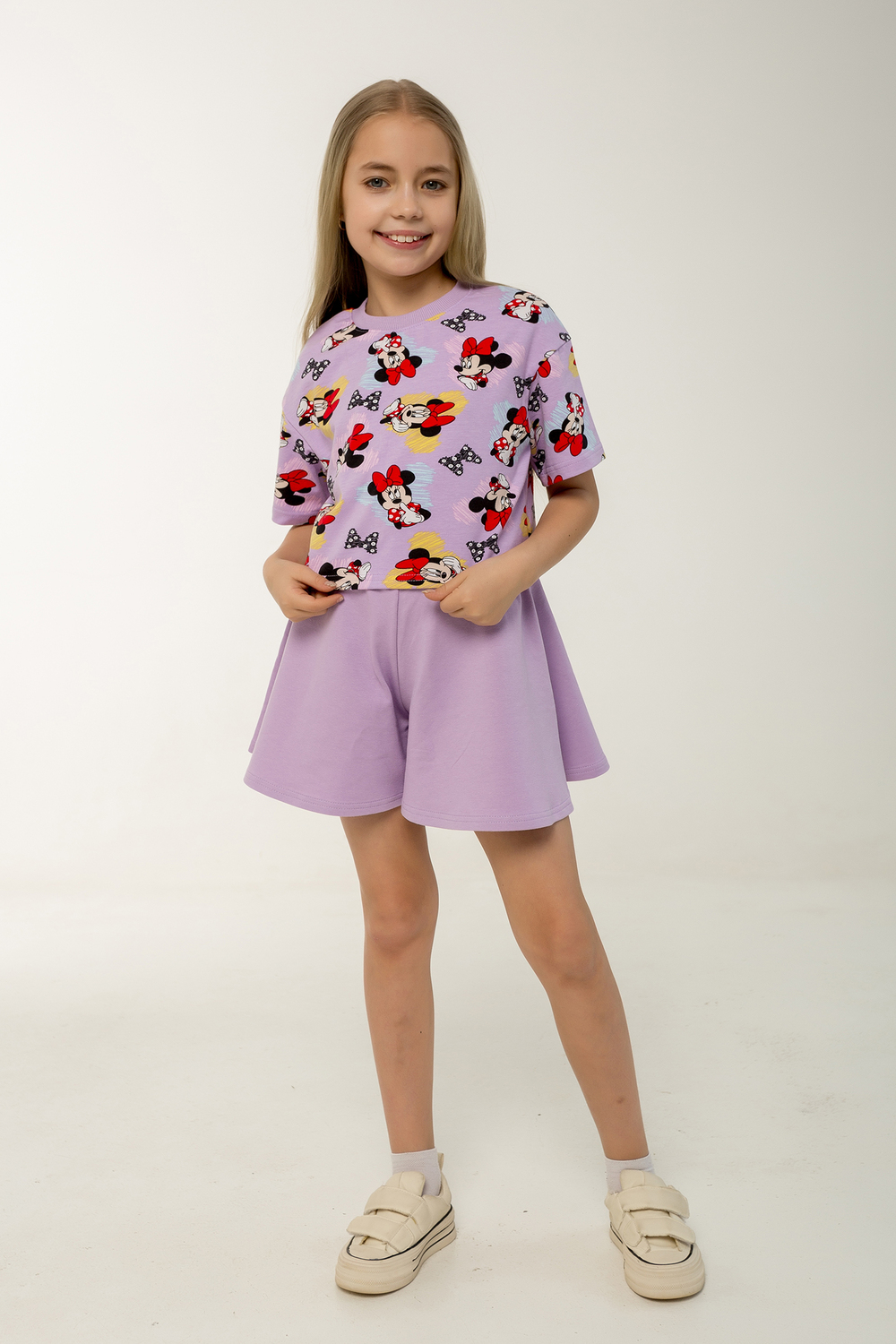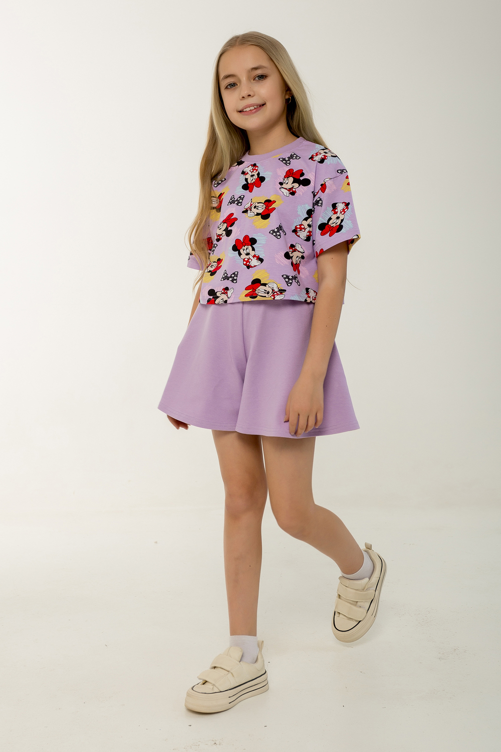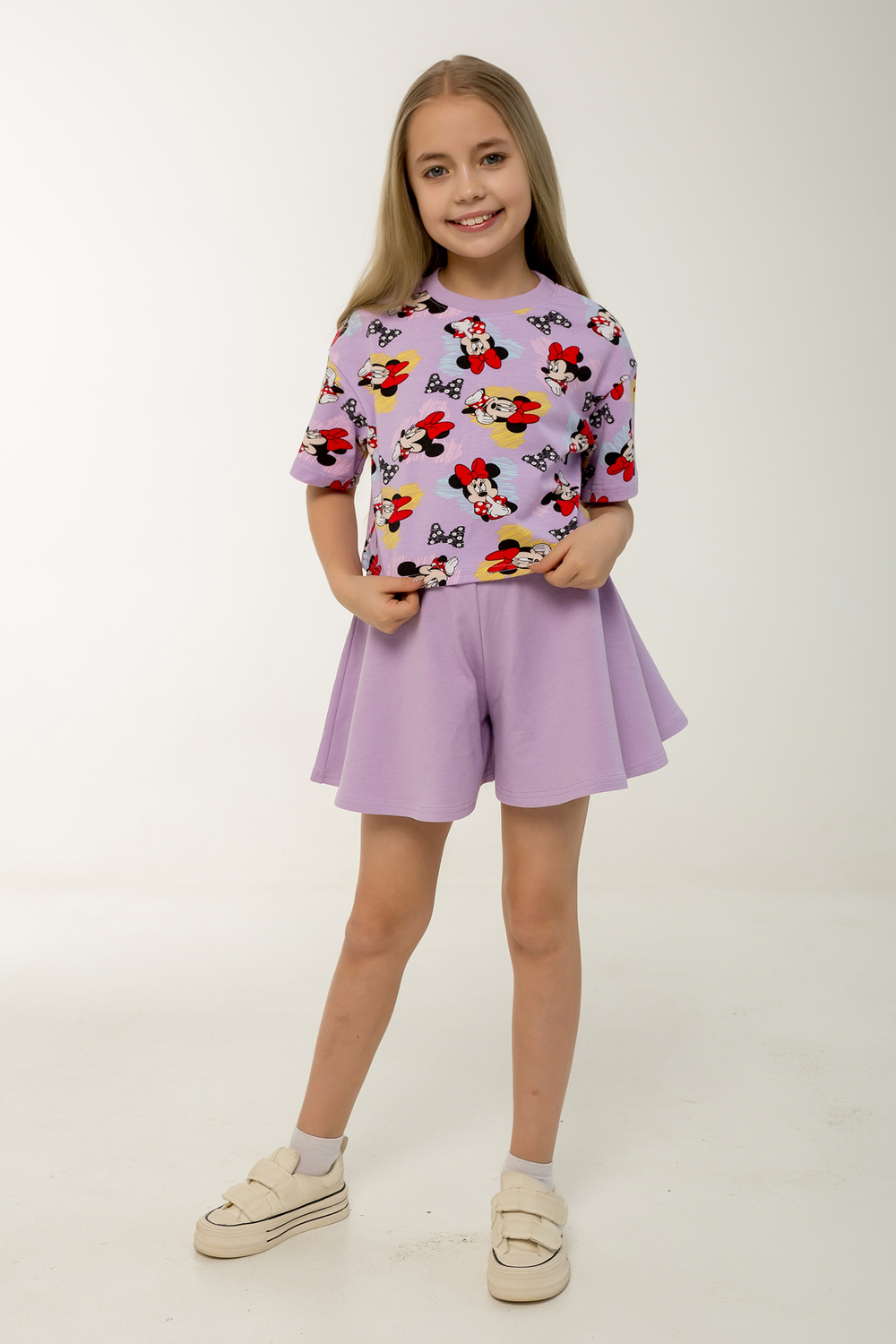 Этот яркий и стильный костюм станет отличным выбором для жаркого лета! Комплект включает укороченный топик свободного кроя с короткими рукавами и шорты-юбку трапециевидного силуэта на поясе с резинкой. Топик выполнен в насыщенном сиреневом оттенке с забавным рисунком любимого персонажа — Минни Маус. Шорты-юбка изготовлены из однотонной ткани в тон основного цвета комплекта, что создает гармоничный и законченный образ. Оба элемента костюма сделаны из петельчатого фетера, который прекрасно дышит и обеспечивает комфорт даже в самые жаркие дни. Такой комплект идеально подойдет для повседневных прогулок, отдыха на пляже, а также для детского сада. Каждый элемент можно носить отдельно, сочетая с другой одеждой и создавая новые интересные образы. Костюм сертифицирован и произведен на фабрике "Мариша", известной своим высоким качеством продукции.