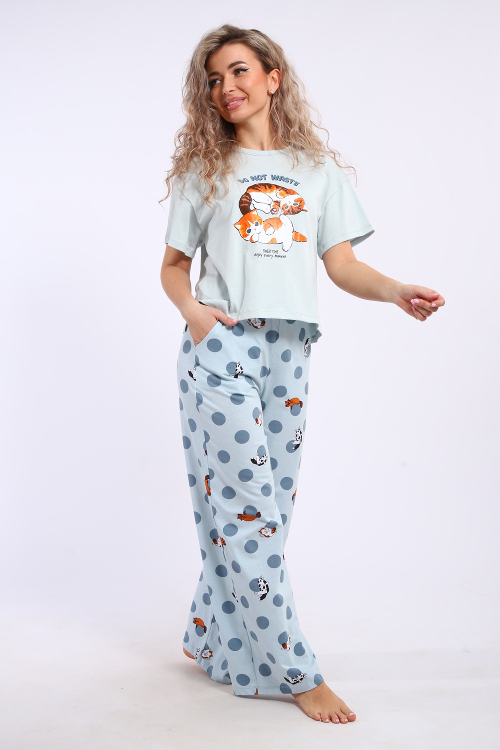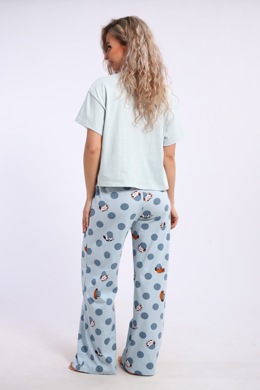 Красивый женский костюм двойка от ивановского производителя состоит из футболки и брюк в стиле палаццо. Этот стильный домашний комплект выполнен из мягкого и приятного на ощупь трикотажного материала из 100% хлопка. Он идеально подойдет для осеннего и весеннего сезонов. Эта женская пижама с брюками кюлотами сочетает женственность и удобство. Отличный выбор для повседневного использования дома и сна. Брюки клеш придают образу особый шарм и делают костюм популярным среди молодежи и подростков. Благодаря широким брюкам, пижама выглядит модно и трендово. Этот ночной комплект предлагается в нескольких размерах, включая большие размеры, и подходит стройным девушкам и женщинам, а также полным дамам plus size. Благодаря свободному крою и удобным брюкам трубам, он также идеально подойдет для беременных женщин, давая им свободу движения и комфорт в домашних условиях. Хлопковая пижама изготовлена из качественного турецкого трикотажа (кулирка), который приятен к телу и обеспечивает комфорт во время ночного отдыха. Она подойдет для любого времени года, особенно на осень, весну, зиму. Этот удобный и стильный комплект пижамы с брюками станет отличным выбором для роддома, повседневного отдыха дома или даже для новогодней фотосессии и пижамной вечеринки. Сочетание комфорта, красоты и функциональности делает эту пижаму невероятно привлекательной. Домашний костюм, пижама - это прекрасный подарок себе, маме, сестре, бабушке, жене на новый год, день рождения или без повода.