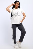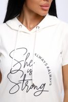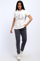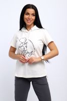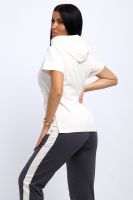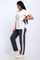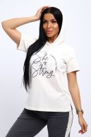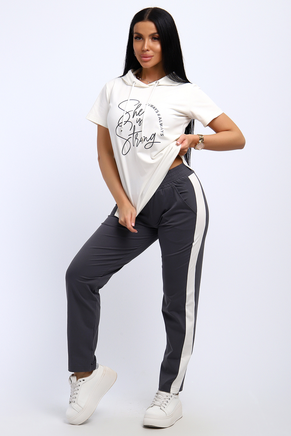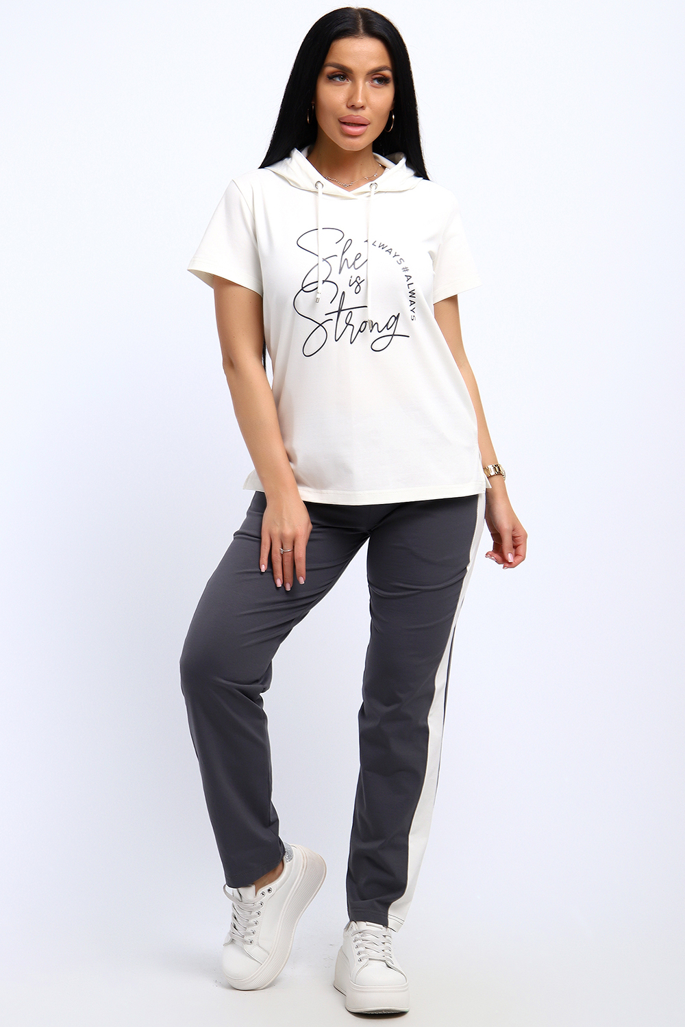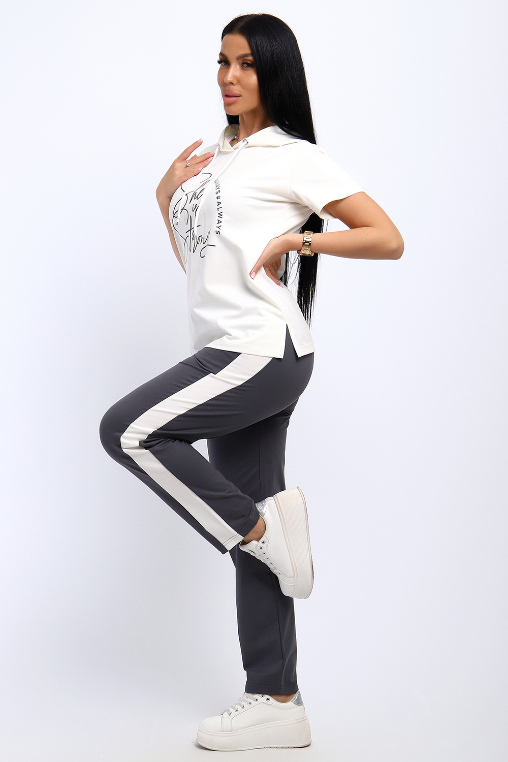 Удобный, женственный трикотажный костюм со спортивной ноткой подарит вам чувство комфорта и позволит выглядеть сногсшибательно в любой ситуации! Костюм прекрасно подойдет для занятий спортом, пробежек или прогулок! Кофта белого цвета, с надписью латинскими буквами в цвет брюк, имеет капюшон, способный защитить волосы от солнечных лучей, ветра или дождя. Объем капюшона регулирует изящный шнурок. На брюках имеются лампасы белого цвета, гармонирующие с цветом кофты.