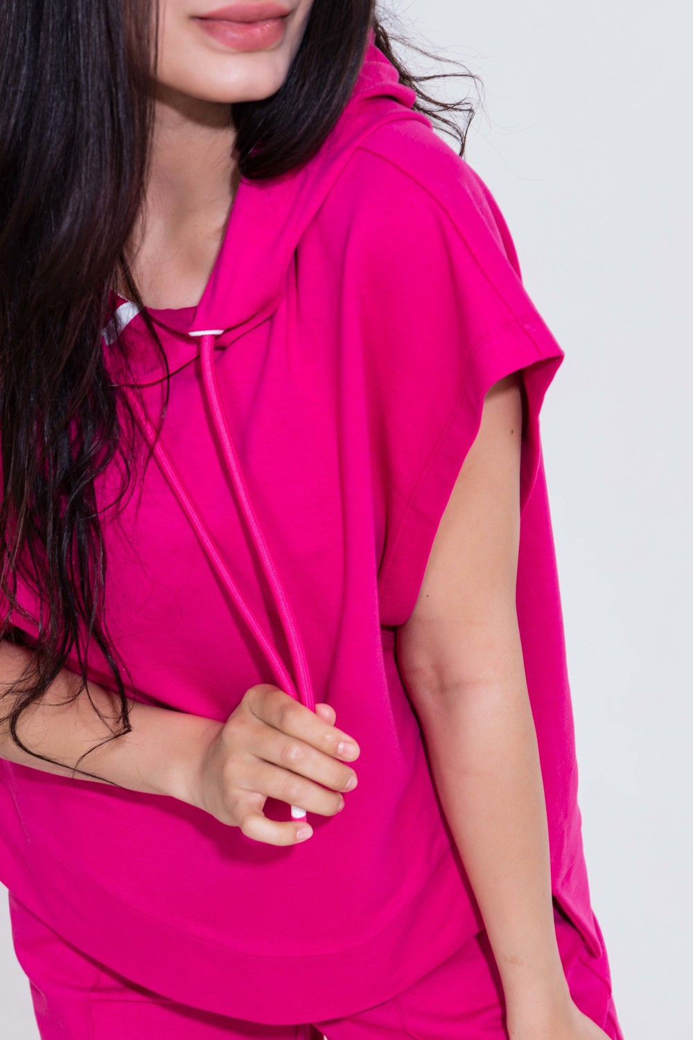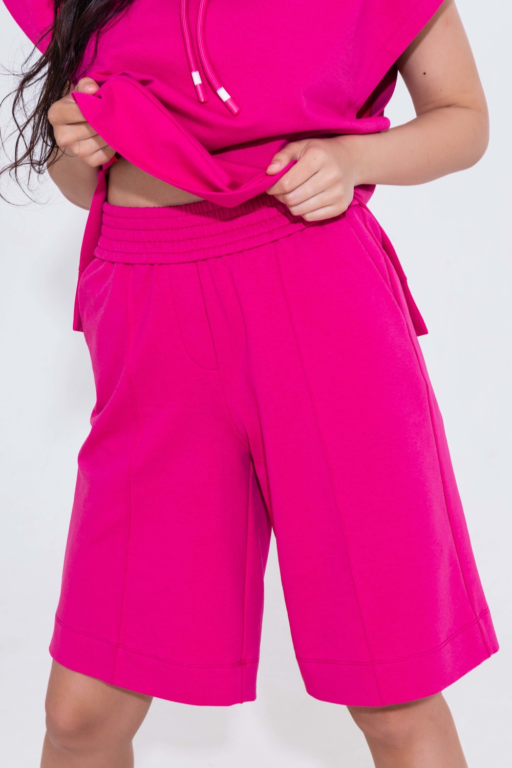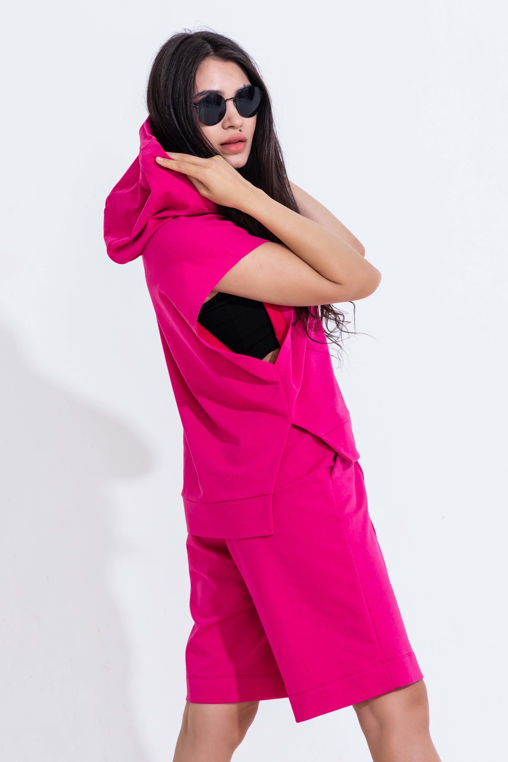 Новый летний дизайнерский костюм в спортивном стиле. Костюм для базового гардероба стильной современной девушки. Отличное решение на каждый день, для прогулок, отдыха, путешествий, поездок на море и пикника, для шоппинга. Для любого возраста и телосложения. Комфортный и женственный фасон - укороченная «жилетка-худи» свободного кроя, шорты с карманами, удобным поясом-резинкой, подчеркивающим талию, высокой посадкой и прямого кроя. В капюшон жилетки вставлен шнурок, который придает дополнительную стильность костюму. Ткань легко гладится, приятная на ощупь. Во время носки костюм сохраняет форму, не мнется. Трикотажный костюм — это удобно и практично. Вам не надо думать, что надеть, у Вас всегда есть в шкафу уже готовый модный образ. Шорты и «жилетку-худи» можно носить по отдельности. "Жилетку-худи" рекомендуем носить с топом