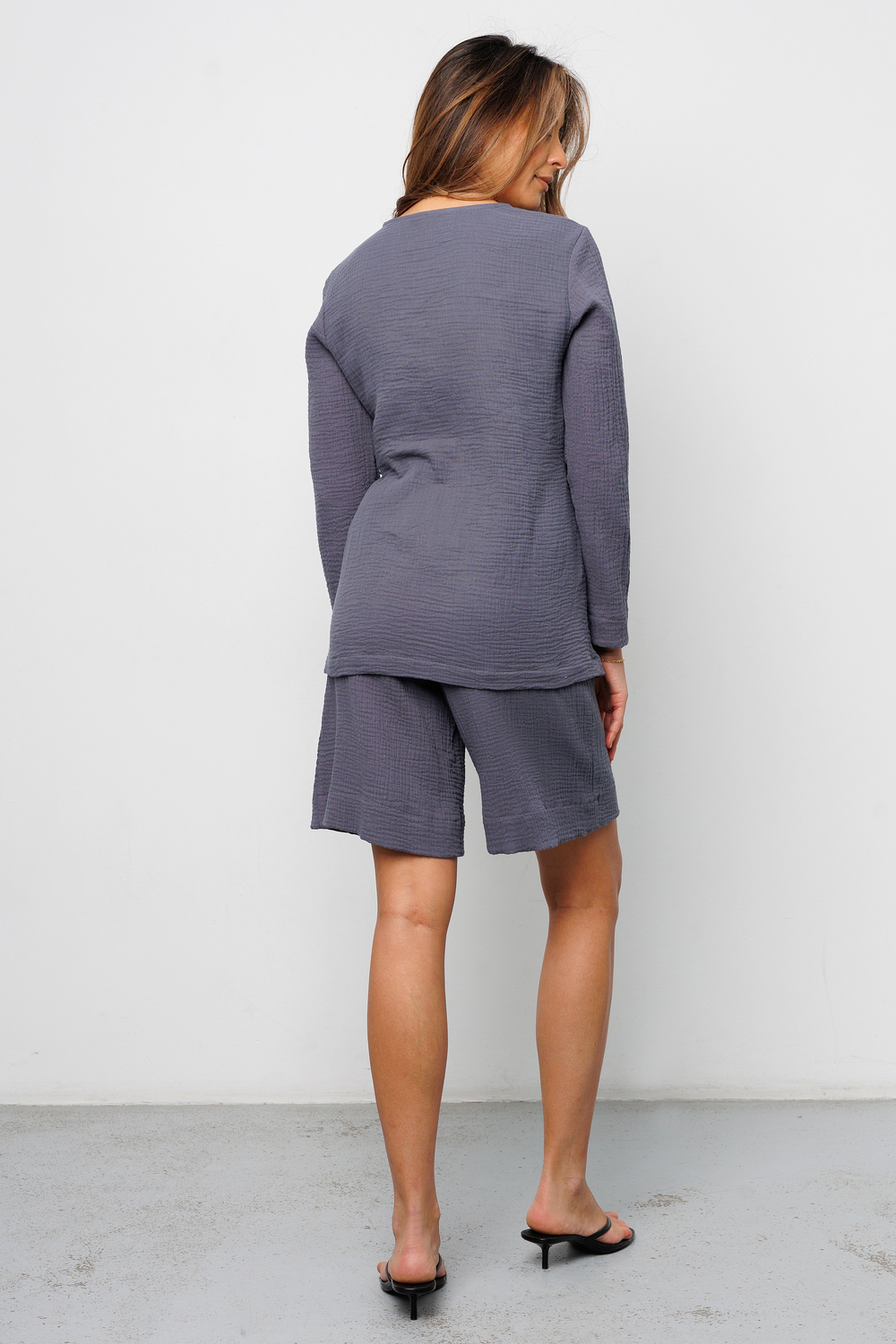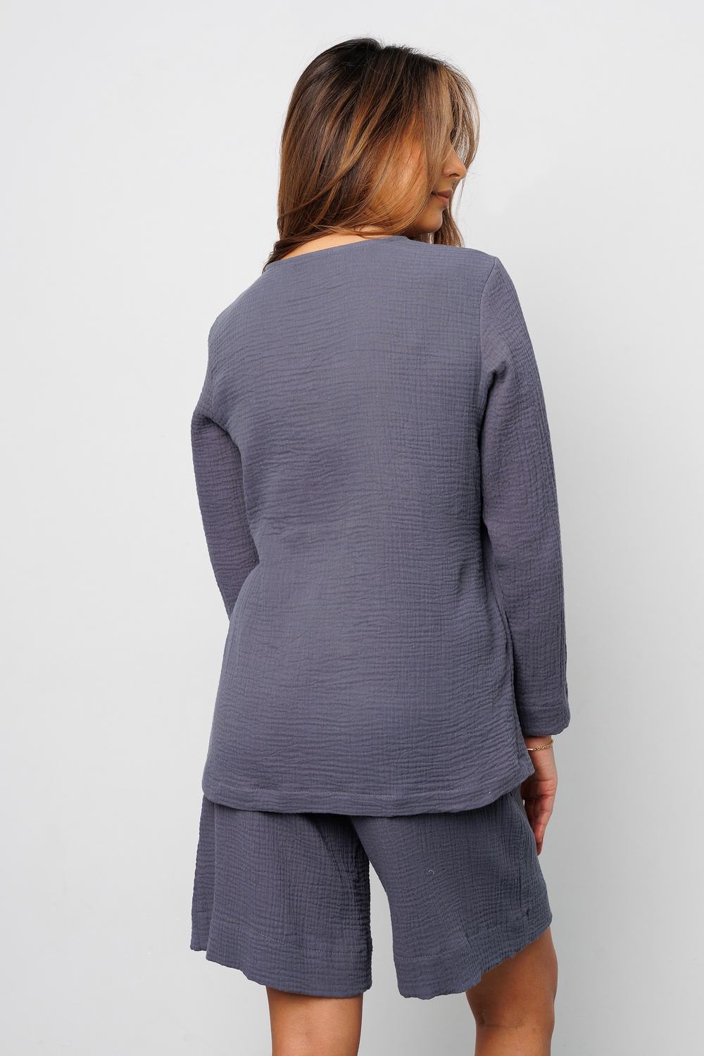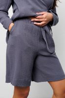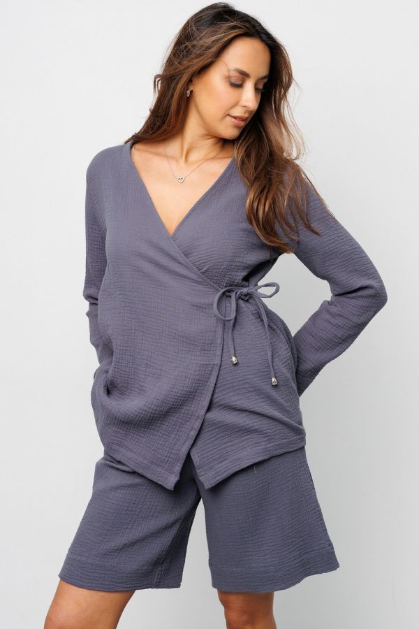 Представляем Вам стильный летний костюм двойка от Raposa, созданный для тех, кто ценит качество и элегантность. Этот муслиновый наряд станет вашим любимцем в жаркие дни! Он сшит из 100% хлопок, что делает его невероятно мягким, дышащим и приятным к телу. Пижамный костюм состоит из рубашки на запах с длинными рукавами и шортами бриджами, которые обеспечивают свободу движений и комфорт в любое время суток. Благодаря высокой посадке и свободному крою, этот костюм из муслина подойдет для полных женщин плюс сайз больших размеров до 54 и 56 и для беременных. Пляжный костюм можно носить как дома, так и на прогулке или наряд на фотосессию, на пижамную вечеринку. Однотонный дизайн в нежном сером цвете, позволяет легко комбинировать костюм женский с другими вещами, создавая разнообразные образы. Кофта на завязках позволяет регулировать посадку по фигуре, а прорезные карманы на бермудах добавляют практичности. Этот костюм с шортами - идеальный выбор для тех, кто ищет удобную, красивую и универсальную одежду на лето и весну 2025. Костюм кимоно станет прекрасным подарком девушке, для девочки подростка. Легкий и воздушный хлопковый костюм подарит Вам ощущение прохлады даже в самую жаркую погоду. Его можно носить как пижаму или как стильный домашний костюм. А благодаря своей универсальности и модели оверсайз, костюм с широкими штанами прекрасно подойдет для отдыха на природе, прогулок по городу или просто для времяпрепровождения дома.