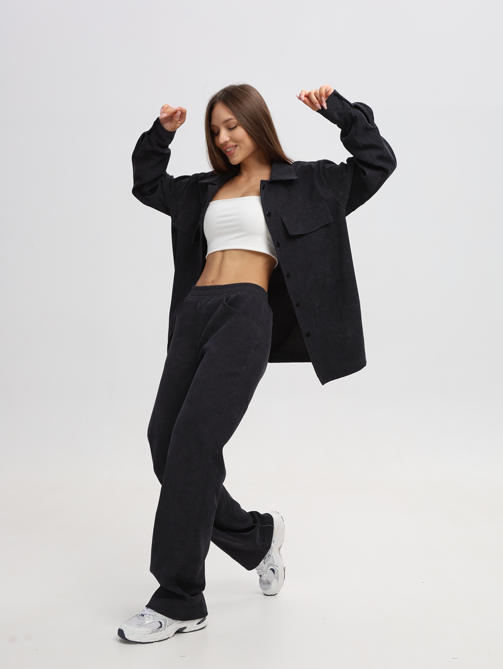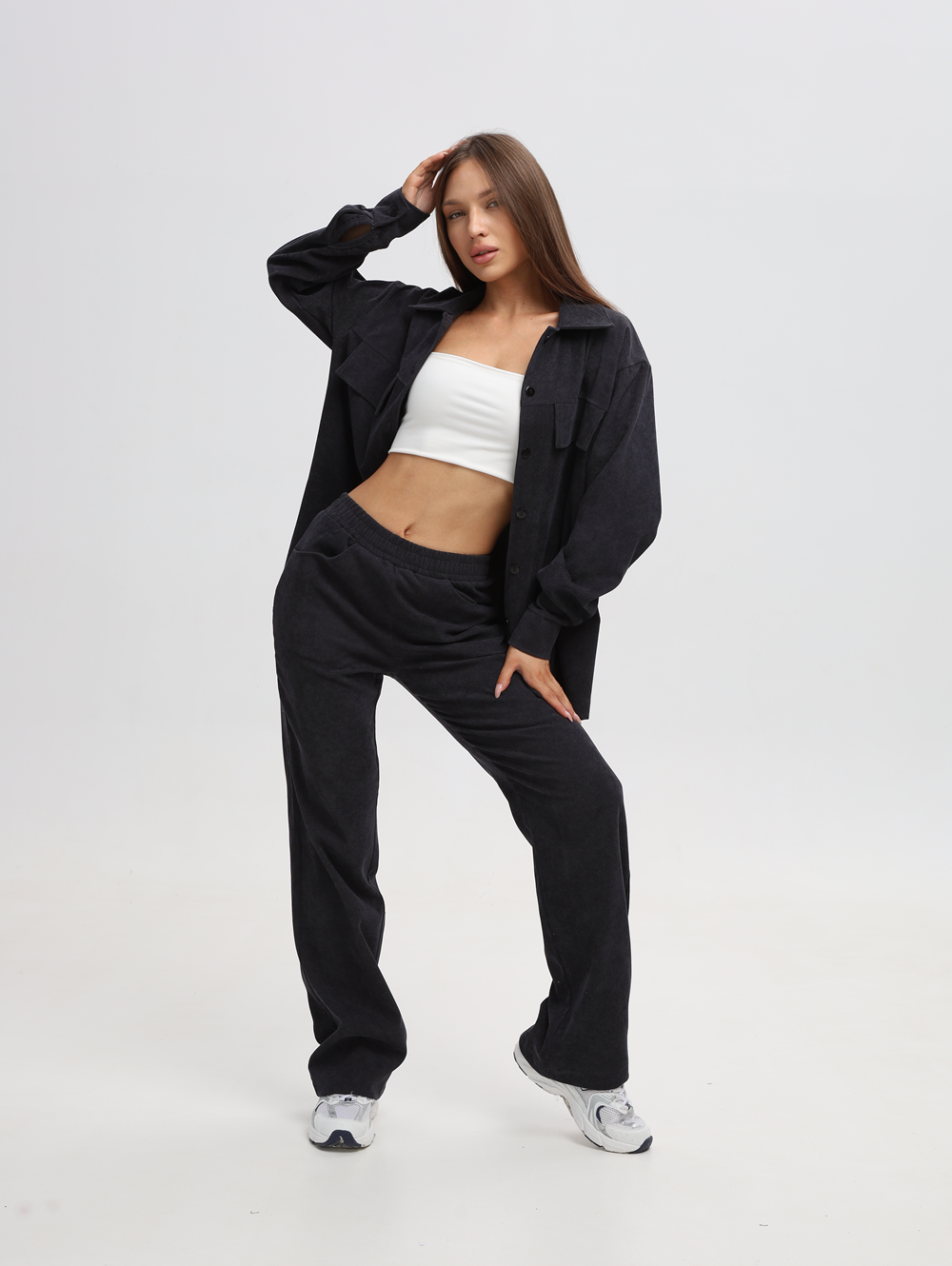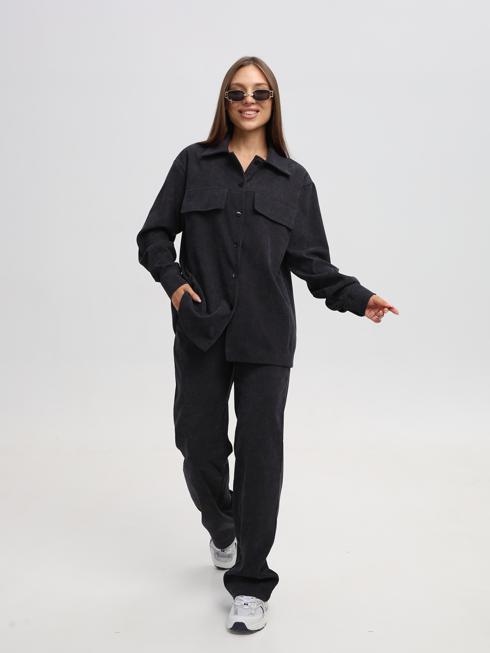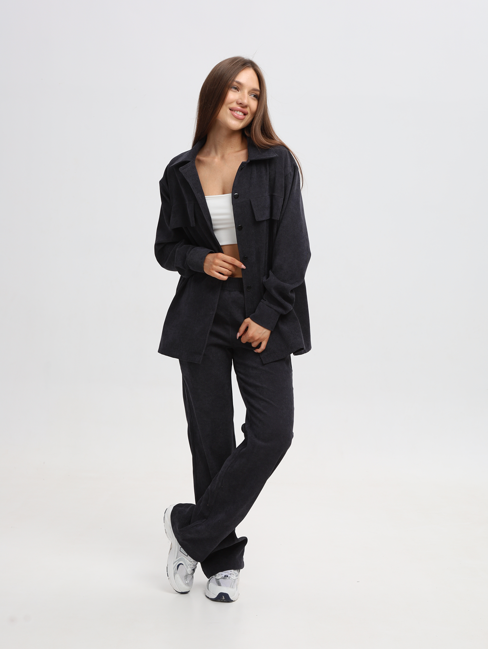 Спортивный женский костюм выполнен из мягкого вельветового материала, который придает ему модный и элегантный вид. Костюм для женщин состоит из рубашки оверсайз и брюк прямого кроя, создающих гармоничный и современный образ. Однотонный оттенок делает его универсальным для разных случаев — от повседневных прогулок до офисного или делового стиля. Рубашка свободного фасона с длинными рукавами украшена классическим воротником и застегивается на пуговицы. Вельвет обладает приятной текстурой, которая сохраняет комфорт даже при длительном ношении. Брюки имеют удобные карманы, прямой силуэт, что делает их подходящими для девушек и женщин разных возрастов. Эластичный пояс обеспечивает удобную посадку, а продуманная длина визуально вытягивает силуэт. Удобная и трендовая одежда в современном стиле, которая дополнит базовые и спортивные образы или молодежный лук в стиле casual (кэжуал). Нарядный костюм отлично подойдет как для осенних прохладных дней, так и для создания стильных летних образов. Женский костюм-двойка отличается универсальностью благодаря сочетанию комфорта и модного дизайна. Он может использоваться как спортивный наряд для активного отдыха или домашний вариант для уюта в холодное время года. Актуальный oversize крой подчеркивает современные тенденции в мире моды.