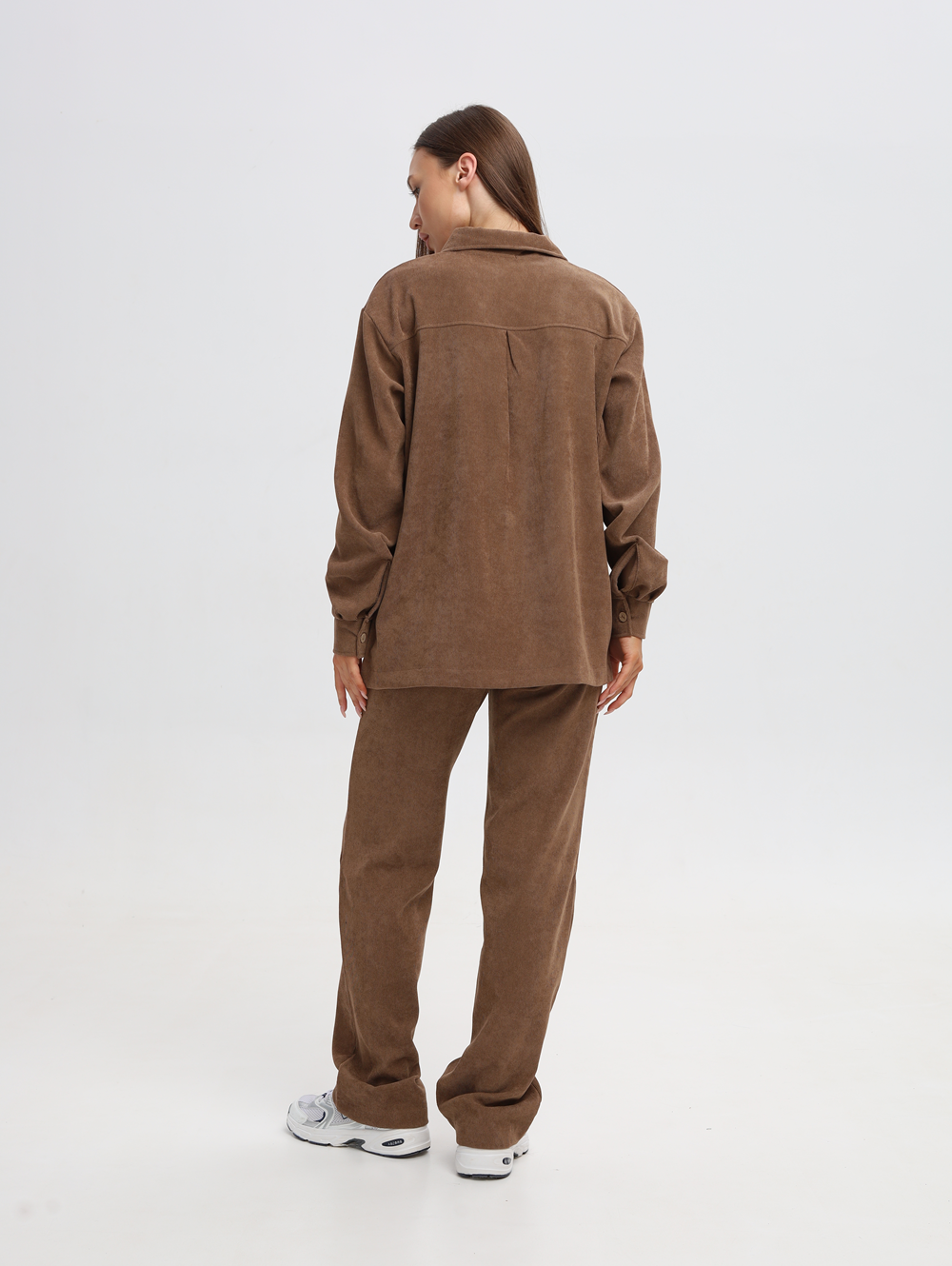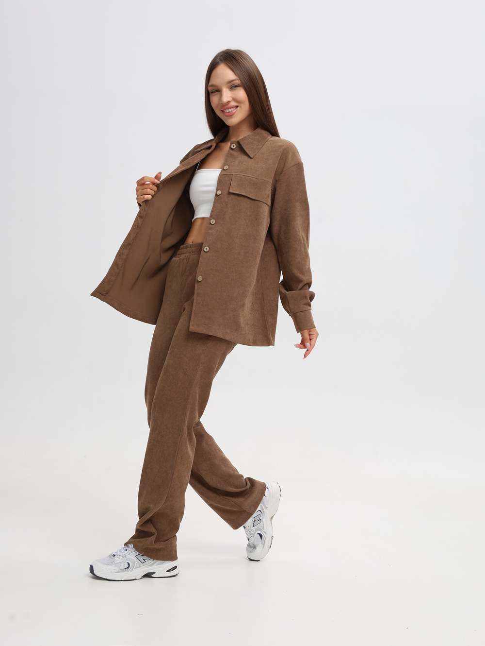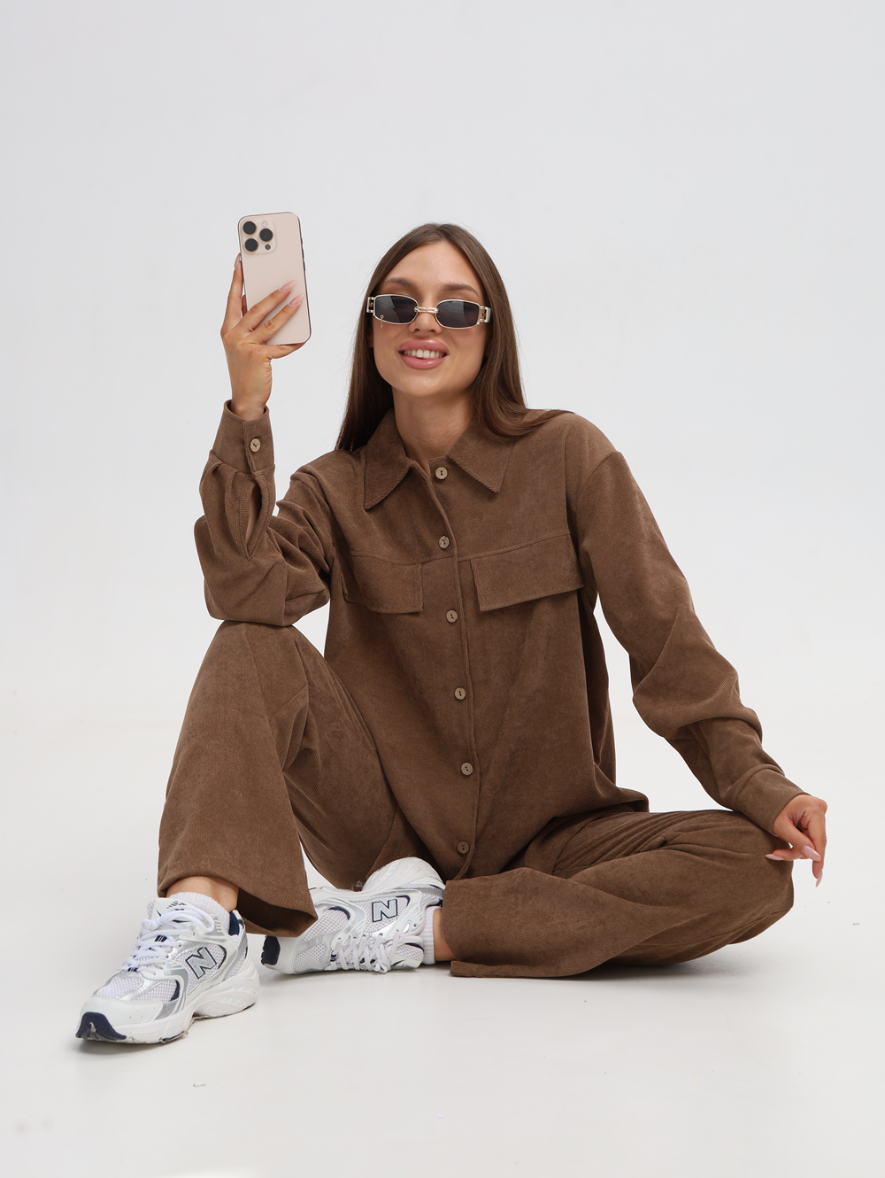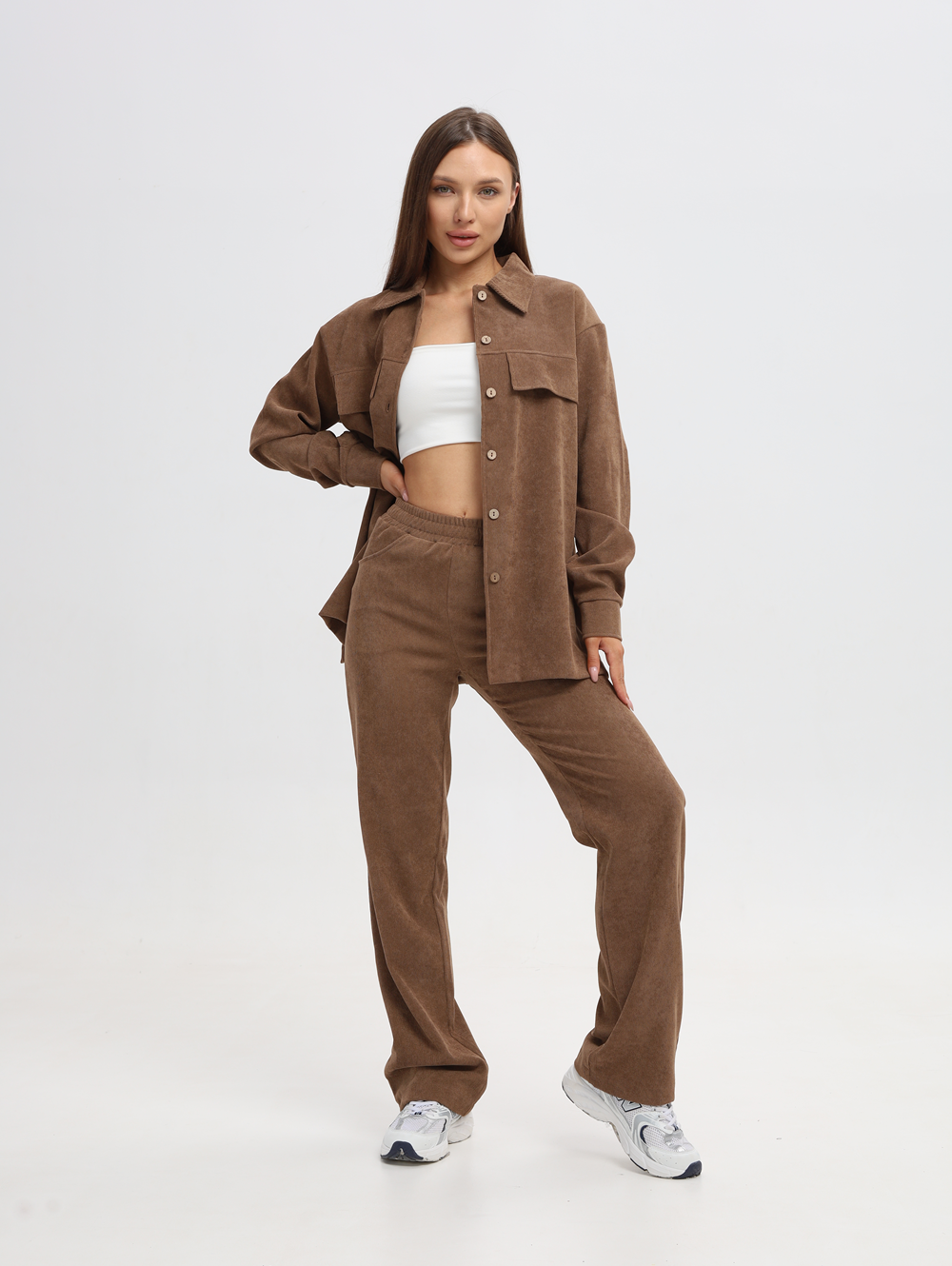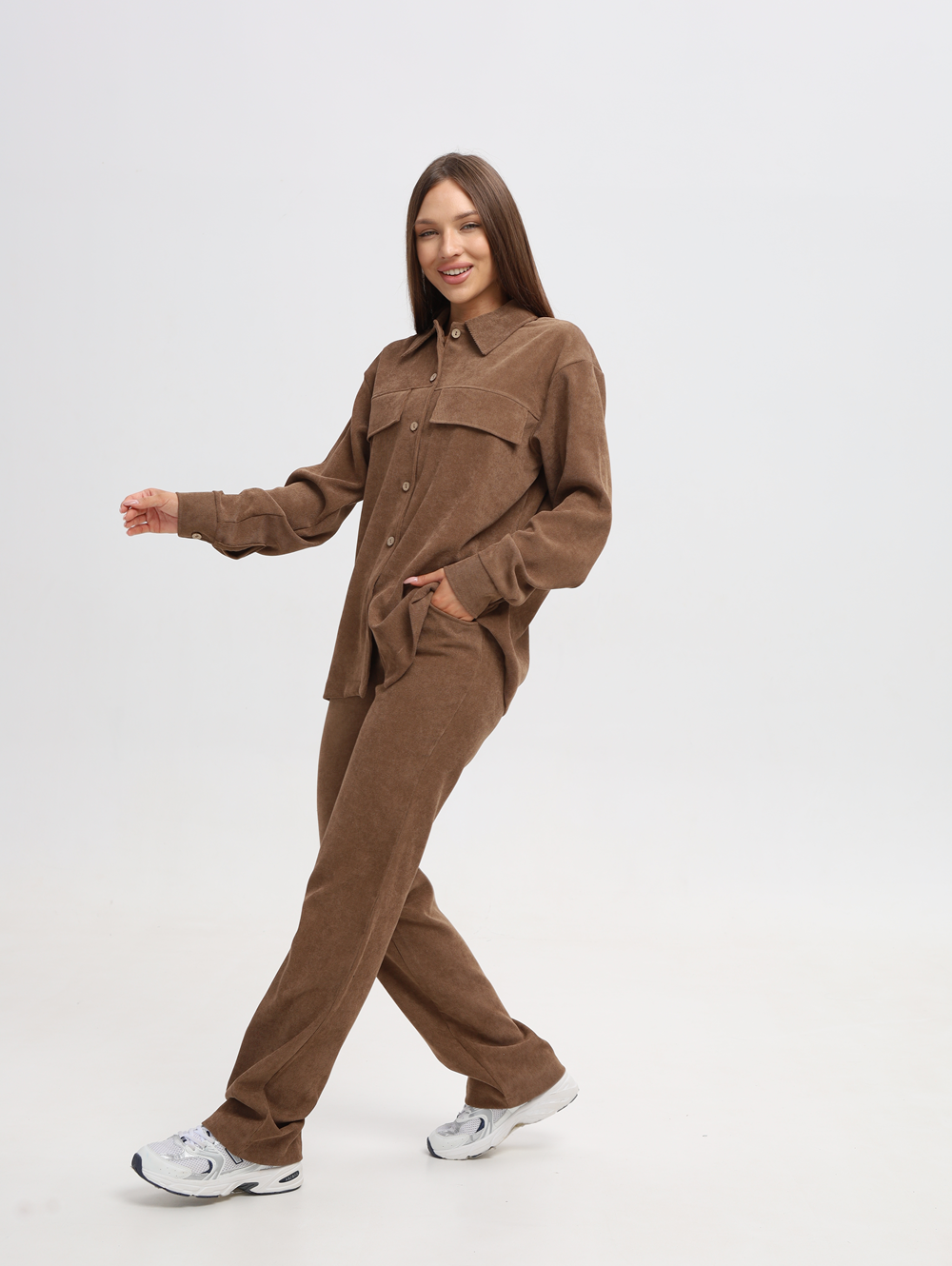 Спортивный женский костюм выполнен из мягкого вельветового материала, который придает ему модный и элегантный вид. Костюм для женщин состоит из рубашки оверсайз и брюк прямого кроя, создающих гармоничный и современный образ. Однотонный оттенок делает его универсальным для разных случаев — от повседневных прогулок до офисного или делового стиля. Рубашка свободного фасона с длинными рукавами украшена классическим воротником и застегивается на пуговицы. Вельвет обладает приятной текстурой, которая сохраняет комфорт даже при длительном ношении. Брюки имеют удобные карманы, прямой силуэт, что делает их подходящими для девушек и женщин разных возрастов. Эластичный пояс обеспечивает удобную посадку, а продуманная длина визуально вытягивает силуэт. Удобная и трендовая одежда в современном стиле, которая дополнит базовые и спортивные образы или молодежный лук в стиле casual (кэжуал). Нарядный костюм отлично подойдет как для осенних прохладных дней, так и для создания стильных летних образов. Женский костюм-двойка отличается универсальностью благодаря сочетанию комфорта и модного дизайна. Он может использоваться как спортивный наряд для активного отдыха или домашний вариант для уюта в холодное время года. Актуальный oversize крой подчеркивает современные тенденции в мире моды.