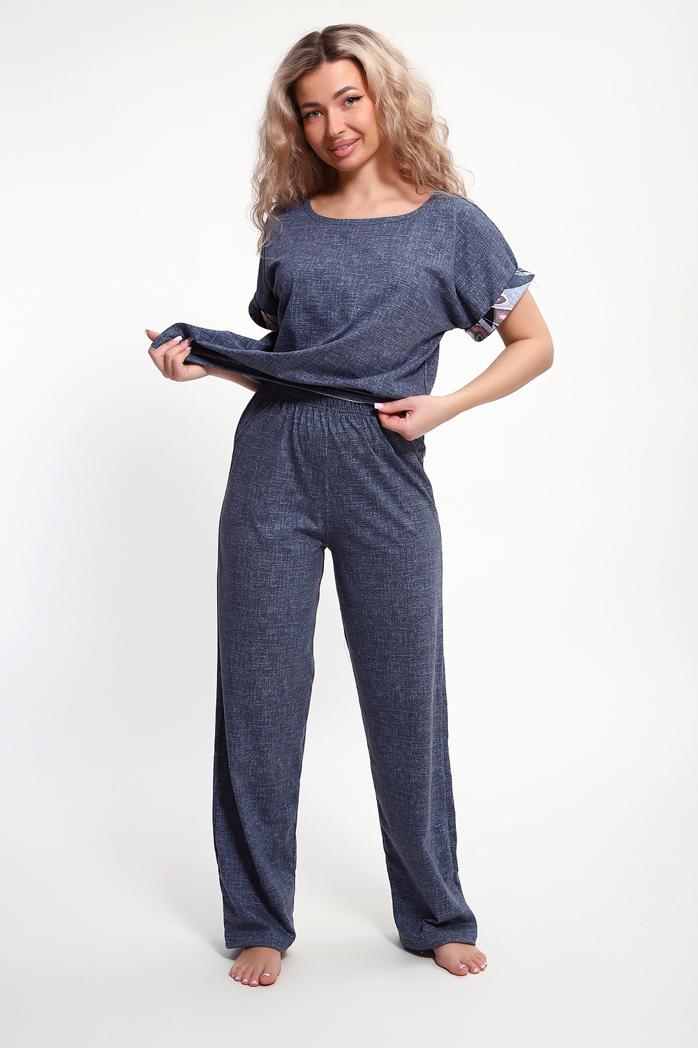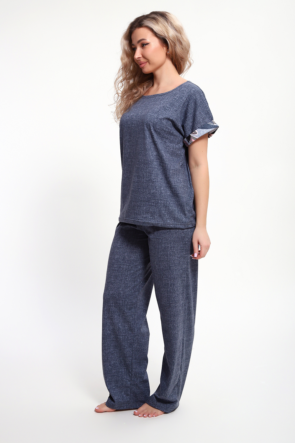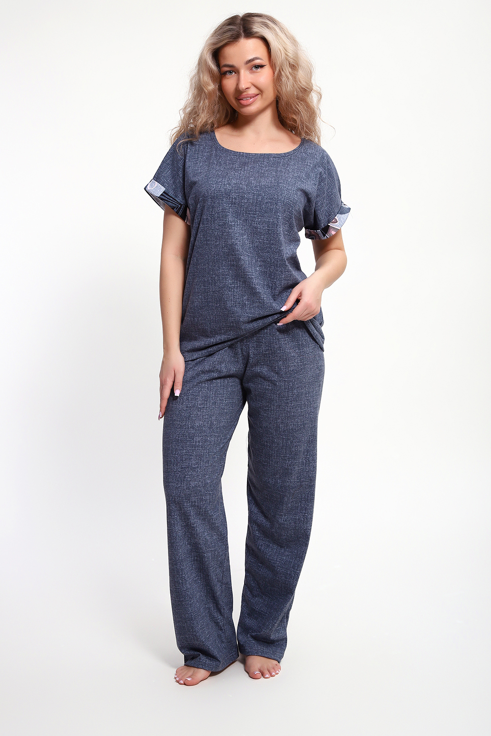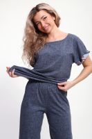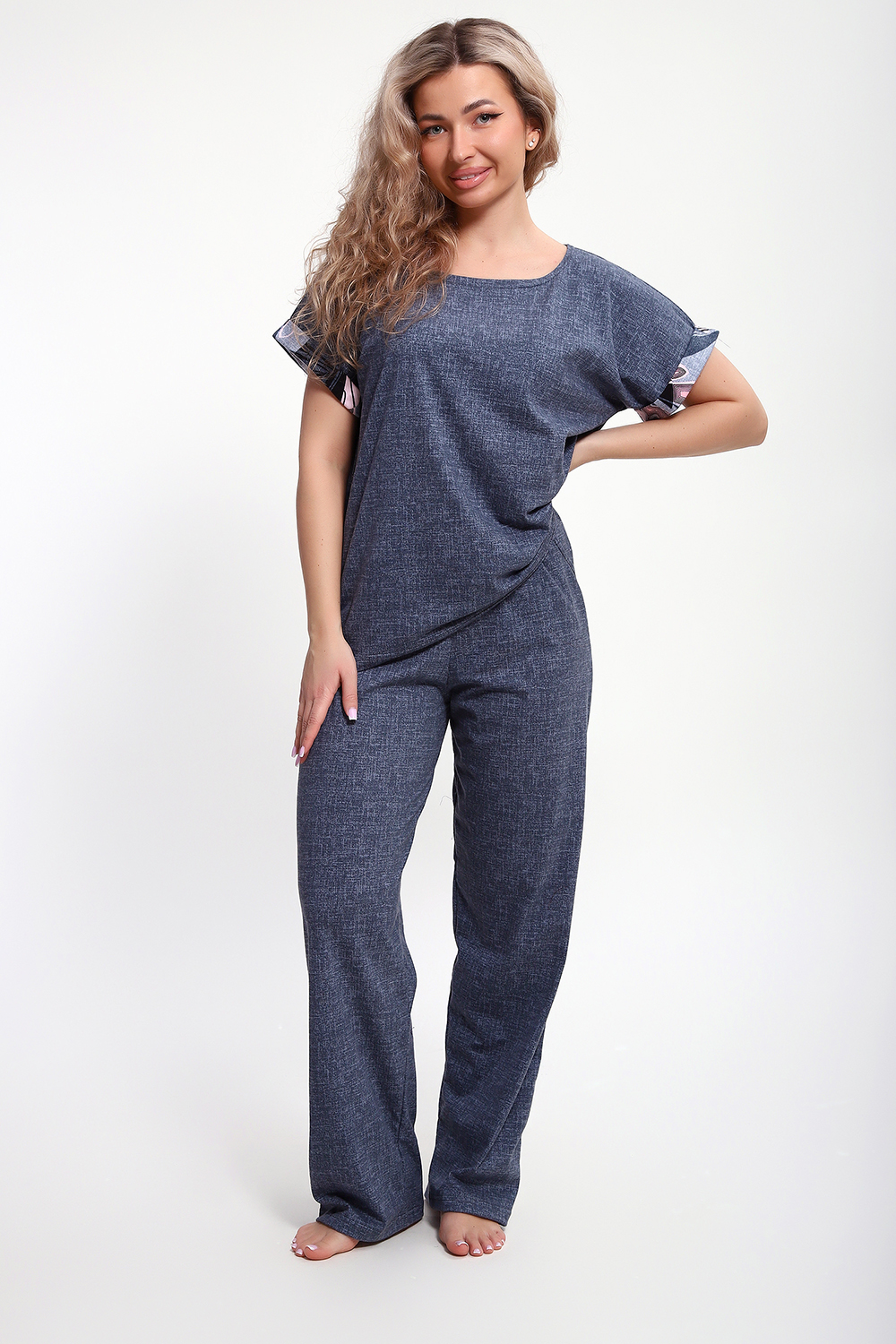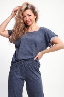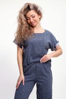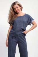 Костюм с брюками выполнен из хлопкового трикотажного полотна, мягкий на ощупь и приятный к телу. Футболка с цельнокроеным рукавом свободно облегает фигуру, скрывая недостатки, создавая изящный силуэт при любых параметрах фигуры. Брюки со средней высотой посадки на притачной эластичной тесьме по талии. Пижамный костюм с брюками с легкостью применим в качестве домашней одежды.