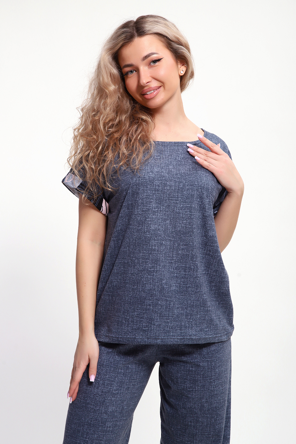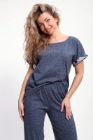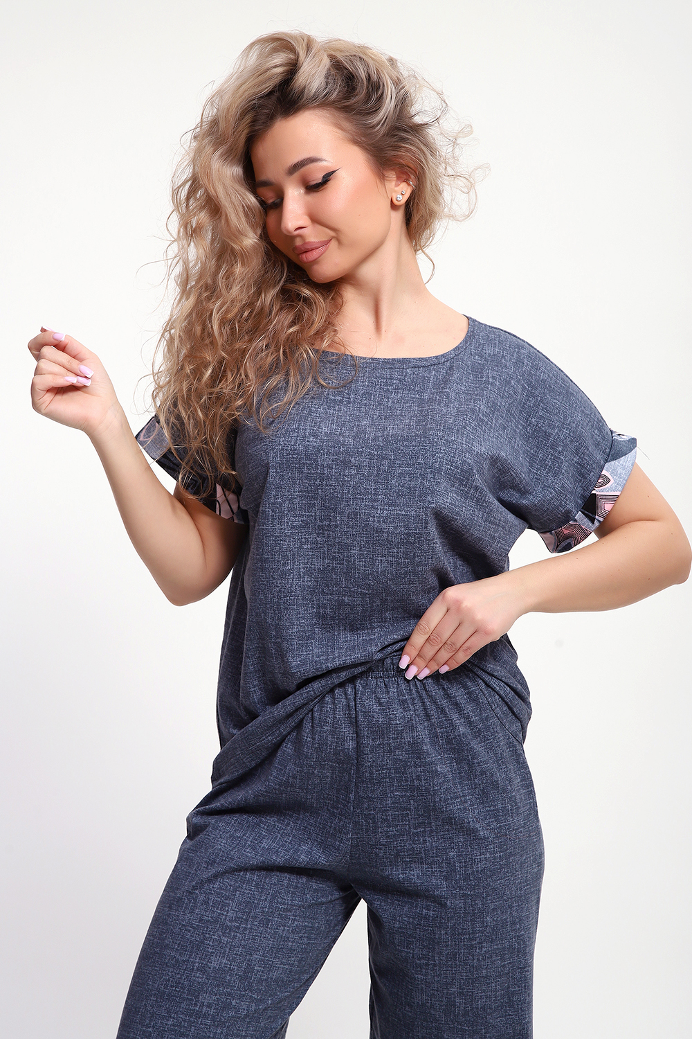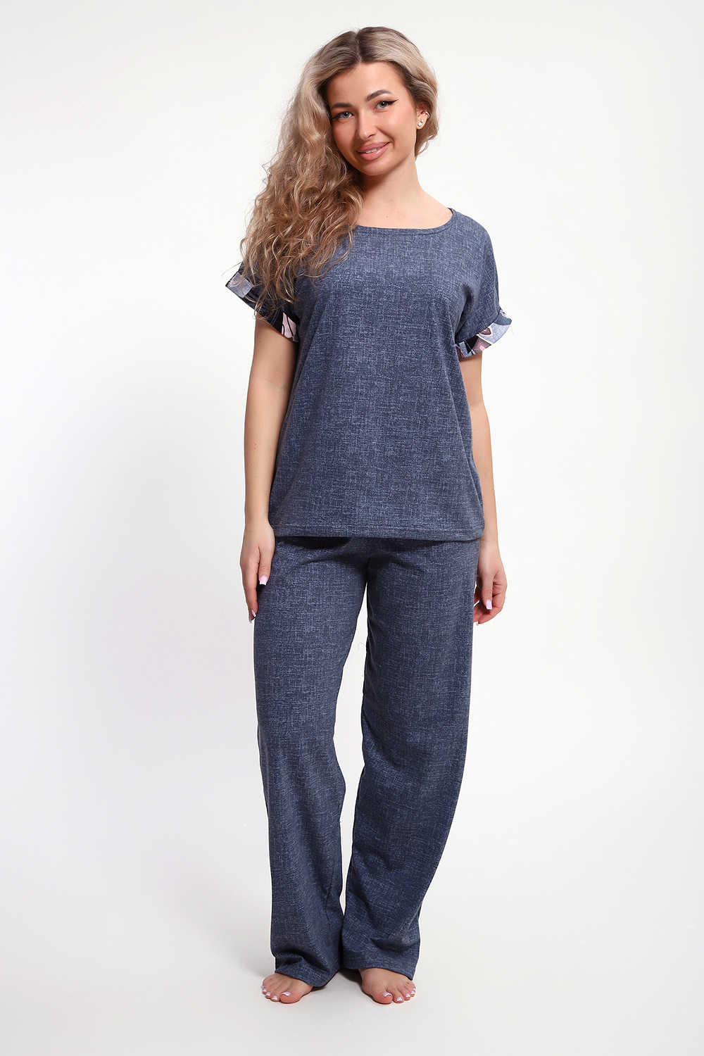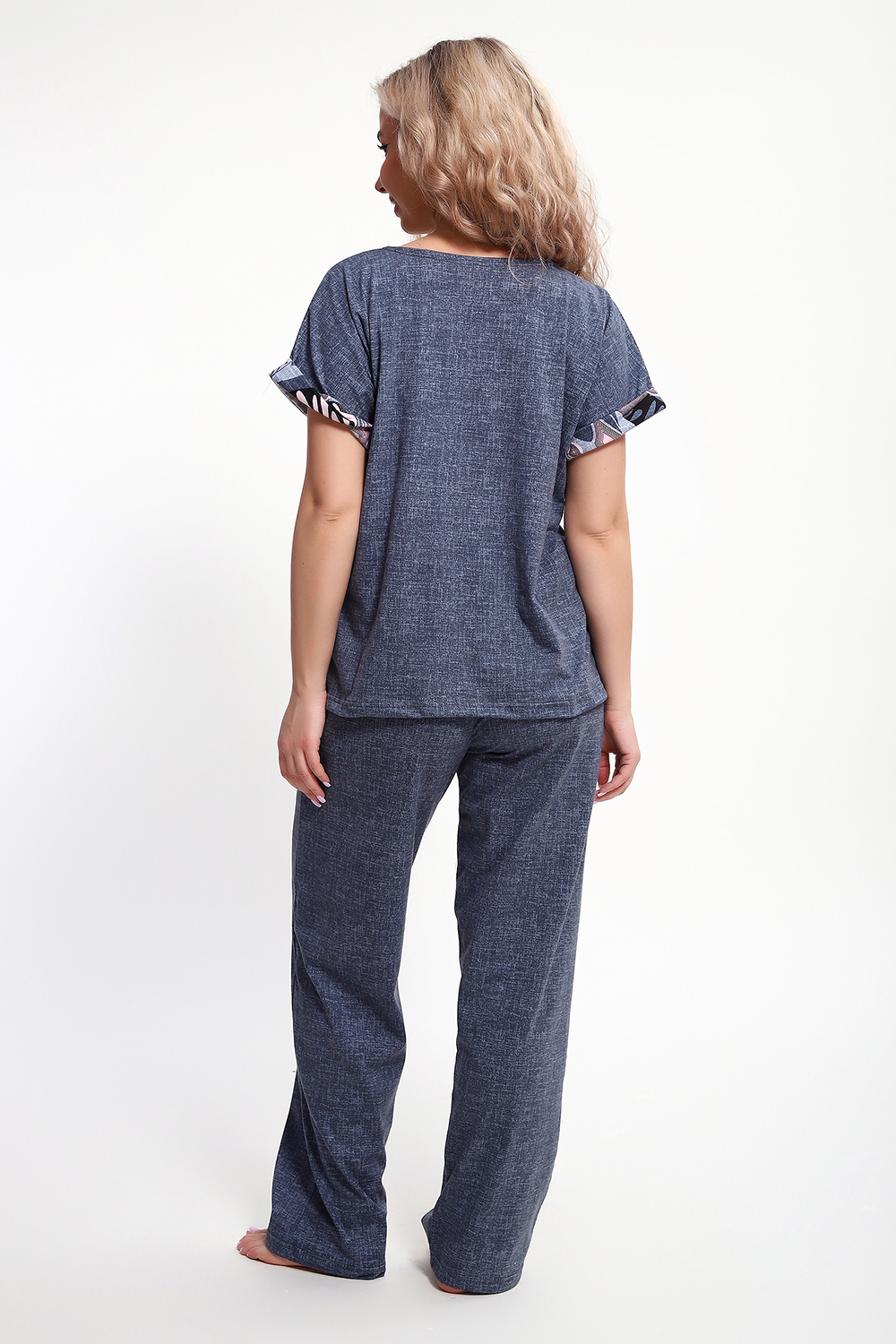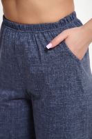 Костюм с брюками выполнен из хлопкового трикотажного полотна, мягкий на ощупь и приятный к телу. Футболка с цельнокроеным рукавом свободно облегает фигуру, скрывая недостатки, создавая изящный силуэт при любых параметрах фигуры. Брюки со средней высотой посадки на притачной эластичной тесьме по талии. Пижамный костюм с брюками с легкостью применим в качестве домашней одежды.
