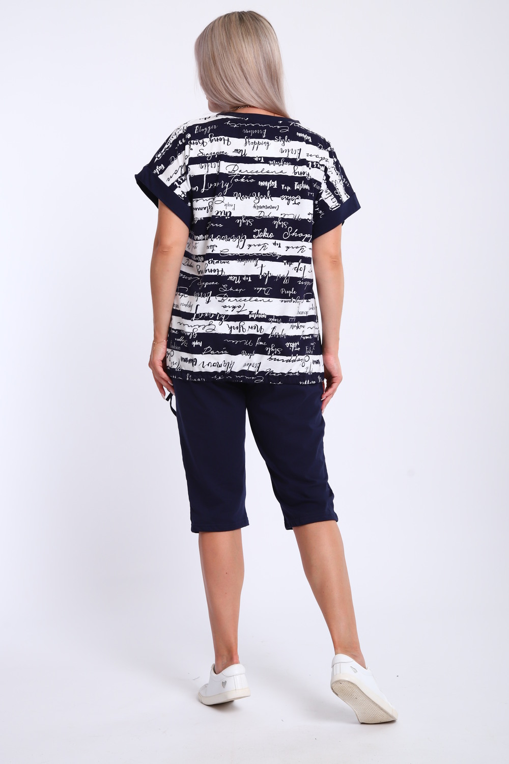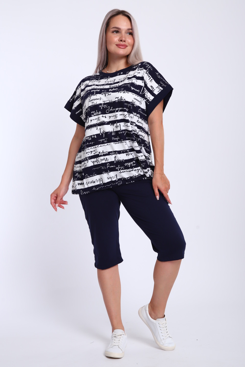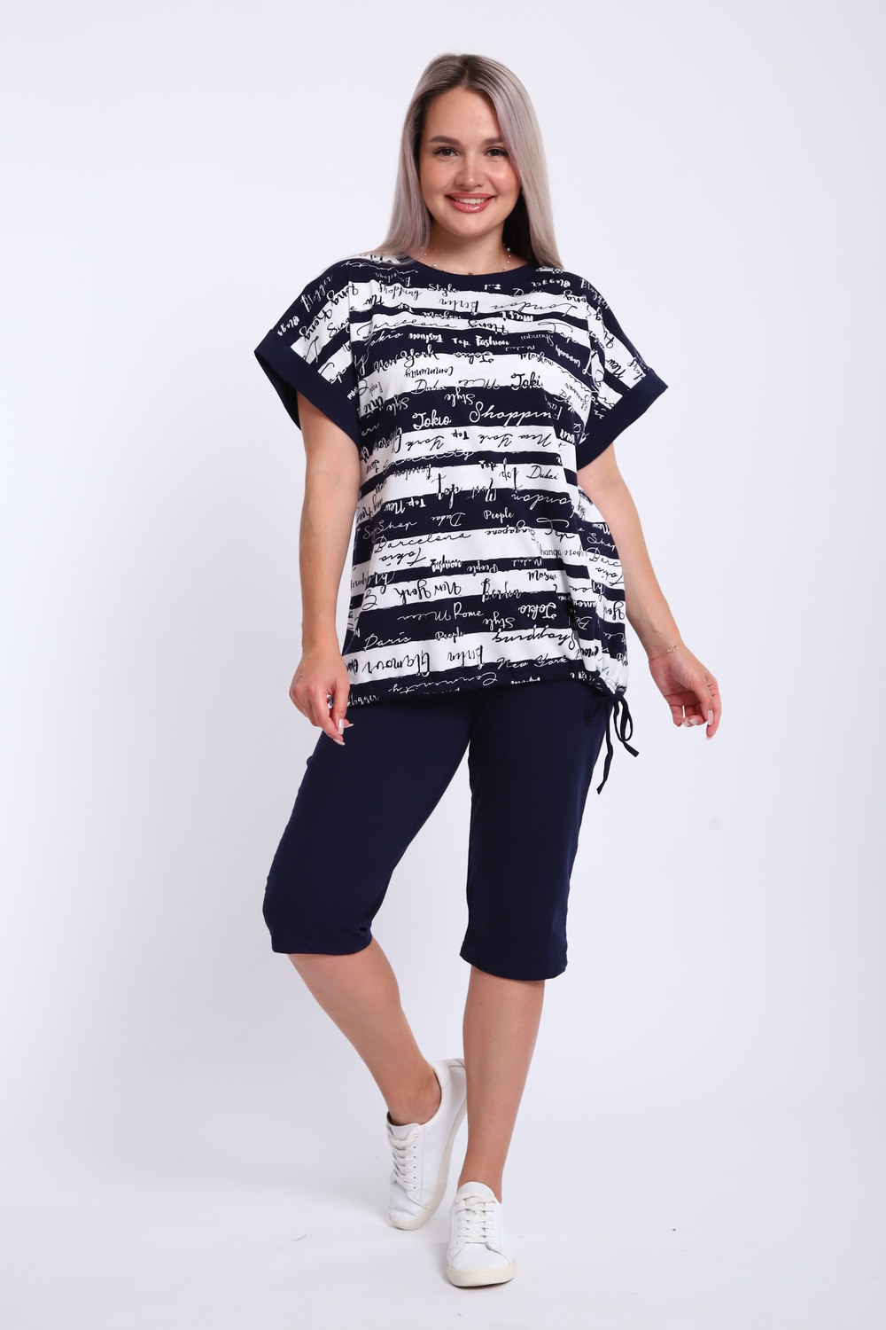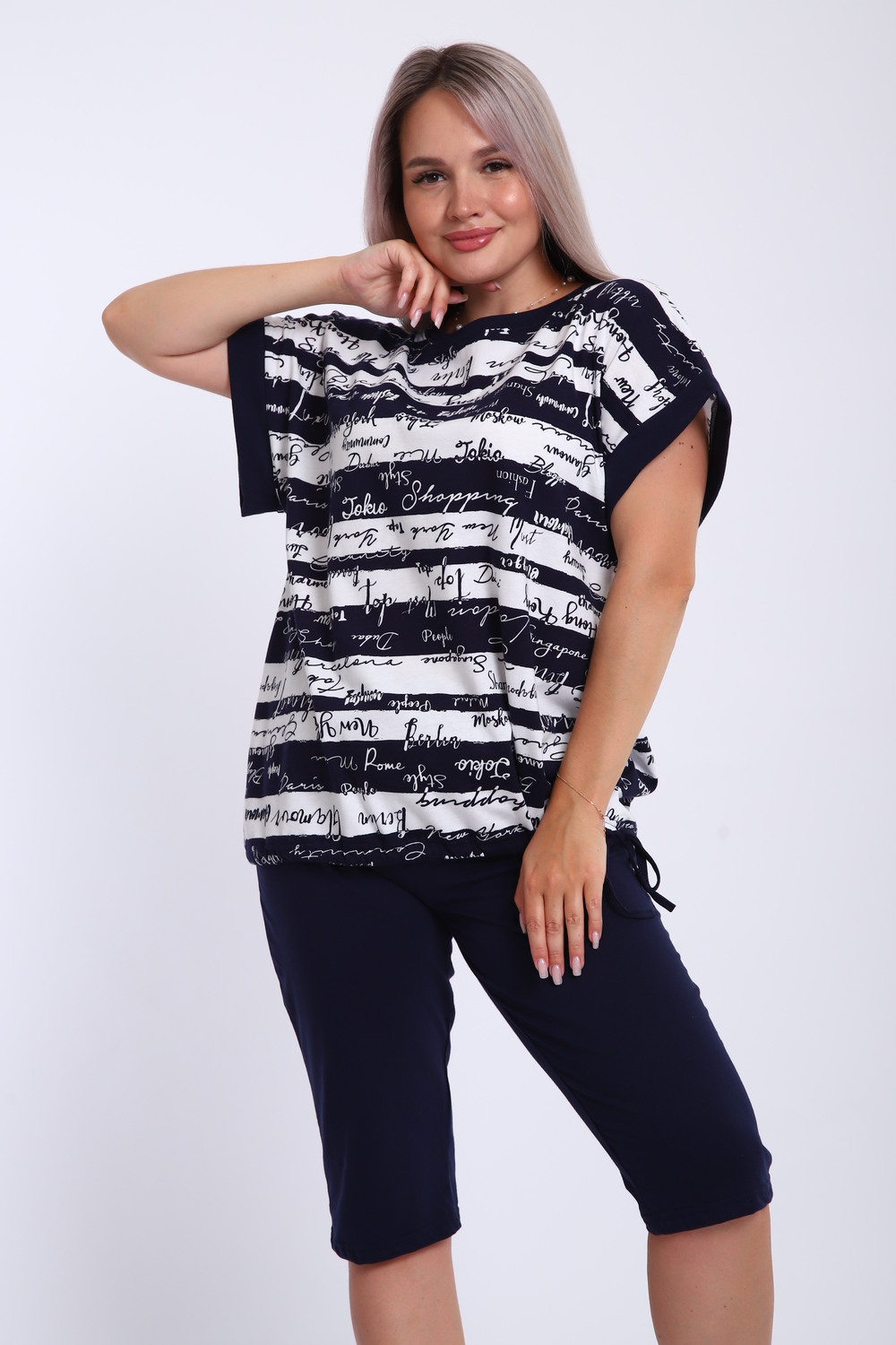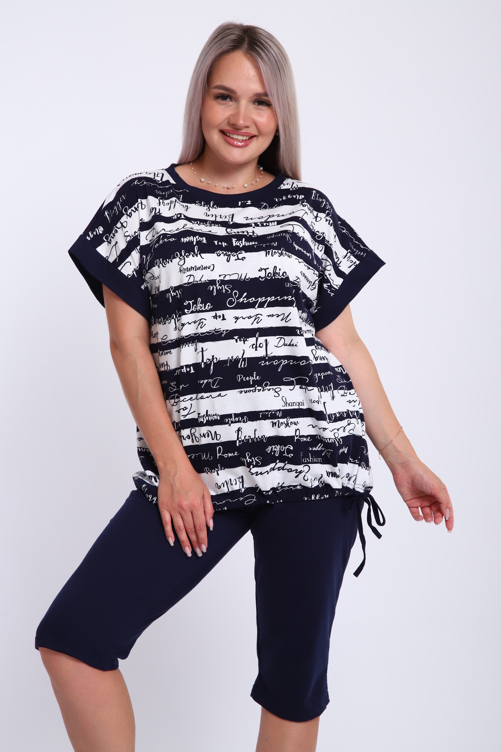 Костюм женский футболка и бриджи. Футболка свободного кроя, плечо спущенное на манжете. Низ футболки собирается на шнурок. Бриджи на резинке, без карманов