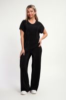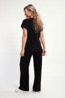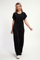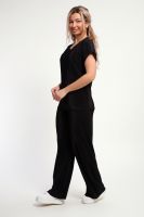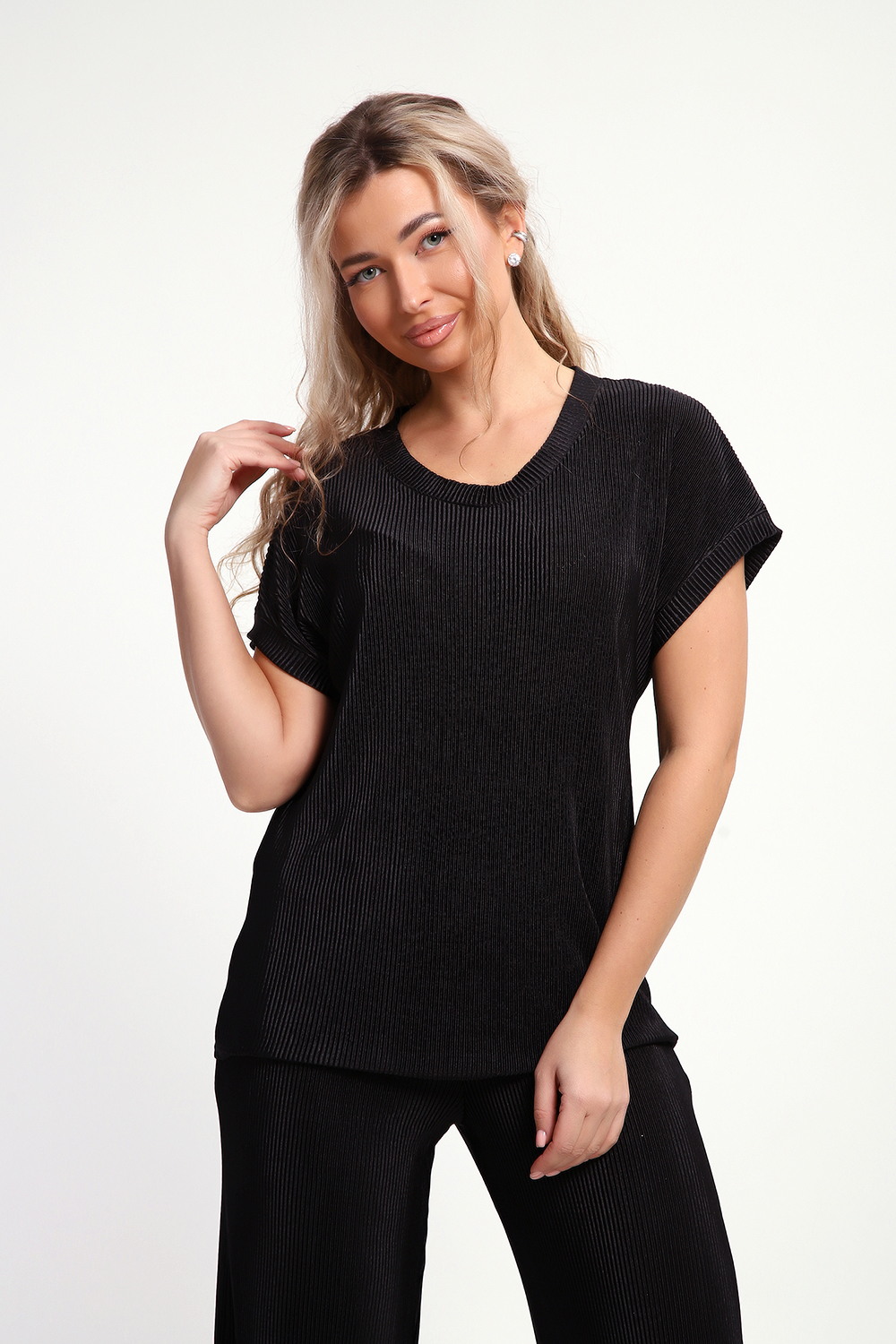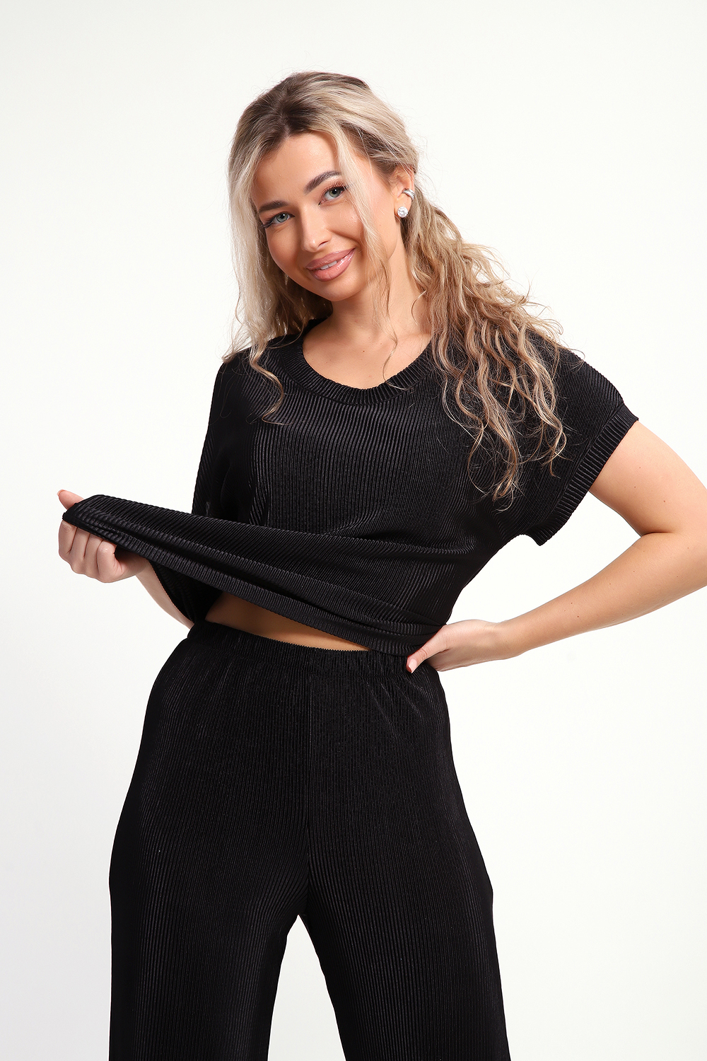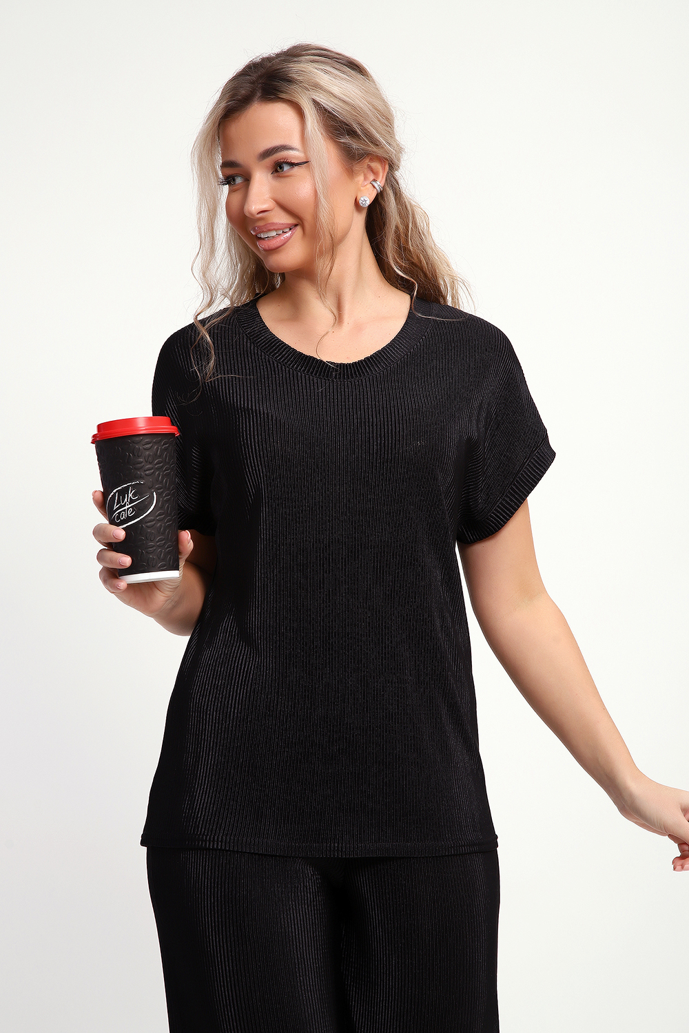 Универсальный женский костюм двойка, сочетающий в себе комфорт и элегантность. Модель выполнена из легкой приятной на ощупь ткани - атлас гофре, которая имеет гофрированную поверхность в рубчик , не мнется, держит форму, проста в уходе. Этот трикотажный костюм включает в себя футболку и широкие брюки палаццо. В нем вы будете себя комфортно чувствовать и дома, и на прогулке, на отдыхе, и на работе. Футболка со спущенным рукавом, что обеспечивает свободу движения, округлая горловина обработана обтачкой. Длина футболки ниже линии бедра. Брюки свободного кроя, слегка расклешенные книзу, удобный пояс на резинке. Стильный комфортный костюм, в котором удобно отдыхать, подчеркнет ваш вкус даже в простых вещах.