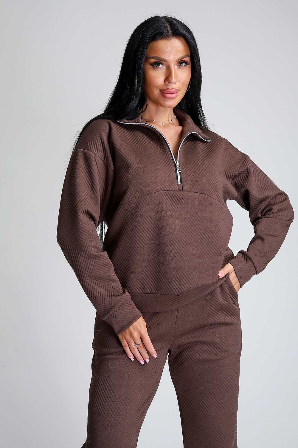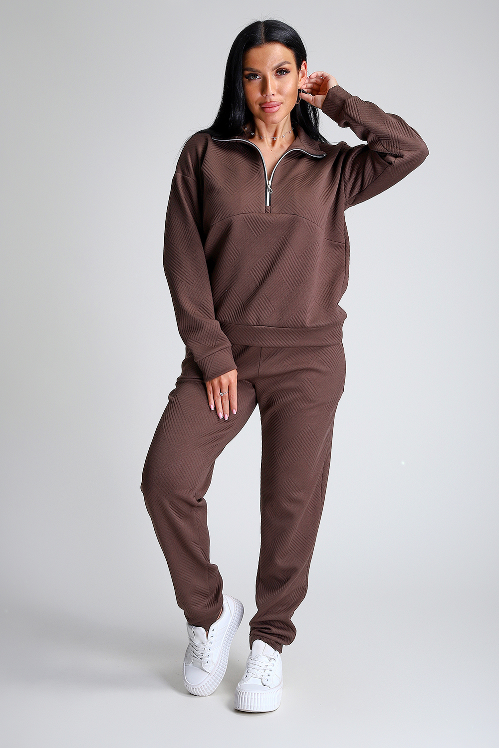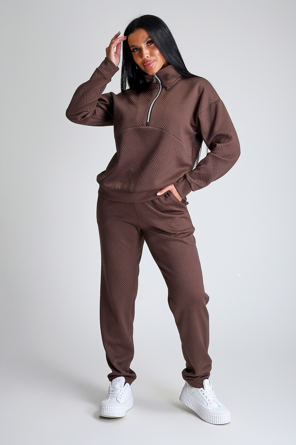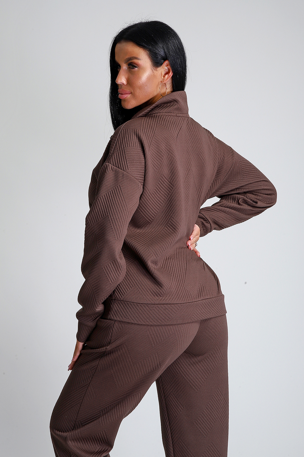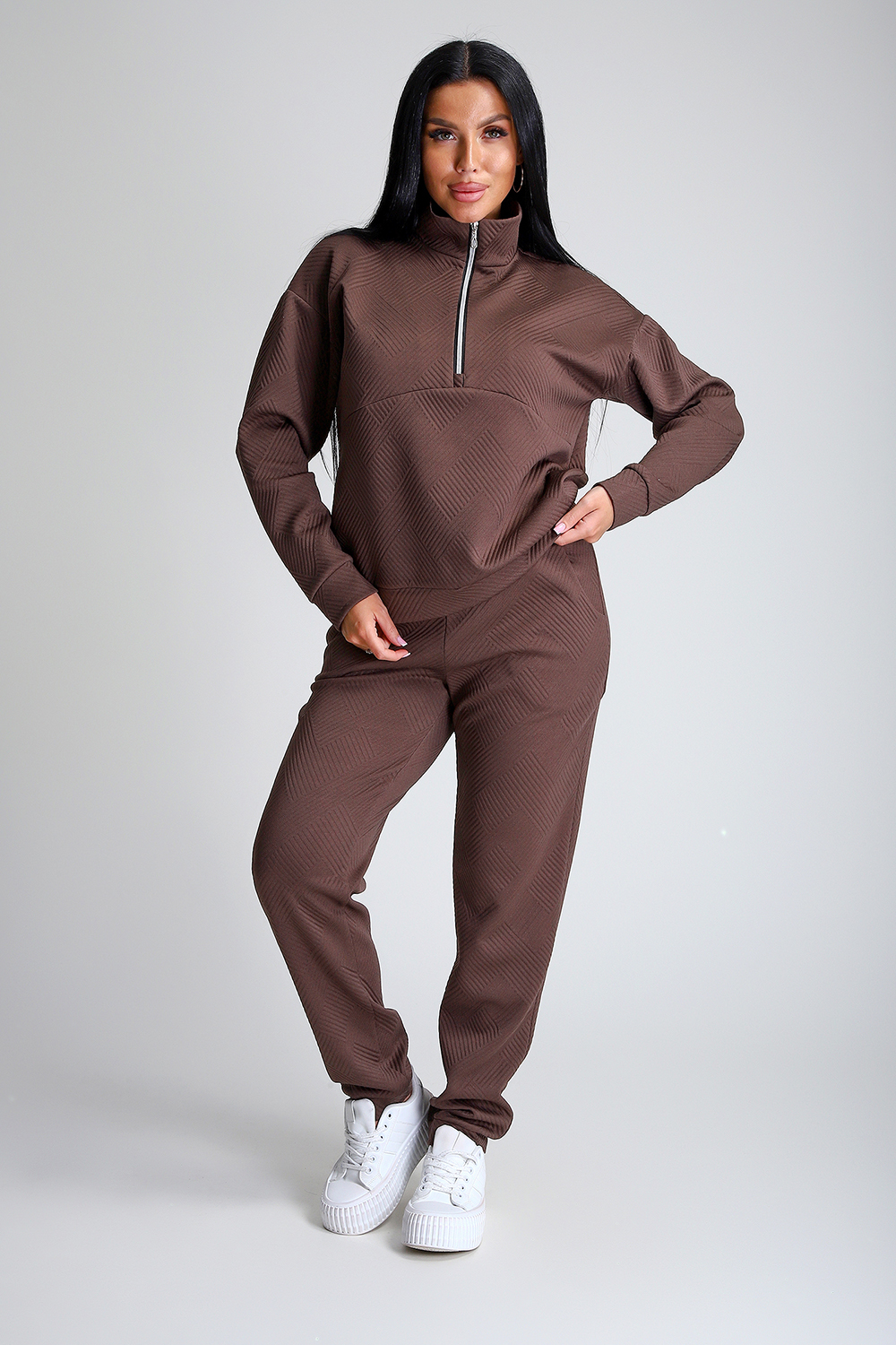 Спортивный женский костюм двойка - это элегантное и практичное решение для тех, кто ценит удобство, свободу движений и современный модный стиль. Костюм для активных девушек, взрослых женщин и подростков состоит из толстовки и брюк джоггеров. Выполнен костюм из приятного к телу эластичного трикотажа с геметрически рельефной структурой. Модная толстовка свободного кроя, воротник-стойка застегивается на молнию, спущенный рукав обеспечивает свободу движения. Брюки прямого кроя с боковыми карманами, удобный пояс на резинке выполнен на спецмашине, по низу брюк притачные манжеты. Повседневный трендовый костюм подходит для любой фигуры, подчеркивая ваши достоинства, будет идеален на отдыхе, прогулке и на спортивных тренировках. В замерах брюк обхват талии соответствует длине резинки в растянутом виде.