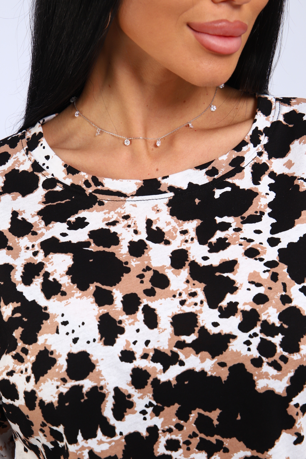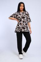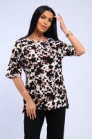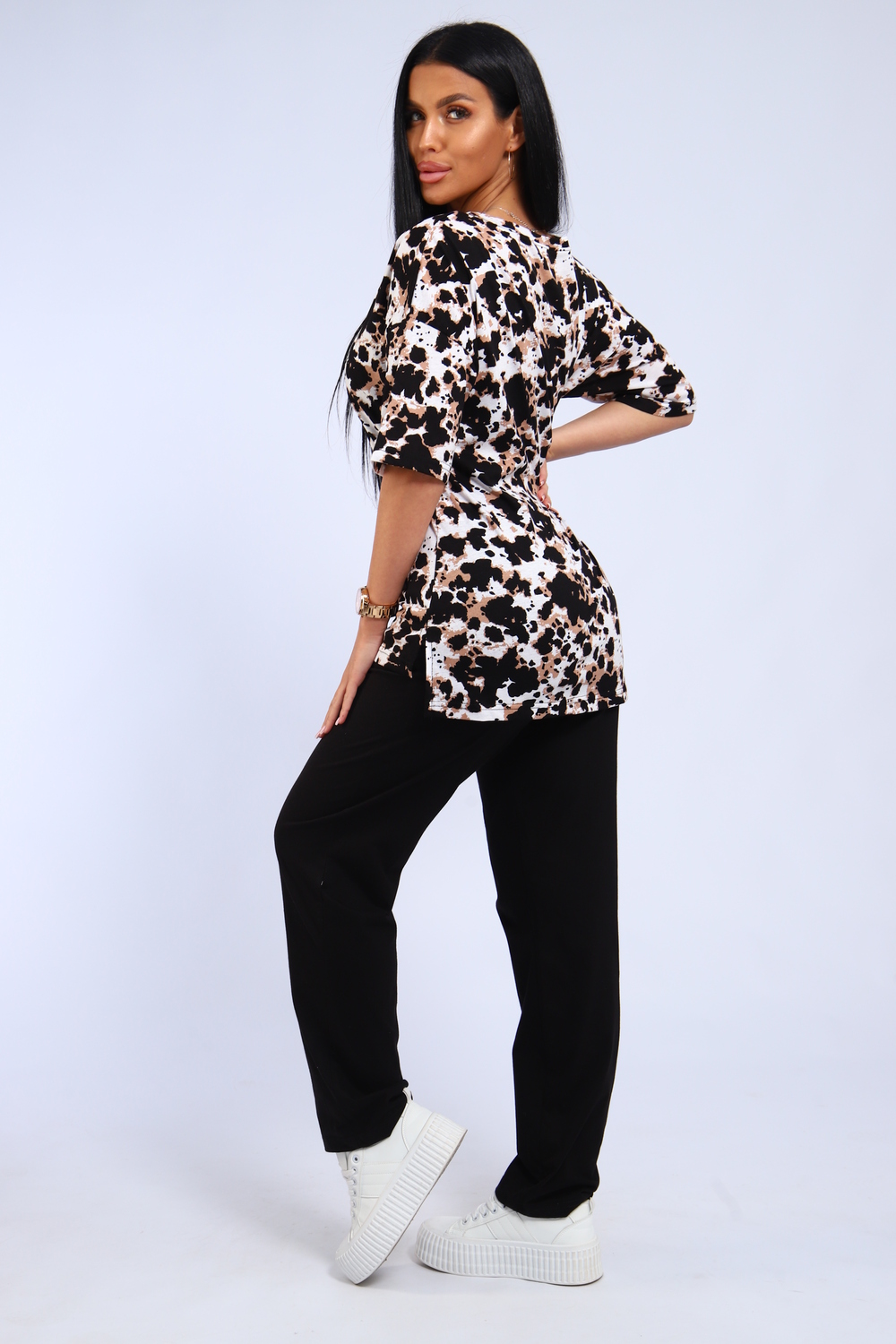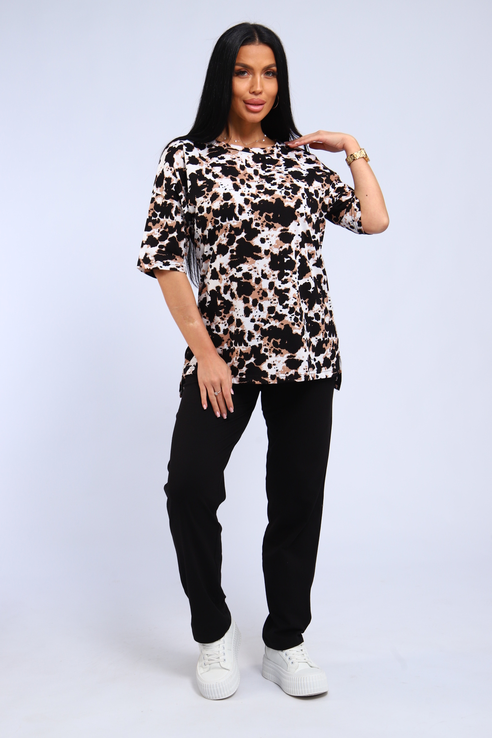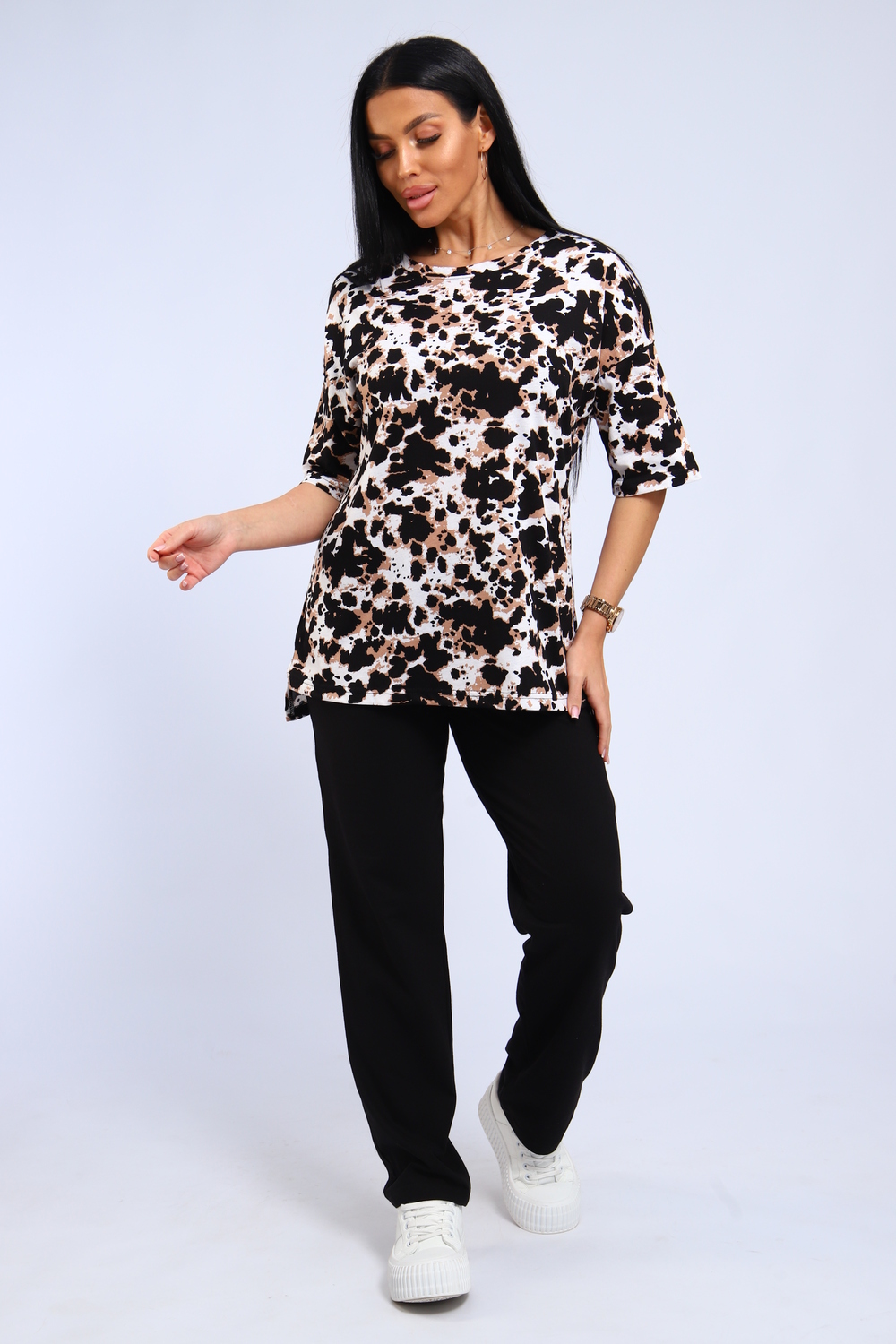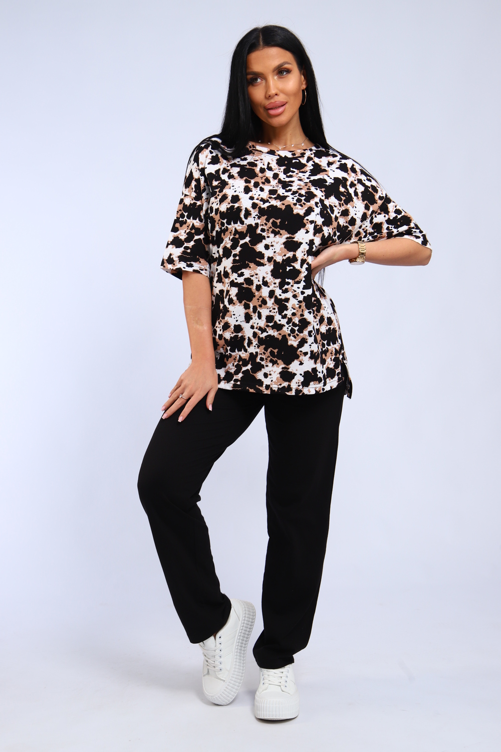 Костюм женский с брюками. Футболка полуприлегающего силуэта. Короткий рукав со спущенным плечом. Брюки прямого кроя.