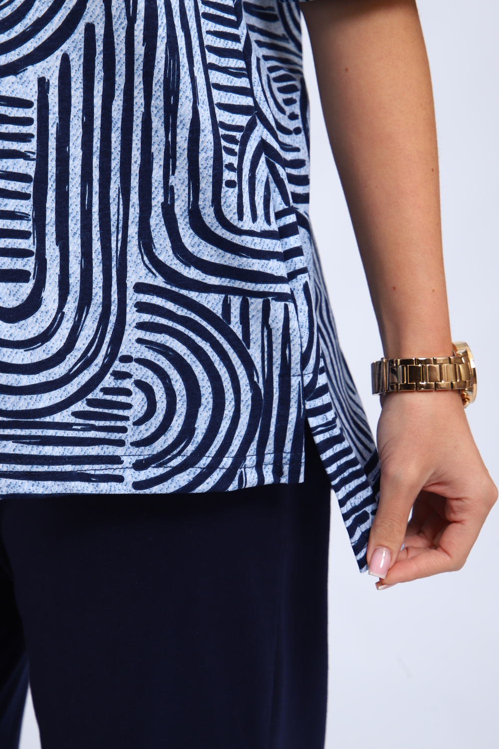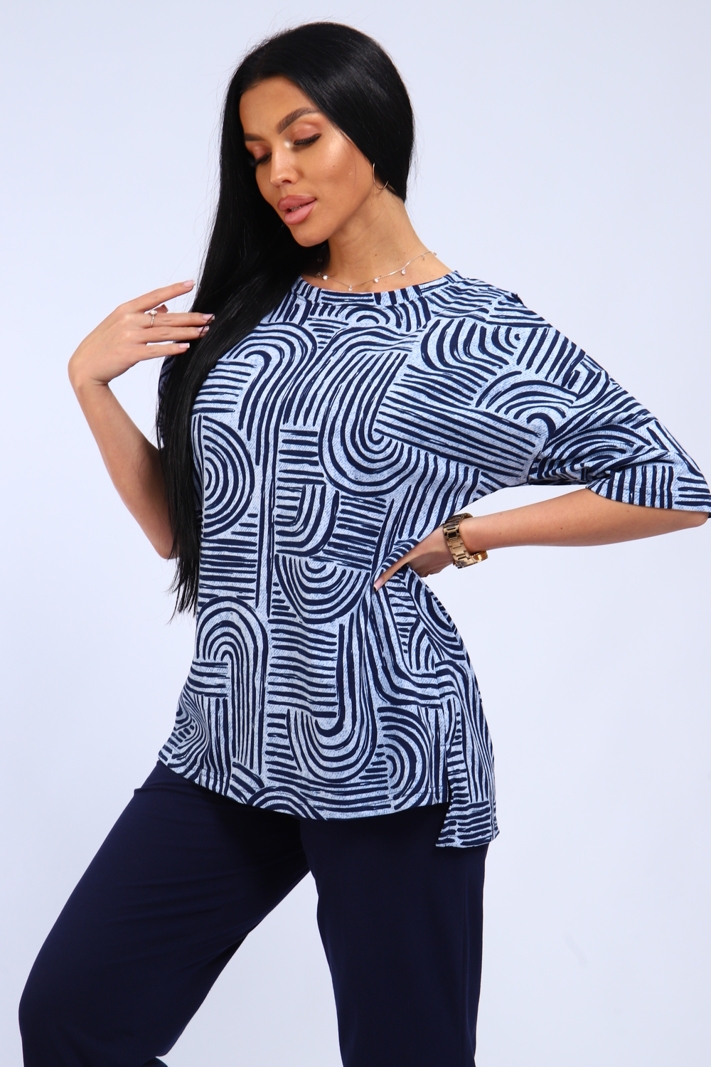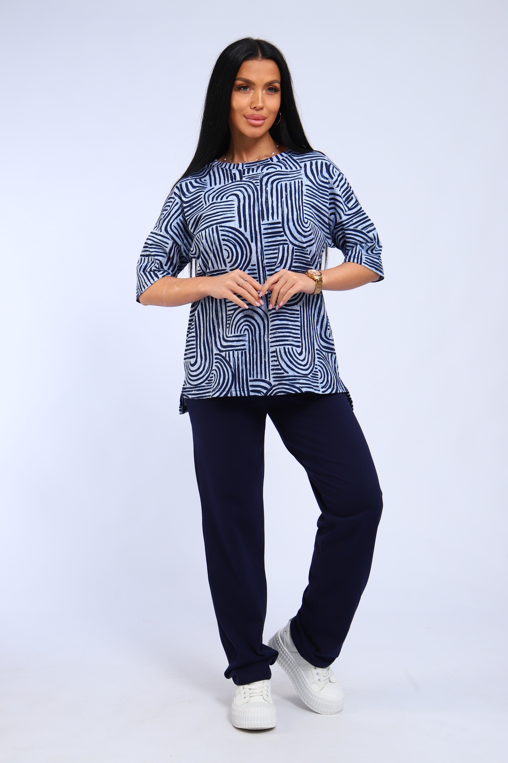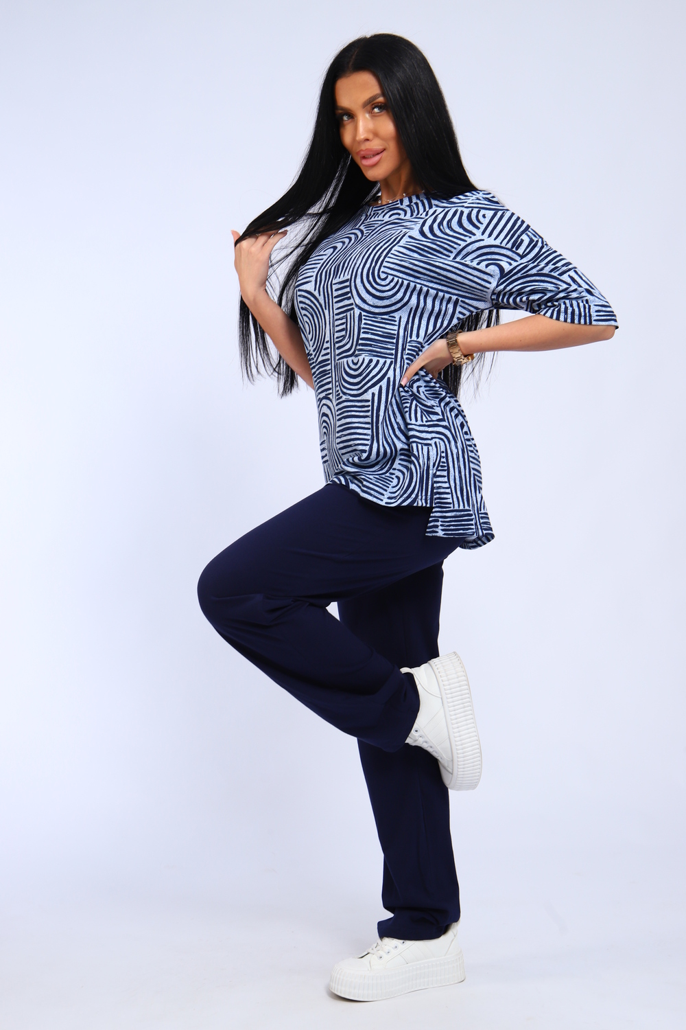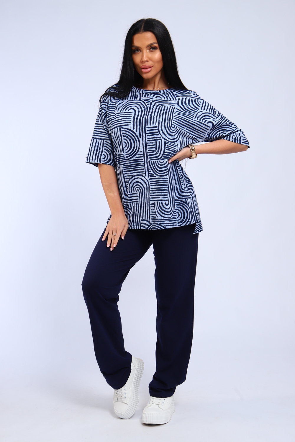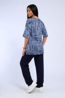 Костюм женский футболка и брюки. Футболка полуприлегающего силуэта. Рукав короткий на спущенном плече. Разрезы в боковых швах. Брюки прямого кроя.