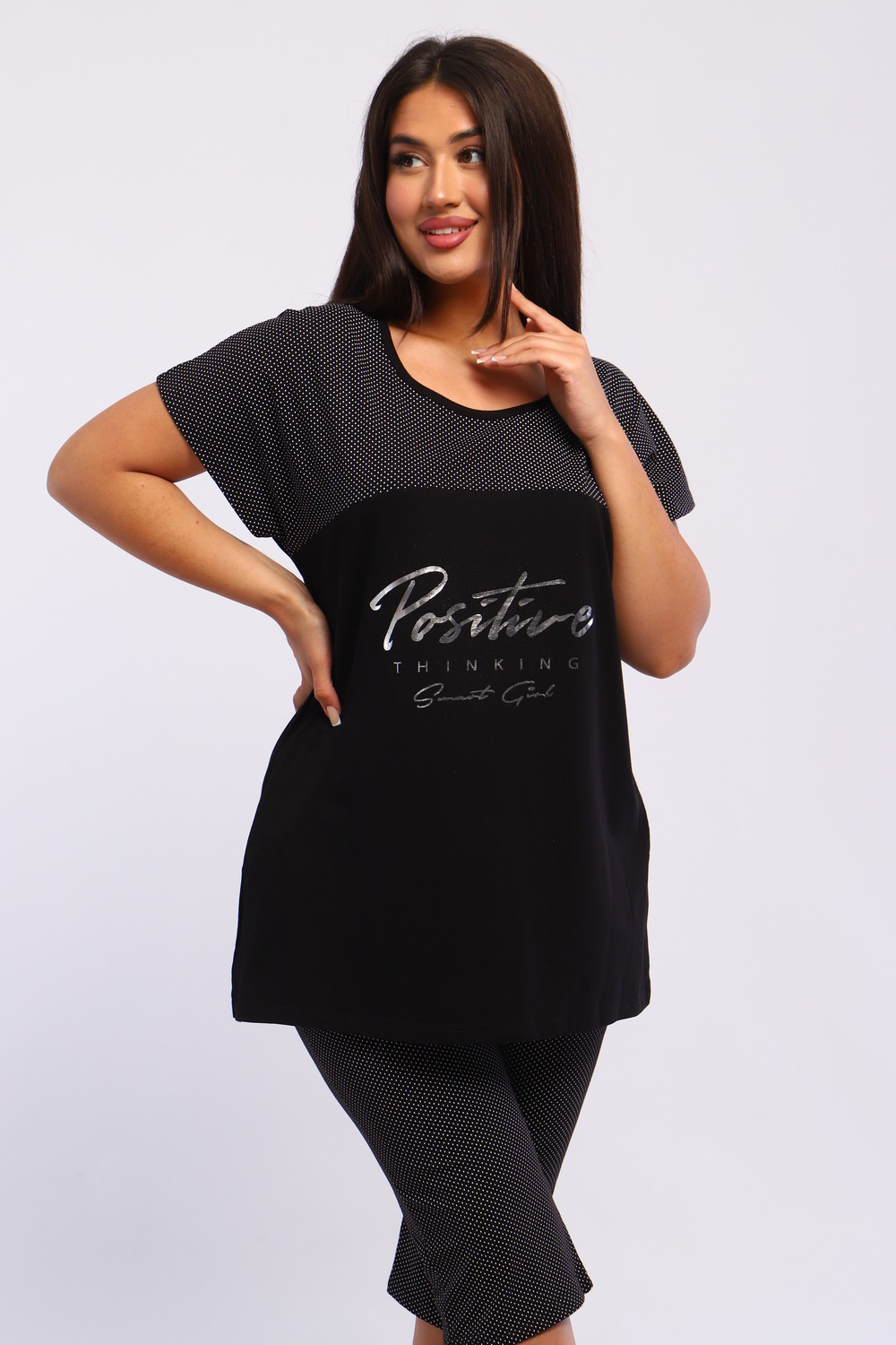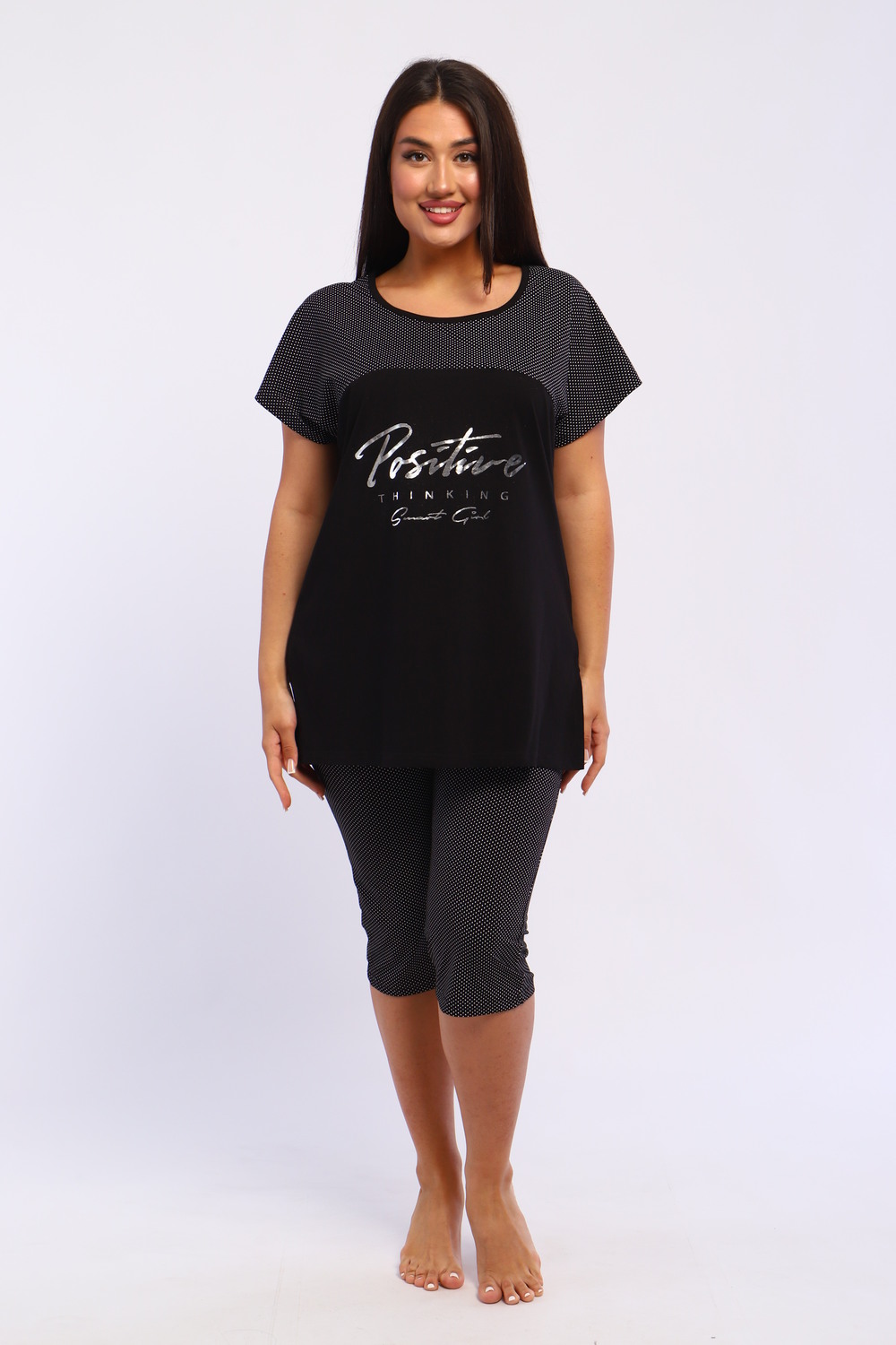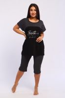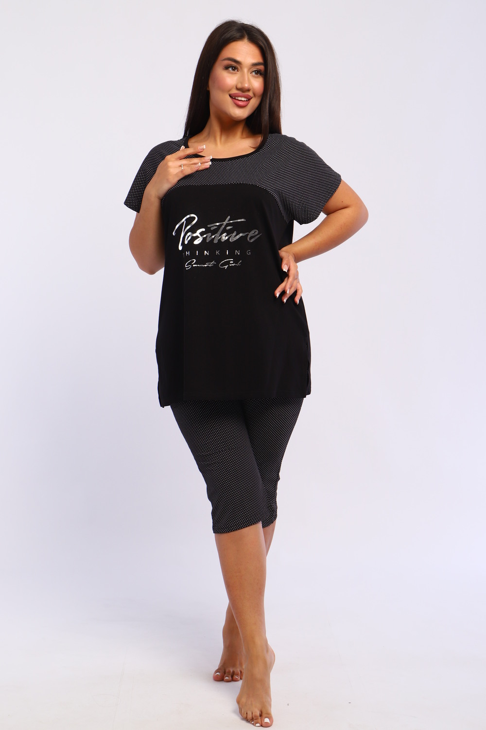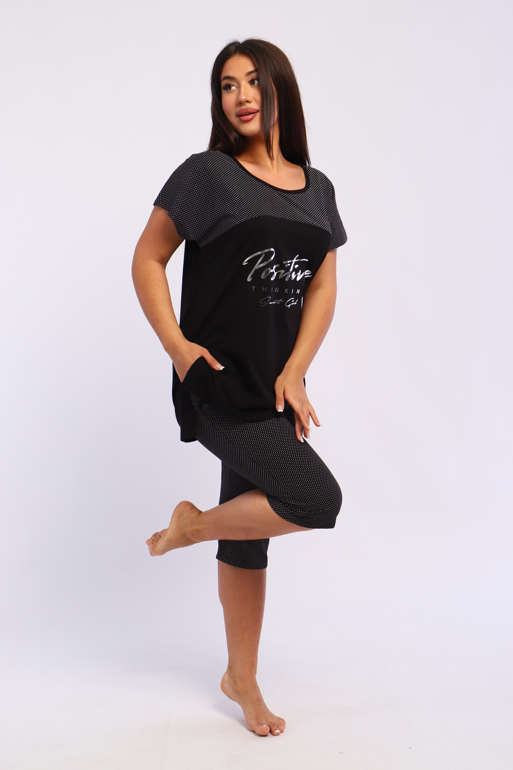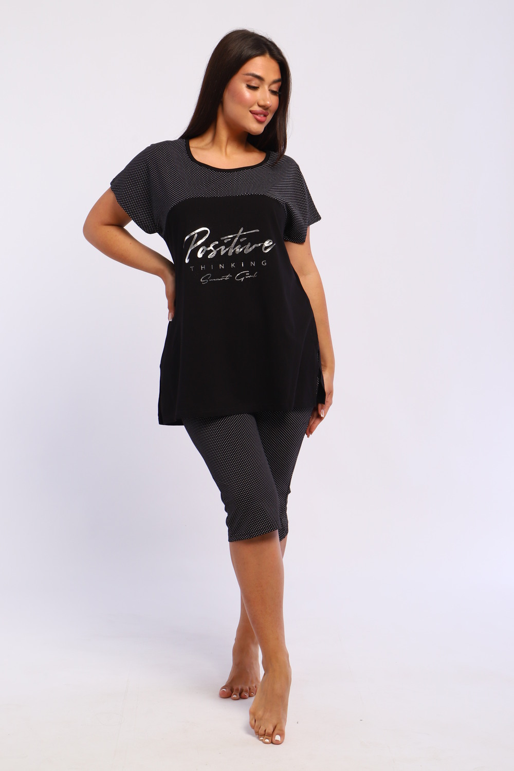 Представляем вашему вниманию шикарный спортивный домашний костюм женский больших размеров, который станет незаменимым элементом вашего гардероба. Этот комплект идеально подходит для комфортного времяпрепровождения дома, прогулок или занятий спортом. Костюм включает в себя стильную футболку и бриджи, выполненные из высококачественного материала, который гарантирует отличную воздухопроницаемость и приятные тактильные ощущения. Будьте уверены, что в этом комплекте вам будет удобно и тепло в любое время года. Он отлично сидит на фигуре и подчеркивает её достоинства, что особенно актуально для подходящей одежды больших размеров. Пижама с бриджами обеспечивает свободу движений, позволяя вам заниматься йогой, фитнесом или просто расслабляться на диване. Спортивный стиль костюма в сочетании с модными элементами поможет вам выглядеть стильно и современно даже в домашней обстановке. Футболка имеет удобный крой и не стесняет движений, что делает её отличным выбором для активного отдыха.