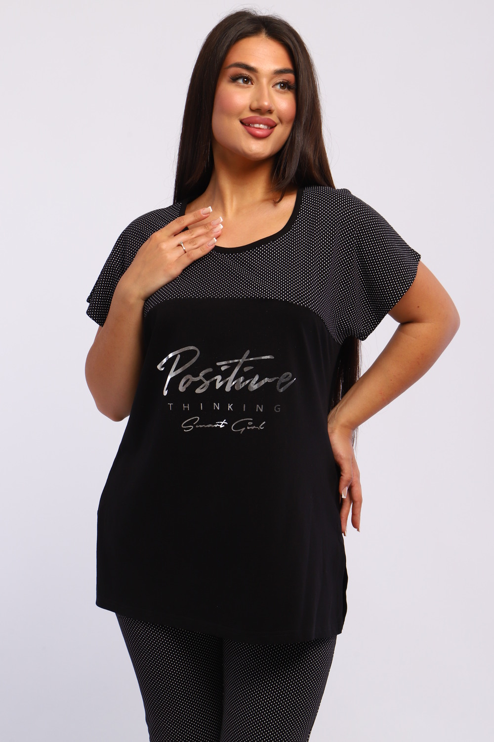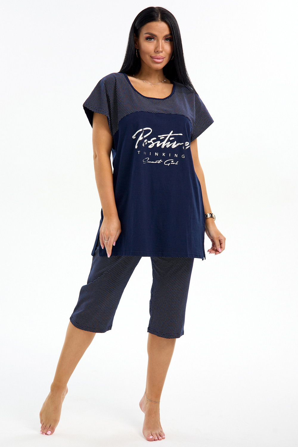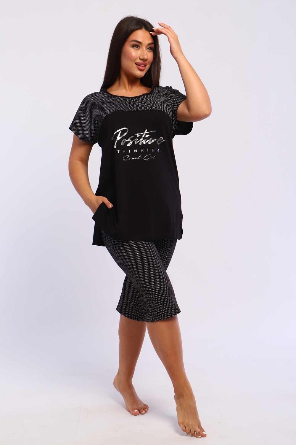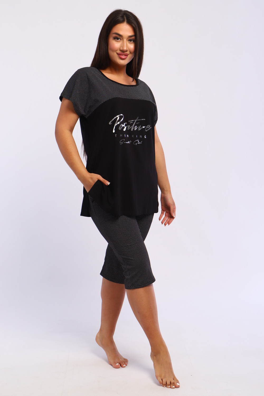 Представляем вашему вниманию шикарный спортивный домашний костюм женский больших размеров, который станет незаменимым элементом вашего гардероба. Этот комплект идеально подходит для комфортного времяпрепровождения дома, прогулок или занятий спортом. Костюм включает в себя стильную футболку и бриджи, выполненные из высококачественного материала, который гарантирует отличную воздухопроницаемость и приятные тактильные ощущения. Будьте уверены, что в этом комплекте вам будет удобно и тепло в любое время года. Он отлично сидит на фигуре и подчеркивает её достоинства, что особенно актуально для подходящей одежды больших размеров. Пижама с бриджами обеспечивает свободу движений, позволяя вам заниматься йогой, фитнесом или просто расслабляться на диване. Спортивный стиль костюма в сочетании с модными элементами поможет вам выглядеть стильно и современно даже в домашней обстановке. Футболка имеет удобный крой и не стесняет движений, что делает её отличным выбором для активного отдыха.