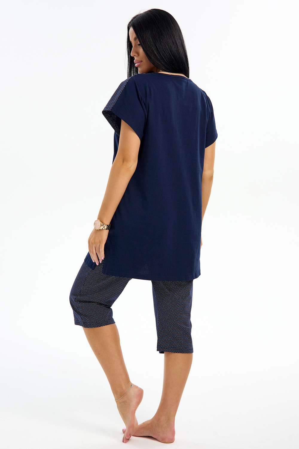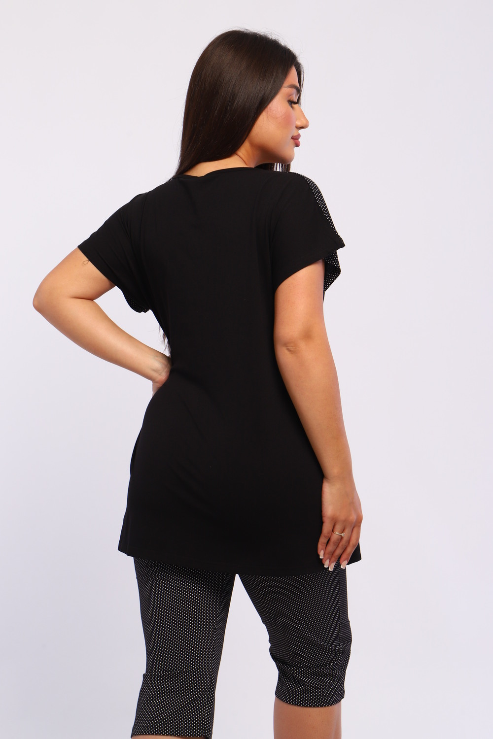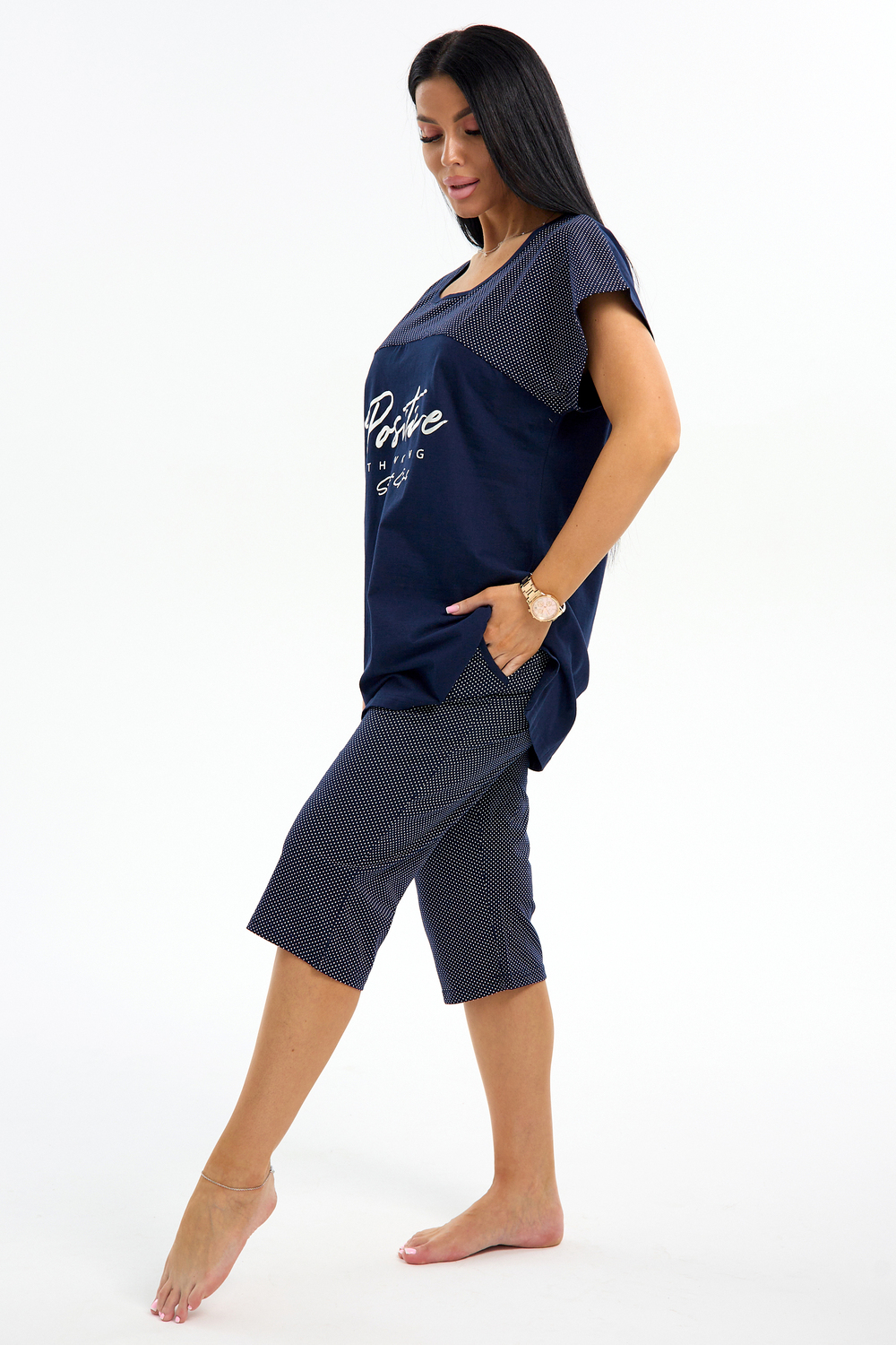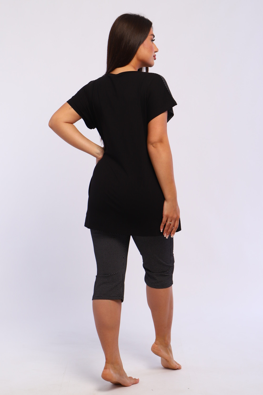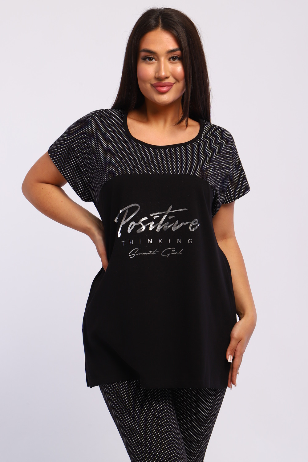 Представляем вашему вниманию шикарный спортивный домашний костюм женский больших размеров, который станет незаменимым элементом вашего гардероба. Этот комплект идеально подходит для комфортного времяпрепровождения дома, прогулок или занятий спортом. Костюм включает в себя стильную футболку и бриджи, выполненные из высококачественного материала, который гарантирует отличную воздухопроницаемость и приятные тактильные ощущения. Будьте уверены, что в этом комплекте вам будет удобно и тепло в любое время года. Он отлично сидит на фигуре и подчеркивает её достоинства, что особенно актуально для подходящей одежды больших размеров. Пижама с бриджами обеспечивает свободу движений, позволяя вам заниматься йогой, фитнесом или просто расслабляться на диване. Спортивный стиль костюма в сочетании с модными элементами поможет вам выглядеть стильно и современно даже в домашней обстановке. Футболка имеет удобный крой и не стесняет движений, что делает её отличным выбором для активного отдыха.