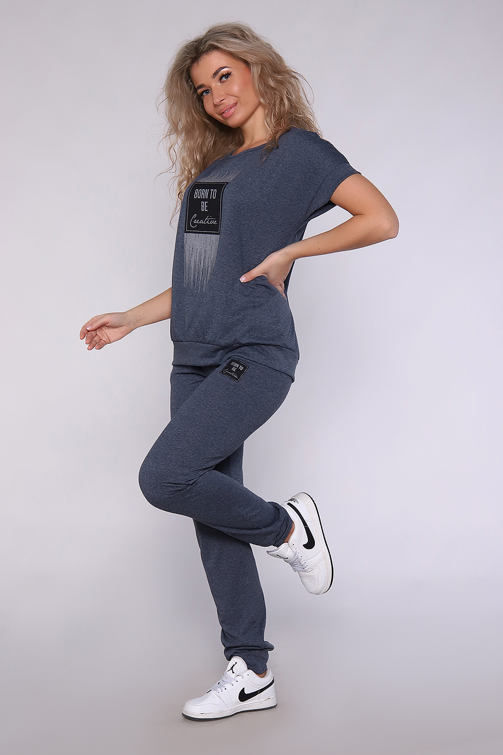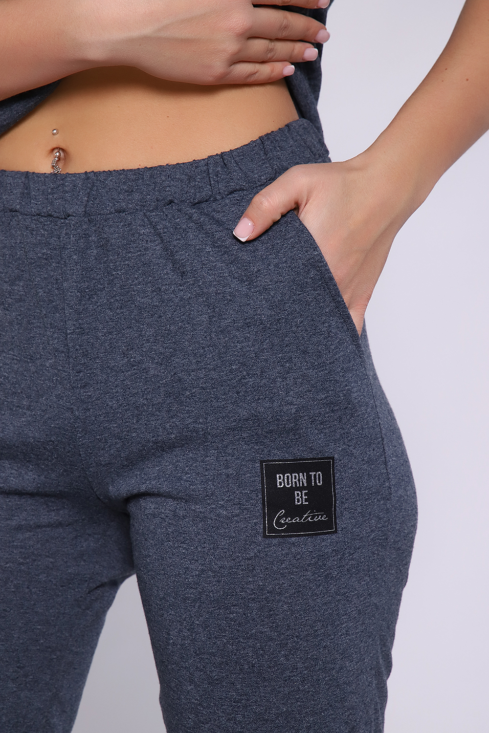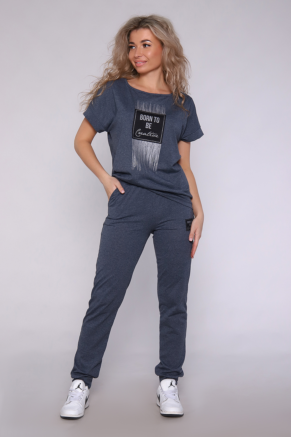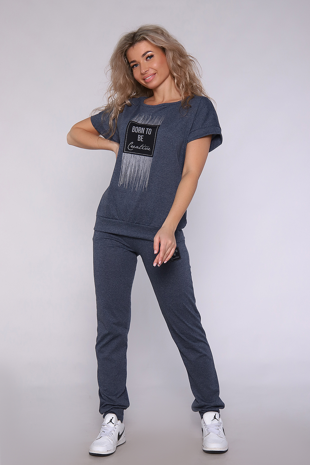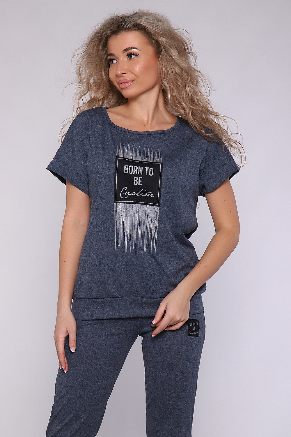 Костюм из меланжированной кулирки, смесового состава. Футболка на поясе , плечо спущено, брюки на манжетах и с карманами. Принт на футболке с блестящим глиттером.
