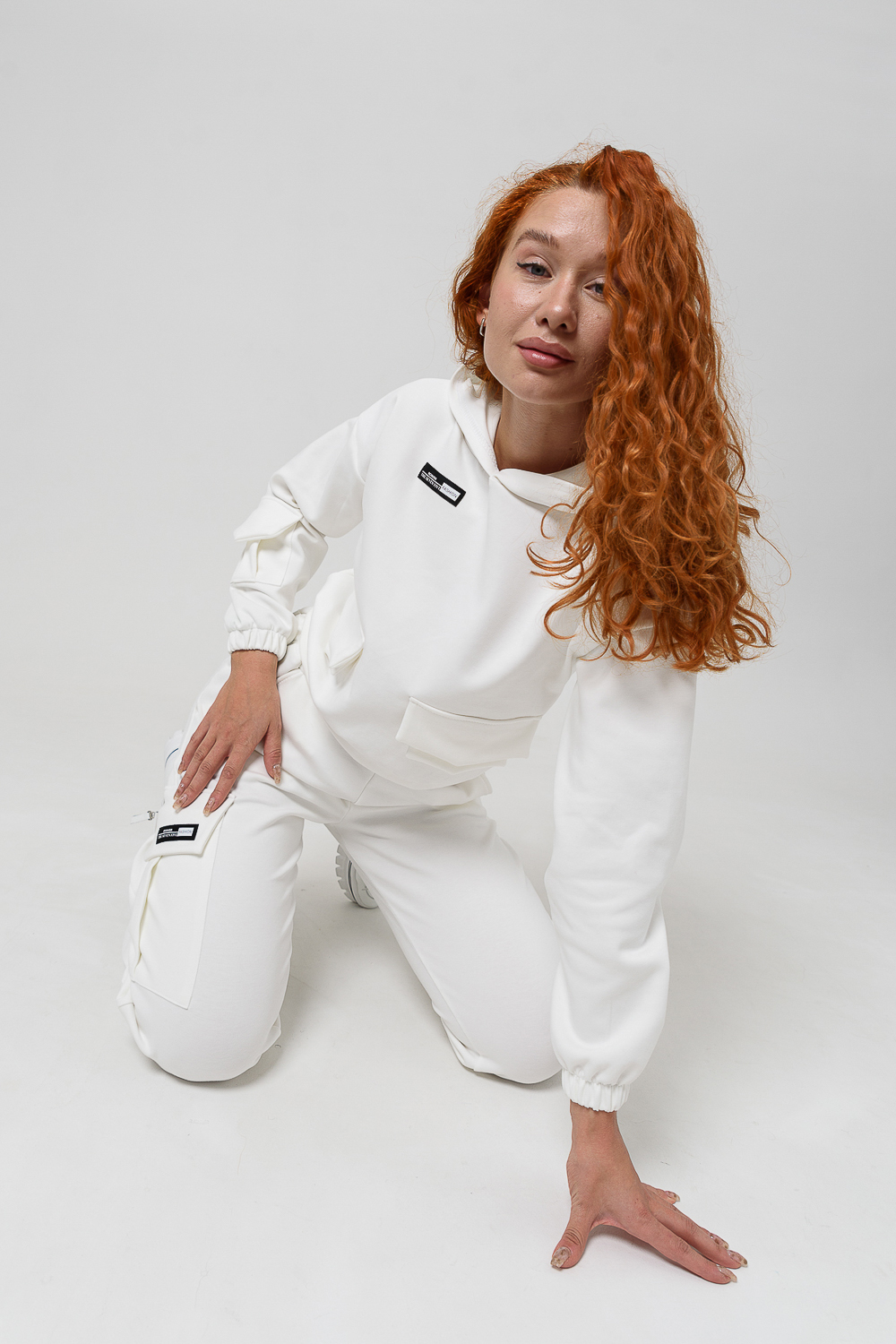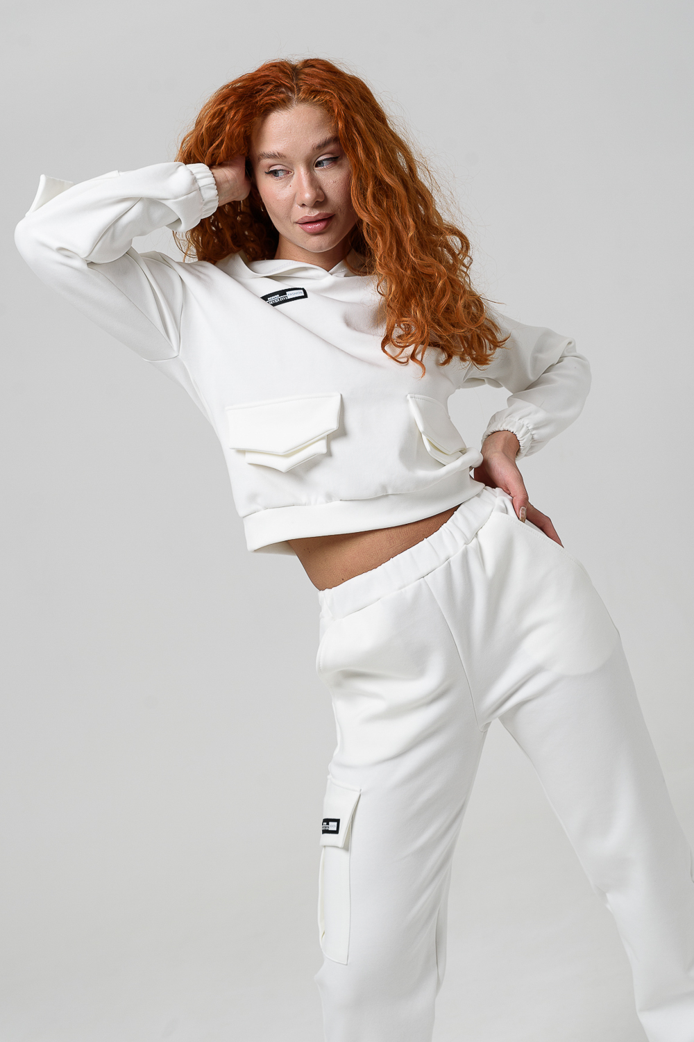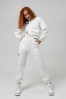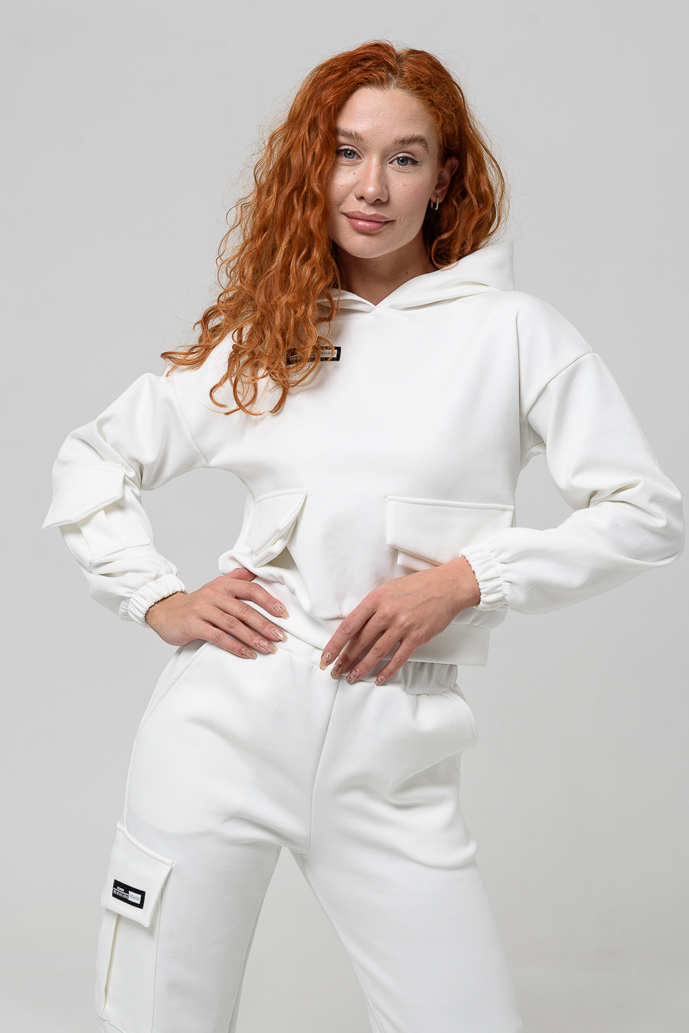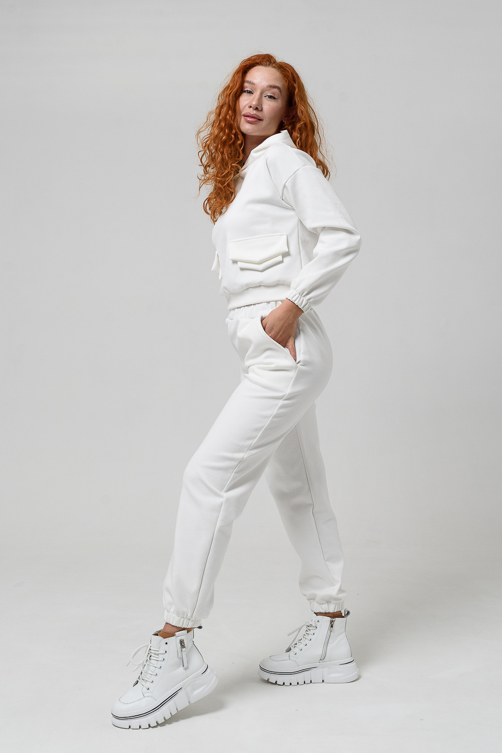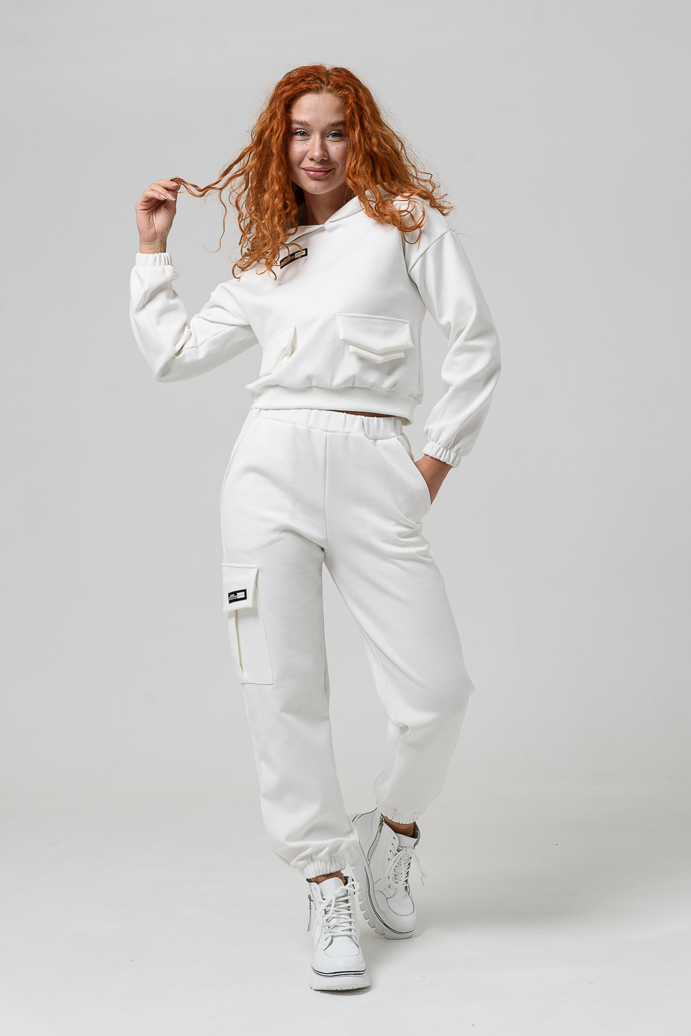 Женский костюм двойка из интерлока. Состоит из укороченной толстовки и брюк. Толстовка с капюшоном, два фальш кармана на полочке и нашивка. Имеется карман с клапаном на рукаве. На брюках две пары карманов, нашивка, верх и низ брюк выполнен резинкой. Модель 42 размера, костюм на ней так же 42 размера.