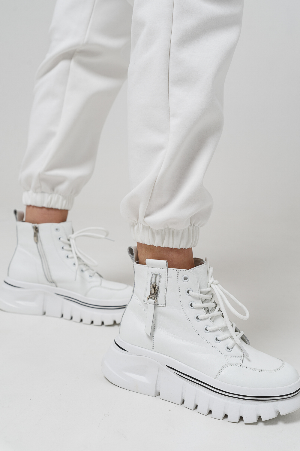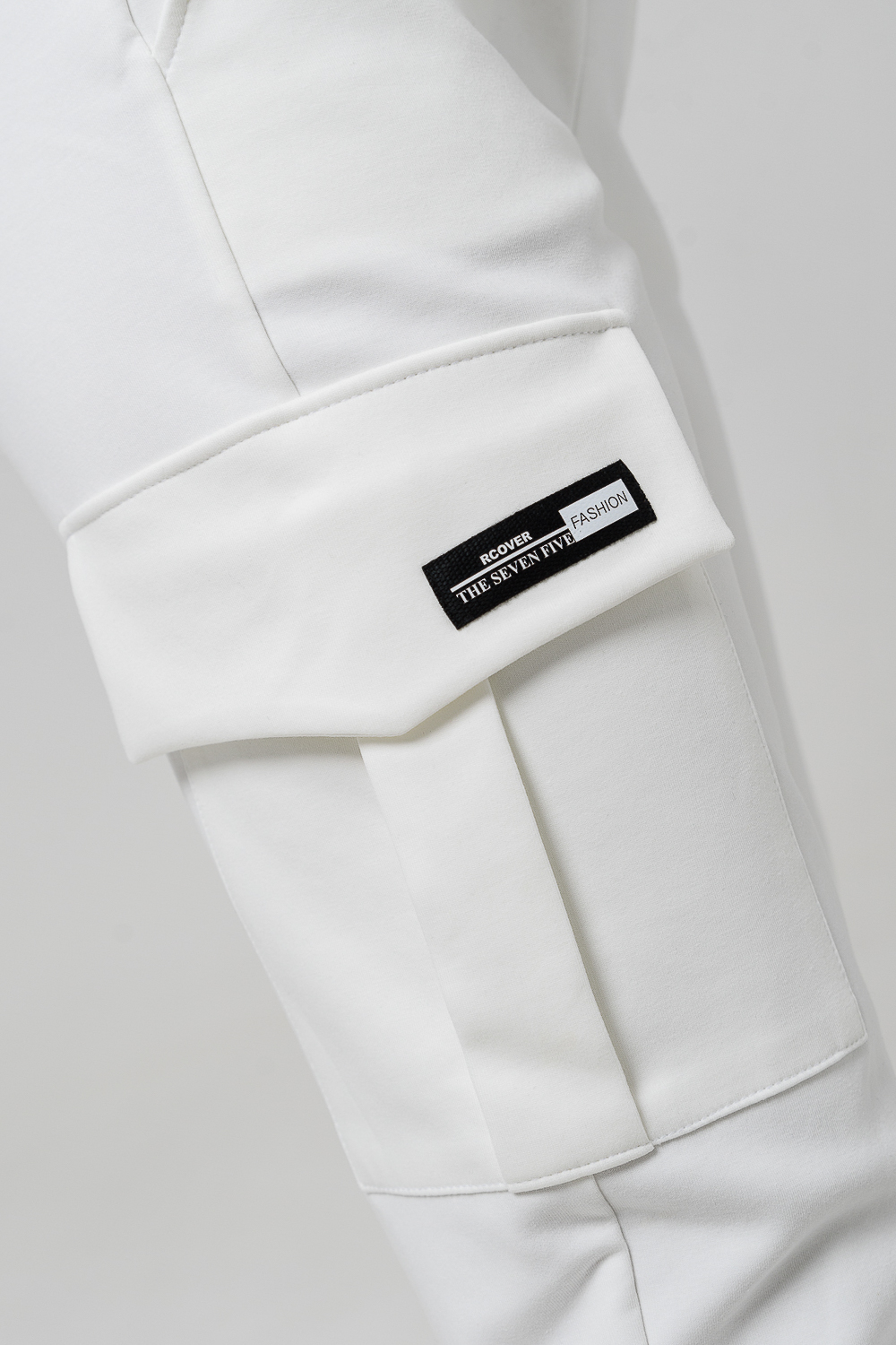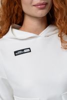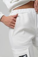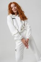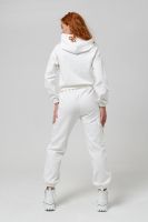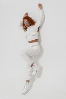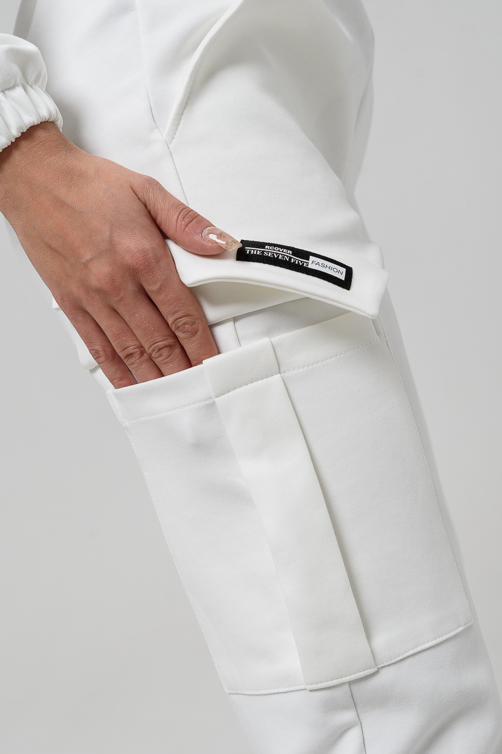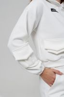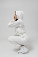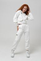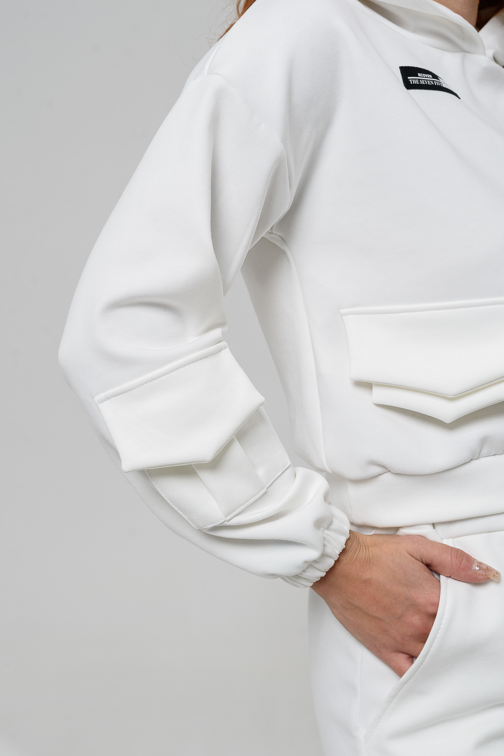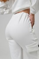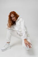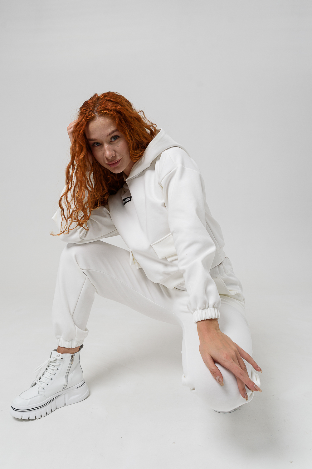 Женский костюм двойка из интерлока. Состоит из укороченной толстовки и брюк. Толстовка с капюшоном, два фальш кармана на полочке и нашивка. Имеется карман с клапаном на рукаве. На брюках две пары карманов, нашивка, верх и низ брюк выполнен резинкой. Модель 42 размера, костюм на ней так же 42 размера.
