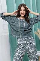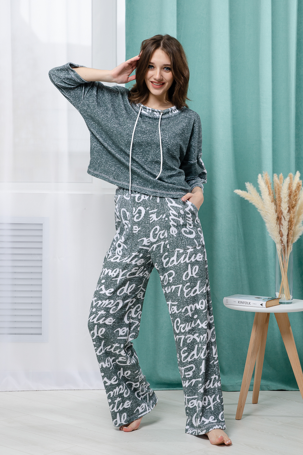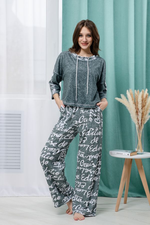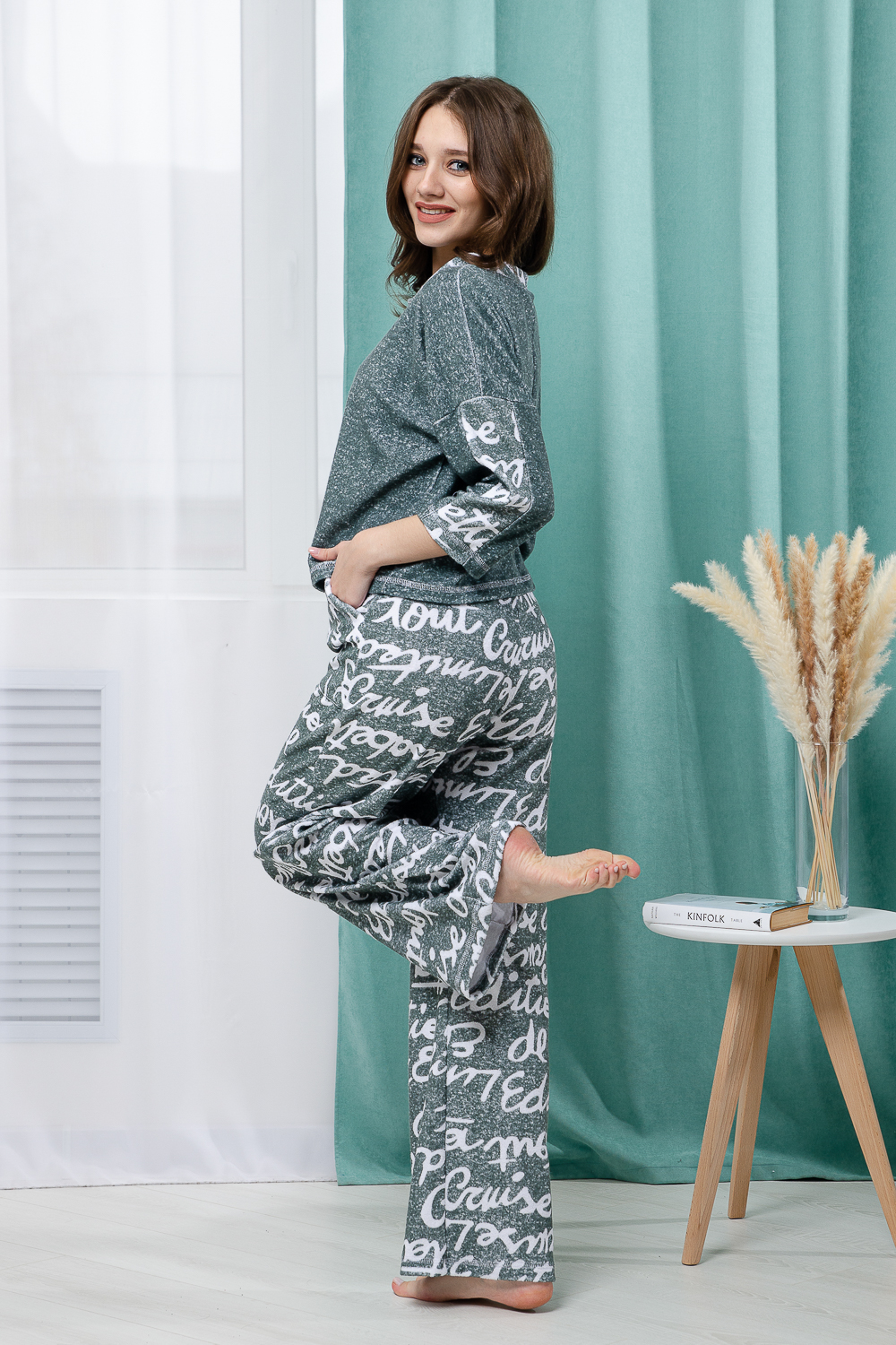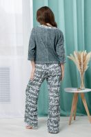 Костюм состоит из туники и брюк. Туника прямого силуэта, со спущенной проймой, с округлой горловиной. Рукав длинной 3/4, со вставкой из отделочного полотна вдоль рукава. Горловина обработана обтачкой из отделочного полотна, со шнуром. Брюки прямые, свободные, на поясе, с боковыми накладными карманами.