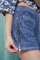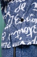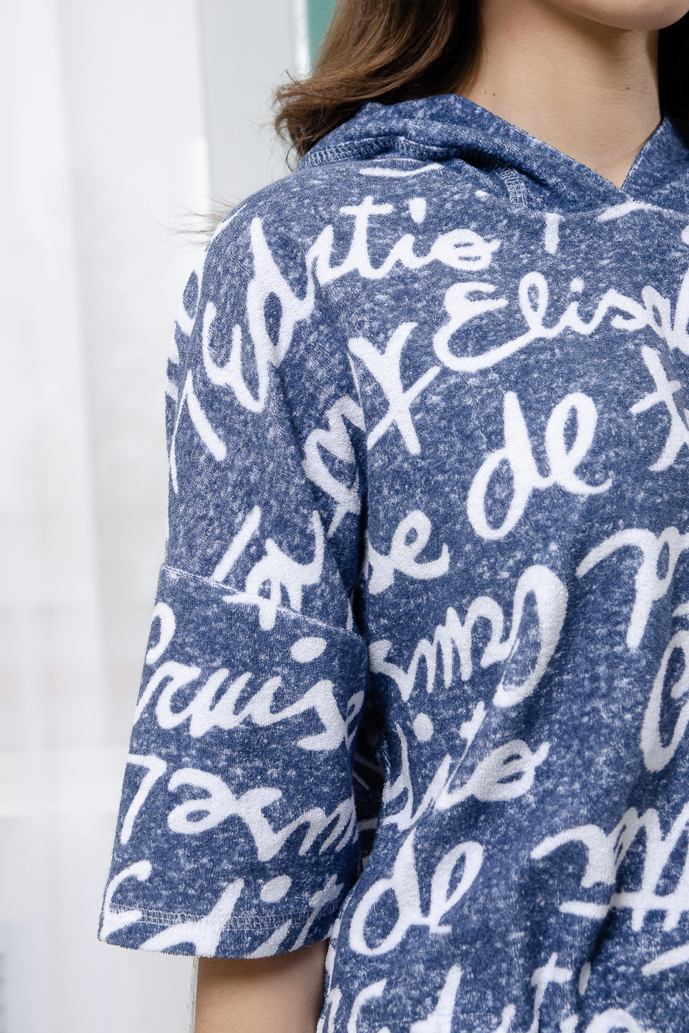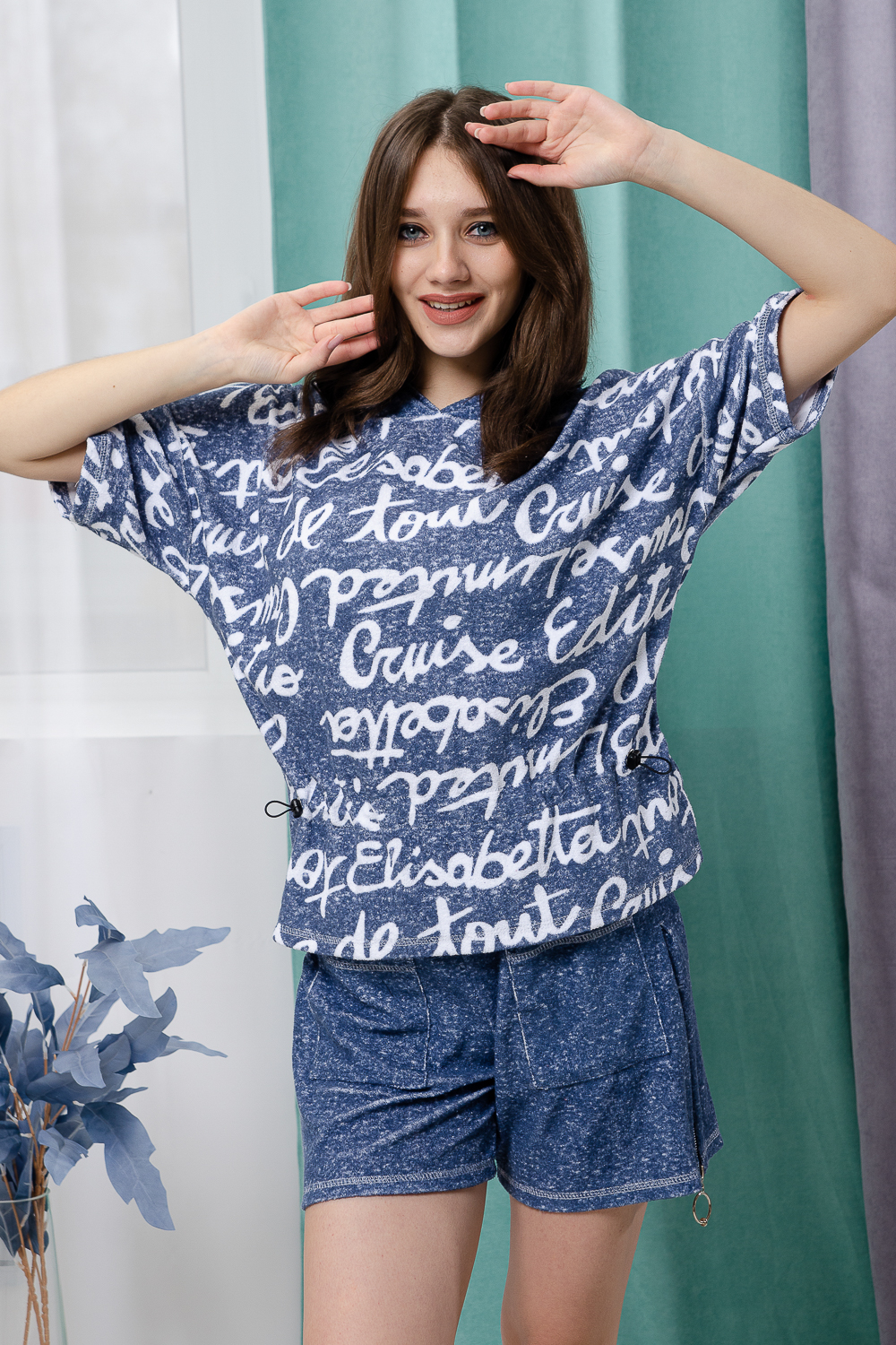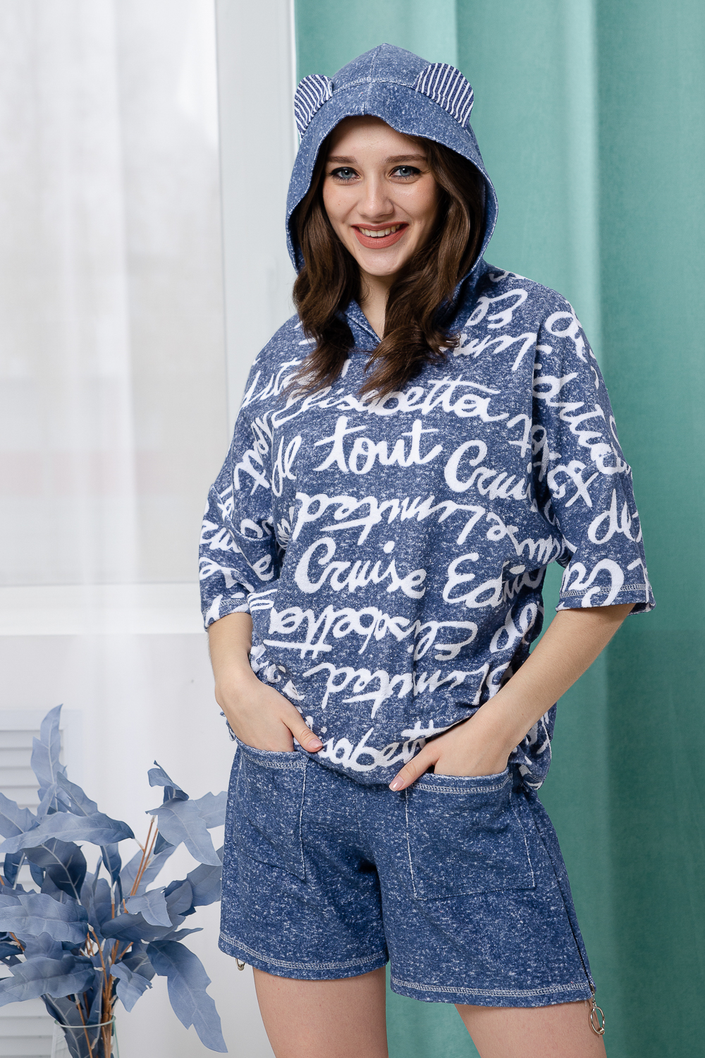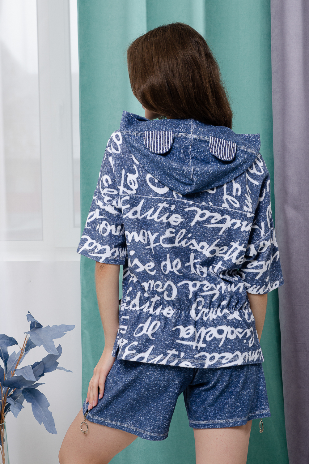 Костюм состоит из туники и шорт. Туника прямая, свободная, с резинкой по талии, с ушками на капюшоне, с разрезами в нижней части боковых швов. Рукав короткий. Шорты прямые, на поясе, с накладными карманами спереди. Вдоль боковых швов расположены молнии.