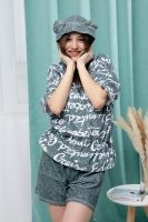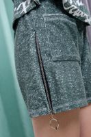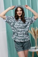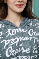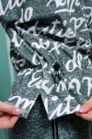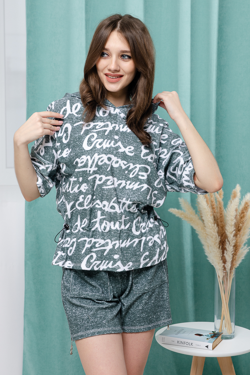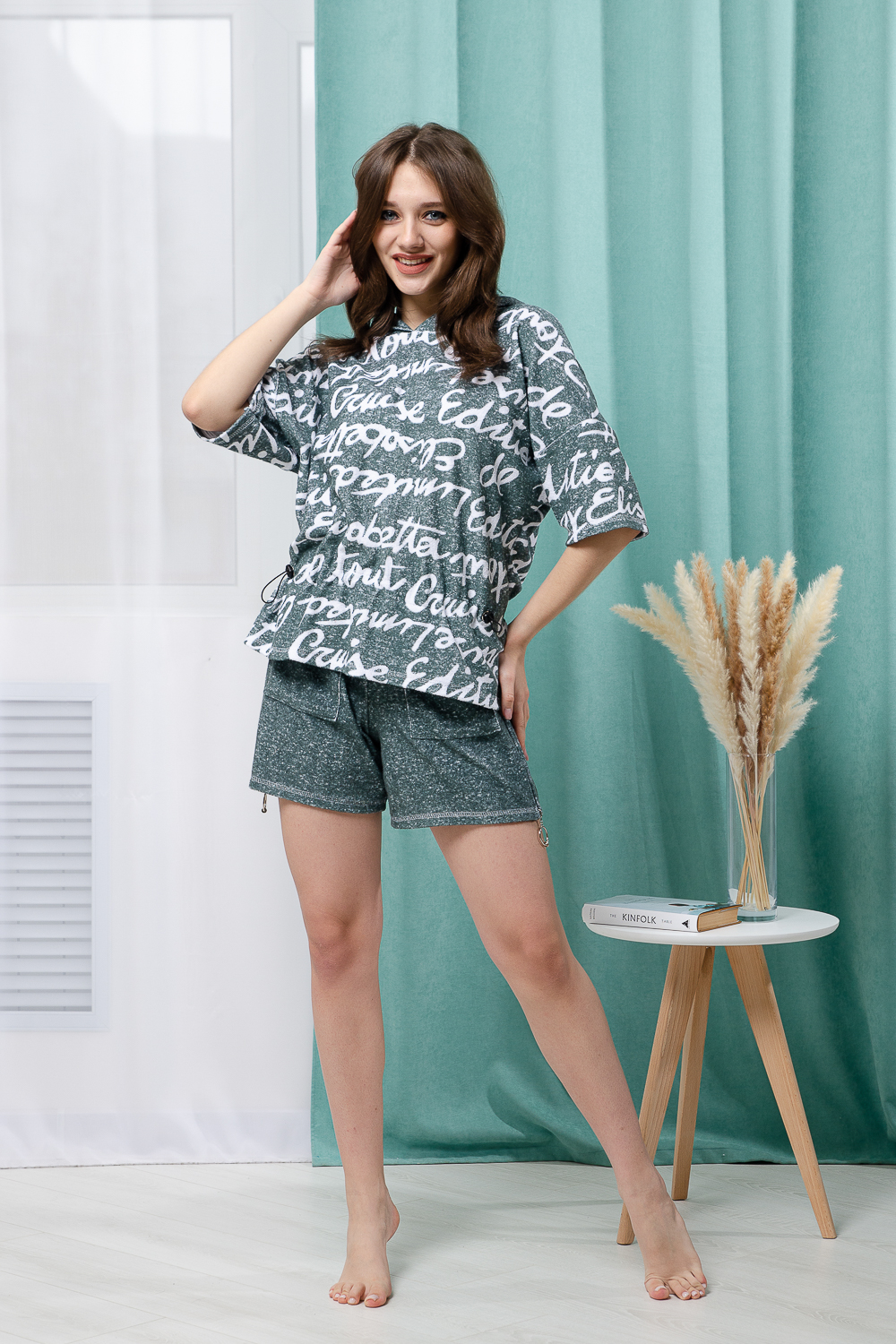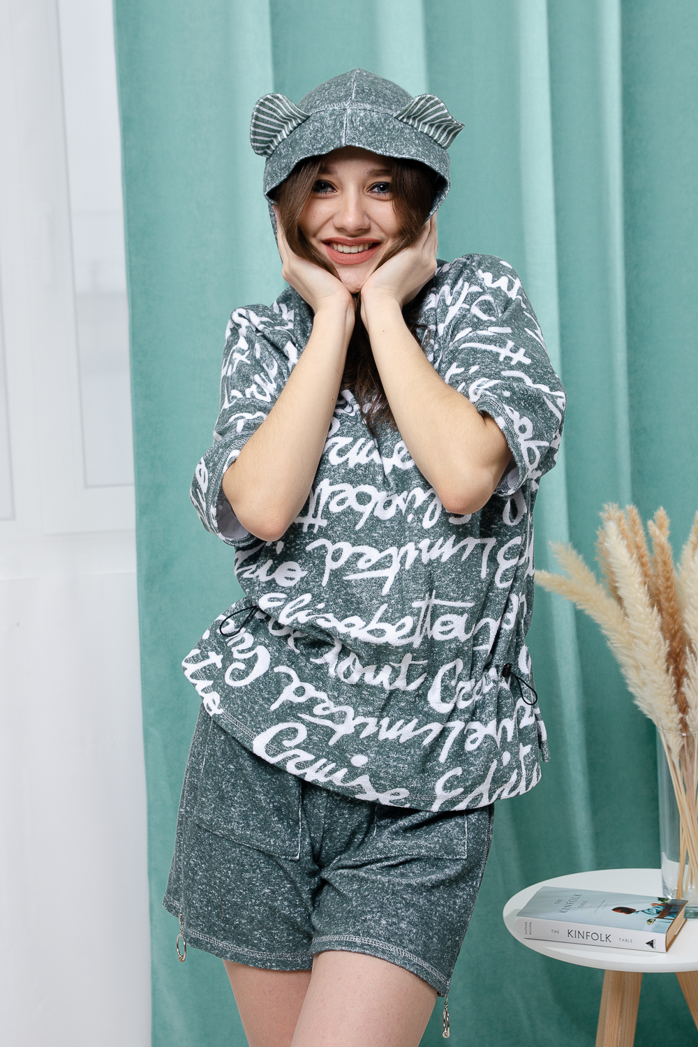 Костюм состоит из туники и шорт. Туника прямая, свободная, с резинкой по талии, с ушками на капюшоне, с разрезами в нижней части боковых швов. Рукав короткий. Шорты прямые, на поясе, с накладными карманами спереди. Вдоль боковых швов расположены молнии.