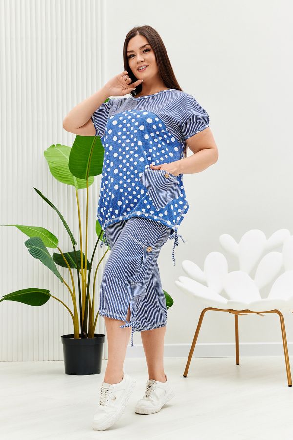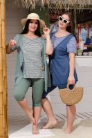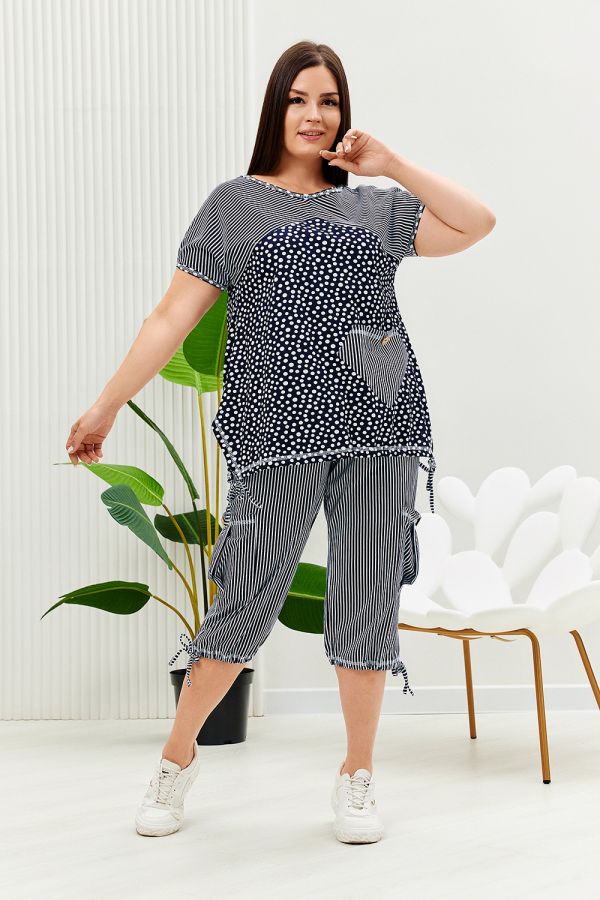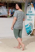 Костюм женский "тройка": Футболка, жилет, бриджи. Футболка с округлым вырезом, короткими рукавами и разрезами в боковых швах. Жилет прямого силуэта. Полочка и спинка из двух частей: верхней и нижней. Застежка на одну декоративную кокосовую пуговицу на уровне линии талии. Бриджи облегающие из х/б ткани с лайкрой.