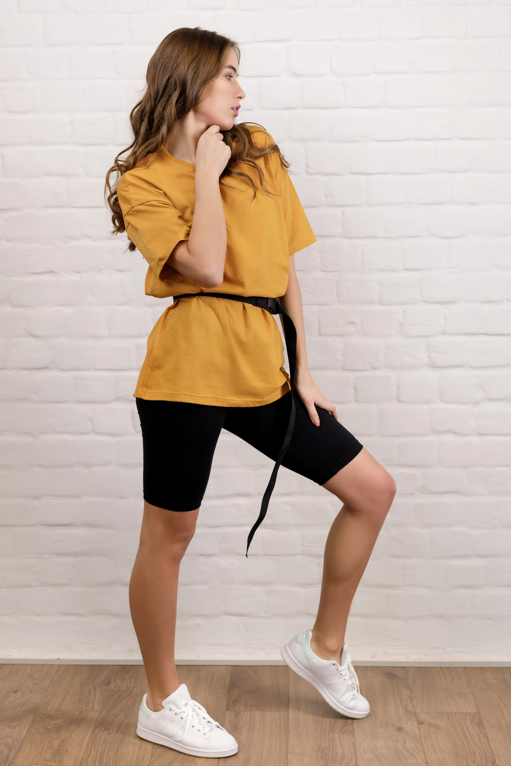 Женский костюм с велосипедками - самая популярная модель этого года. В костюм женский входит футболка оверсайз в разных оттенках, черные велосипедки и стильный черный пояс с застежкой. Футболку женскую можно использовать как самостоятельный элемент Вашего гардероба с джинсами, спортивным костюмом. Футболка изготовлена из кулирки 100% хлопок. Низ - облегающие плотные черные бриджи с высокой посадкой. Велосипедки изготовлены из кулирки с добавлением эластана.