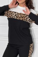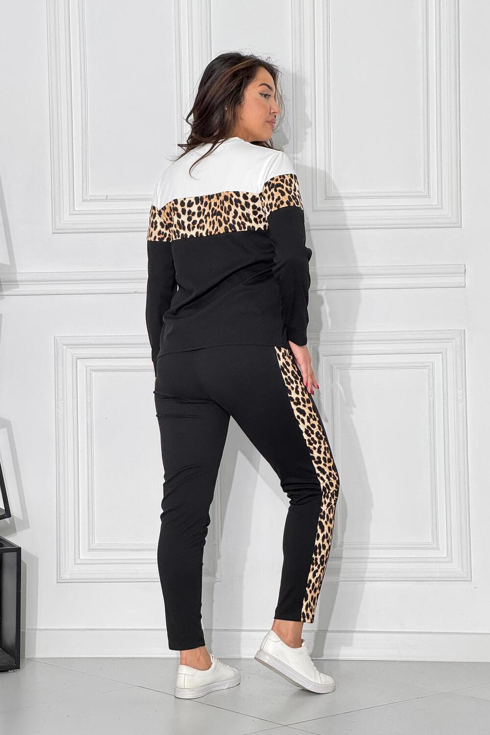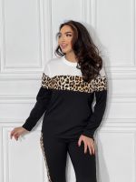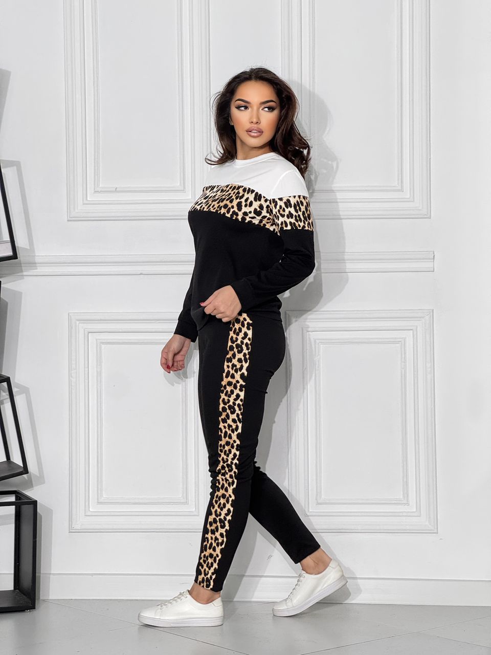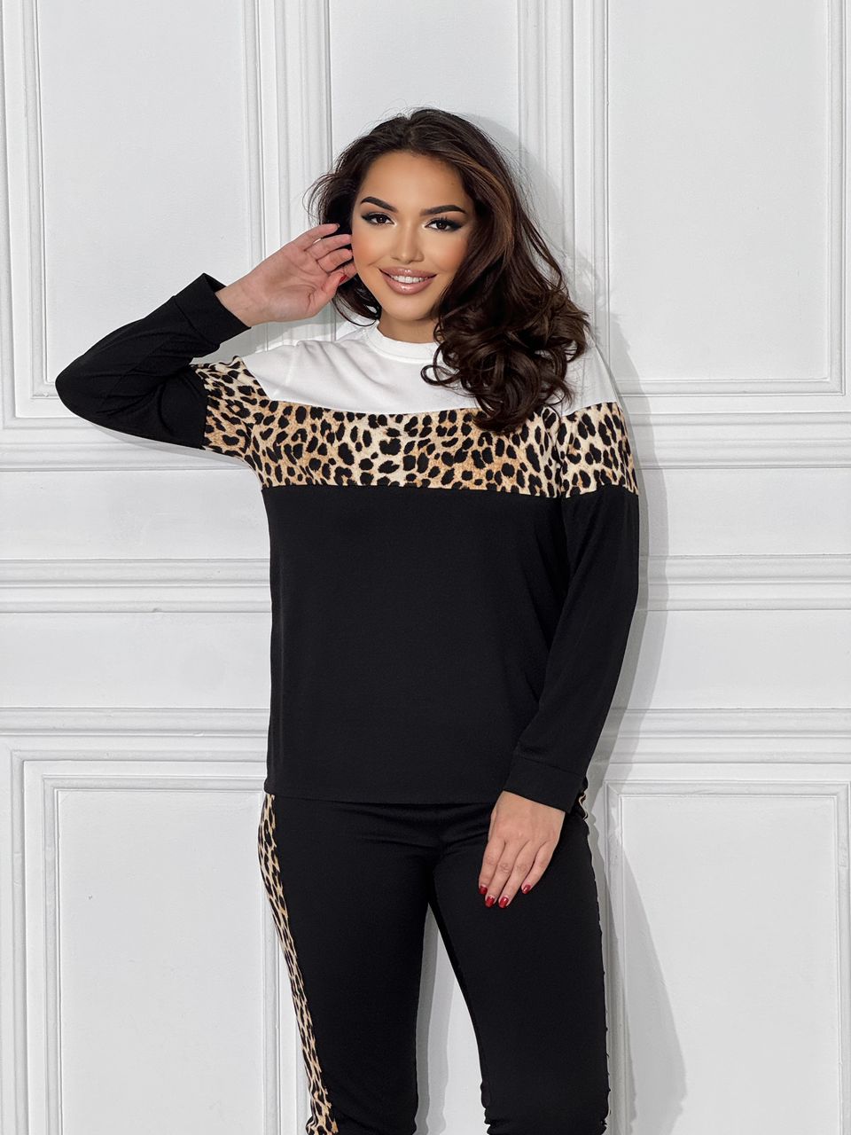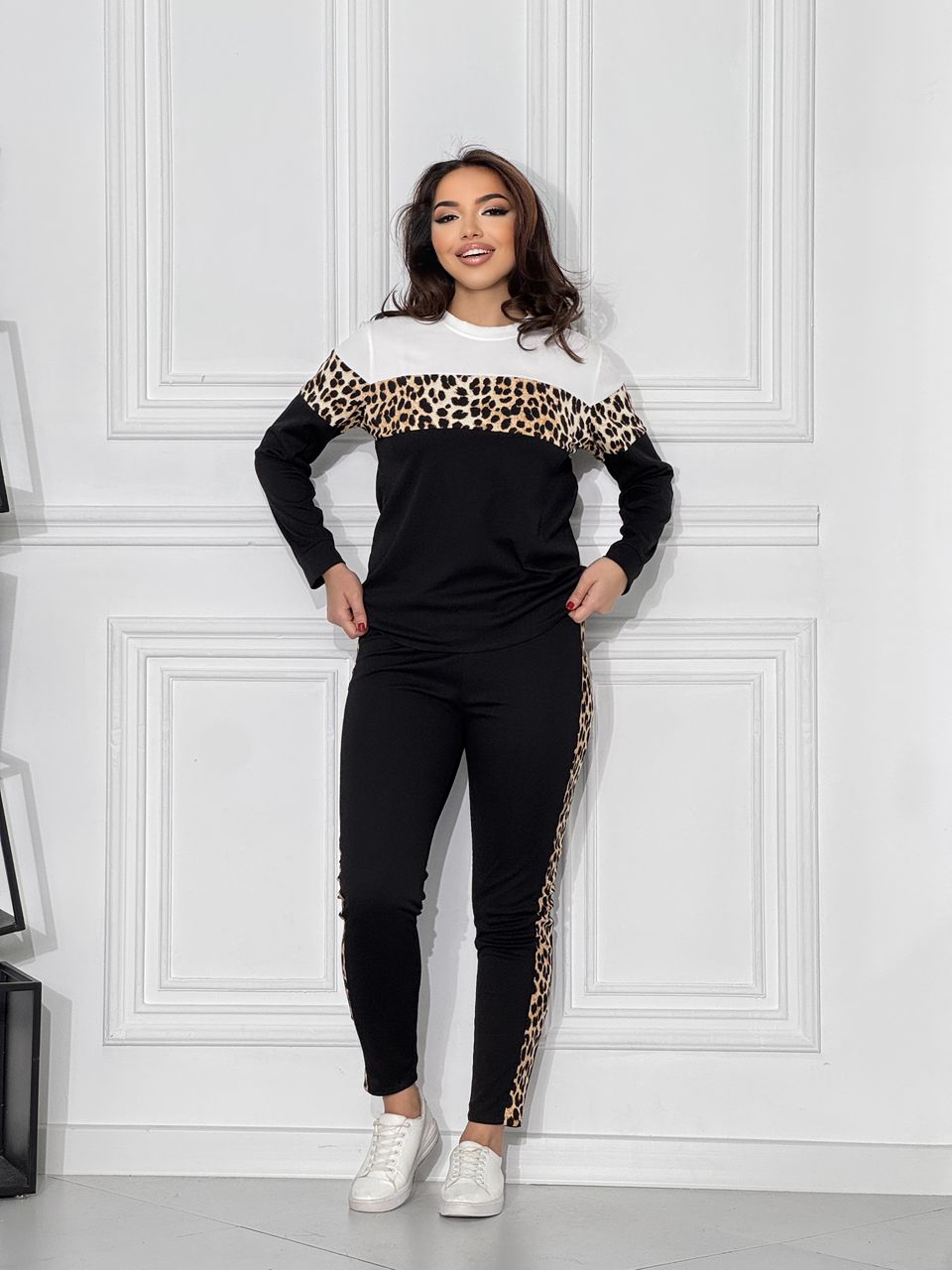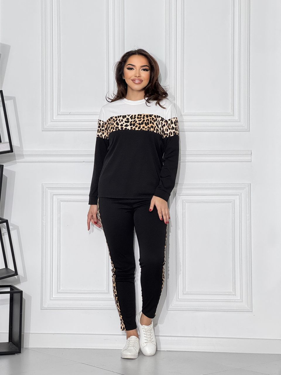 Представляем вашему вниманию новый женский костюм-лапша. Двойка состоит из кофты с длинным рукавом и зауженных штанов на резинке. Сочетание черного цвета и принта леопард создает красивый и эстетичный вид, который идеально подходит для осенне – весеннего и летнего периода. Брючный костюм лапша женский из тонкого дышащего трикотажа. Не мнется и не вытягивается, прост в уходе, поэтому Вы всегда будете выглядеть женственно и элегантно! Отсутствие застежек делает этот комплект идеальным решением для беременных женщин - будущим мамам. Красивый костюм в рубчик с зауженными штанами – базовый повседневный элемент. Свободный, с небольшим эффектом оверсайз, костюм лапша подойдет для дома и офиса, работы, учебы и поездок.
