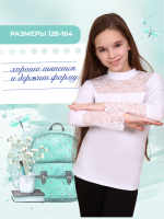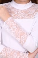 Блузка для девочек младшего и старшего школьного возраста, из трикотажного полотна – однотонная кулирка с лайкрой и кружева (дизайн и ширина кружева может меняться). Блузка прилегающего силуэта, с втачным рукавом, с воротником – стойкой. Спереди отрезная кокетка из кружева. На спинке отсутствуют линии членения. Рукав длинный одношовный. По низу рукава настрочено широкое кружево. Низ изделия подогнут.