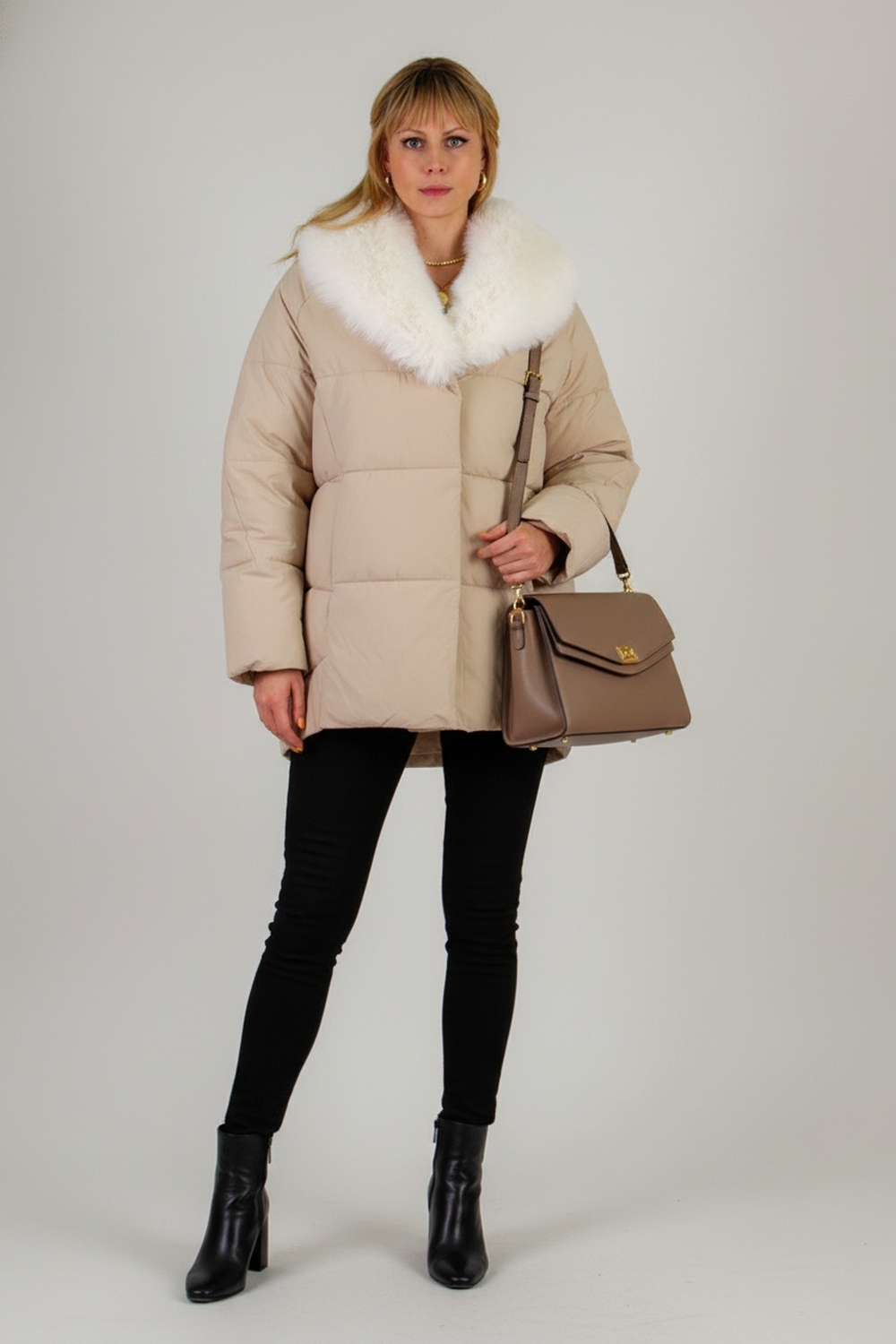 Стильная Куртка с меховым воротником арт.6677 — это идеальное сочетание модного кроя, функциональности и максимального тепла для зимы и «евро-зимы». Выполненная из плотной матовой ткани, куртка надёжно защищает от ветра и осадков, а грязь и волосы с неё легко стряхнуть: материал не притягивает загрязнения и сохраняет безупречный внешний вид на протяжении всего сезона. Ключевая деталь – съёмный воротник из качественного искусственного меха белого контрастного цвета. Он придаёт образу нотку элегантности и роскоши. Воротник легко снимается, позволяя видоизменять образ под настроение. Застёжка-молния дополняется скрытой утеплённой планкой на кнопках, что препятствует проникновению холода внутрь. Внутренняя отделка оснащена файбер-наполнителем: продуманная простёжка исключает сминание и скопление утеплителя в отдельных зонах, обеспечивая равномерное тепло по всему объёму куртки. Практичность конструкции проявляется в двух боковых карманах с кнопками, куда удобно складывать мелкие предметы и согревать руки, а также в внутреннем кармане на липучке для смартфона или документов. Трикотажные манжеты на рукавах защищают от продувания и удерживают тепло близко к телу, создавая дополнительный комфорт даже в сильный мороз. Модель средней длины идеально подходит для активного городского ритма: за рулём автомобиля или в общественном транспорте вы будете чувствовать себя легко и свободно. Актуальный современный силуэт, визуально удлиняет ноги и гармонично смотрится как с джинсами, так и с юбкой или платьем. Куртка доступна в двух универсальных оттенках — строгом чёрном и утончённом бежевом. Лёгкая, тёплая и практичная, она станет надёжным спутником в холодный сезон, позволяя сочетать комфорт, защиту от непогоды и элегантный образ.
