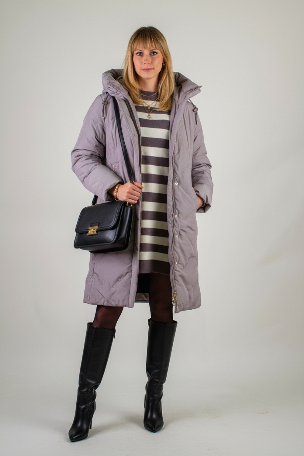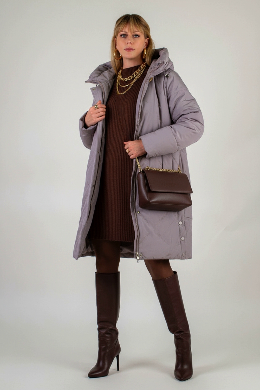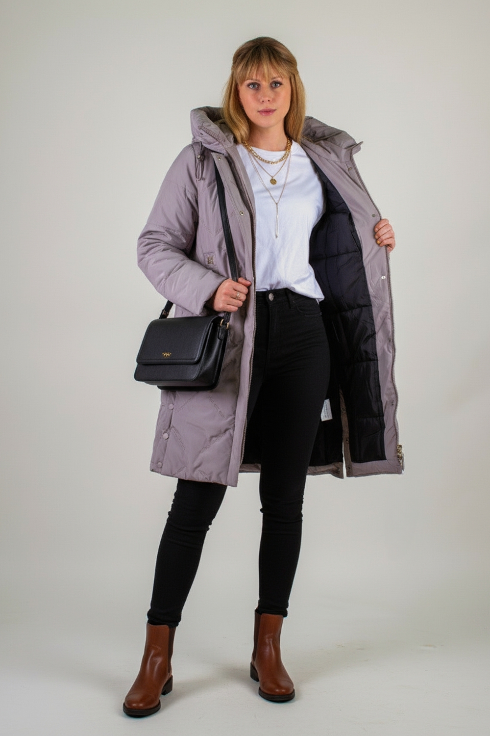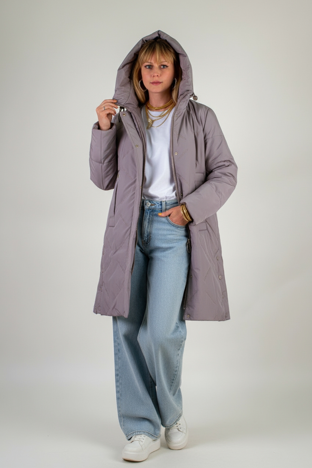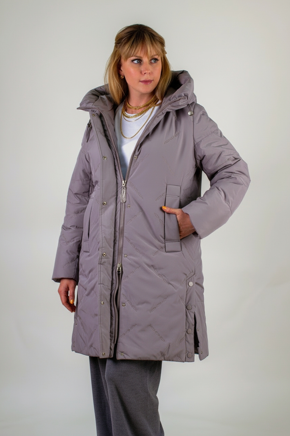 Представляем вашему вниманию зимнюю удлинённую куртку «Арт.316» длиной 95 см – идеальное сочетание изысканного стиля, инновационных технологий и первоклассного утепления. Эта модель создана специально для суровых зим и европейских морозов: в её утеплителе соединены два слоя – натуральная верблюжья шерсть и лёгкий, «дышащий» файбер. Надёжная строчка каждой секции гарантирует равномерное распределение тепла без «пробелов» и комков, сохраняя при этом вес куртки минимальным. Куртка до ?30 °C, она подарит вам комфорт даже в самые морозные дни. Особое внимание в дизайне уделено капюшону с высоким воротником-стойкой на удобных фиксаторах: он надёжно защитит от ветра и метели, не стесняя движений. Застёжка-молния дублируется утеплённой планкой на кнопках, что исключает продувание и придаёт модели благородный вид. По бокам предусмотрены два вместительных кармана на кнопках, а ещё один скрытый внутренний карман позволит сохранить ваши ценности в тепле и безопасности. Ткань куртки обработана водо- и грязеотталкивающей пропиткой: сняв её с вешалки, вы забудете о проблеме налипшей грязи, каплях влаги или шерсти домашних питомцев. При этом материал необычайно приятен на ощупь, а ультрасовременная вышивка вместо традиционной стёжки придаёт поверхности оригинальную текстуру и объём без утяжеления. Модель представлена в трёх благородных оттенках: нежная светлая сирень, подчёркивающая женственность и лёгкость образа; универсальный светло-бежевый и глубокий тёмно-бежевый,- гармонируют с любыми аксессуарами и обувью. Элегантный, современный крой «Арт.316» продуман до мелочей: по бокам снизу расположены разрезы на кнопках – они позволяют легко сесть в автомобиль или зайти в городской транспорт. Качественный пошив, надёжная фурнитура и продуманная конструкция делают эту куртку безупречным выбором для тех, кто ценит тепло, комфорт и безупречный стиль в любых погодных условиях. Ощутите всю роскошь camel-wool технологии и современного дизайна вместе с моделью «Арт.316» На модели так же представлено: Женская туника арт. 1991