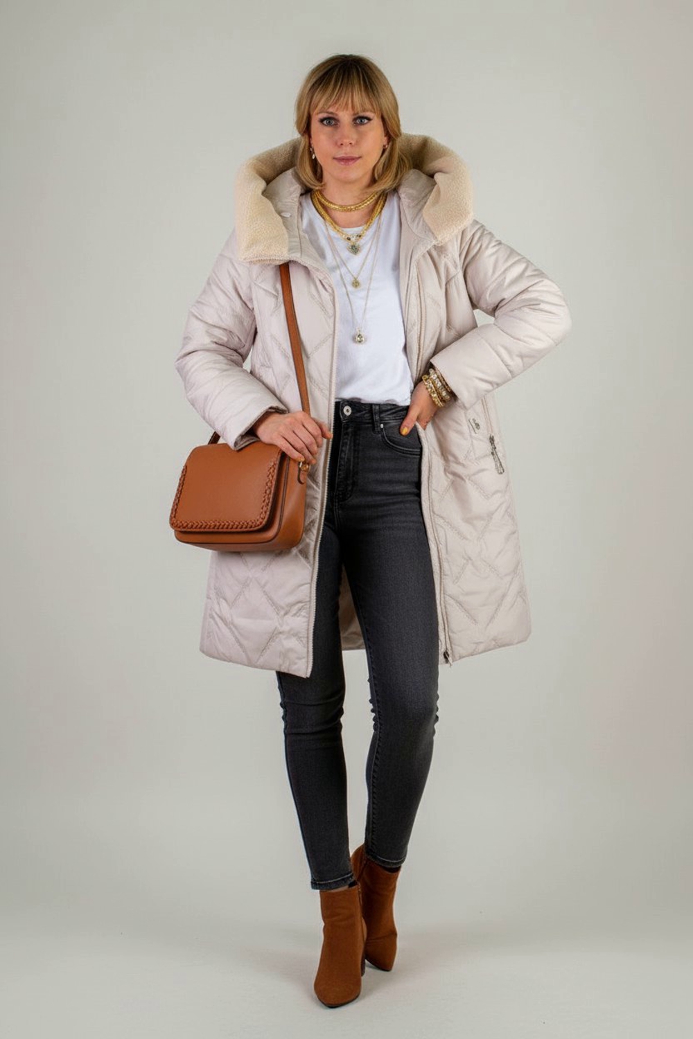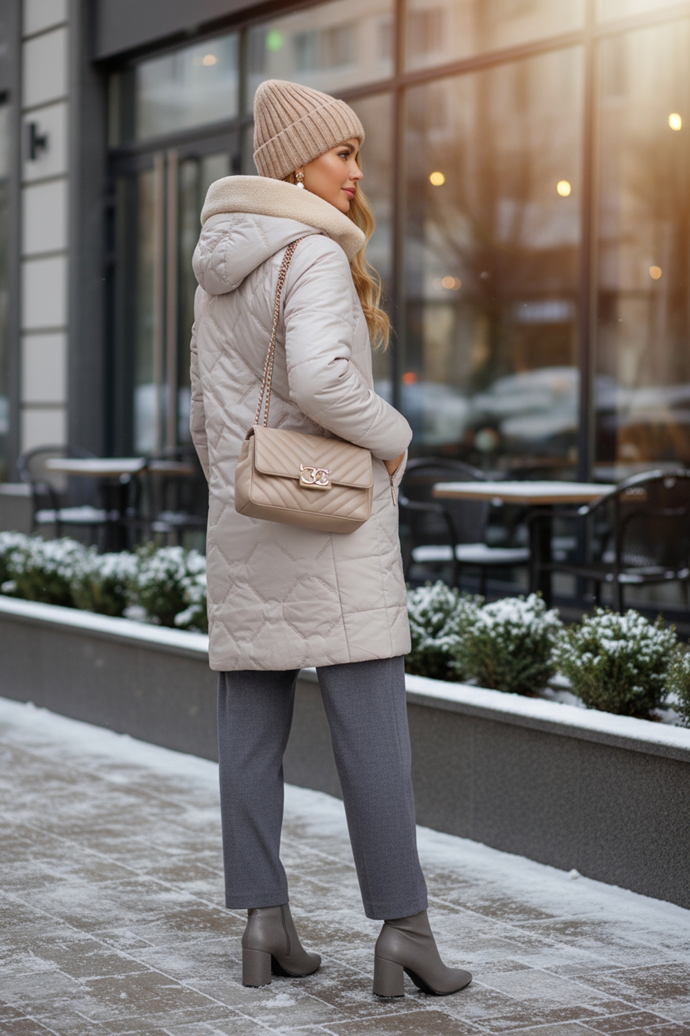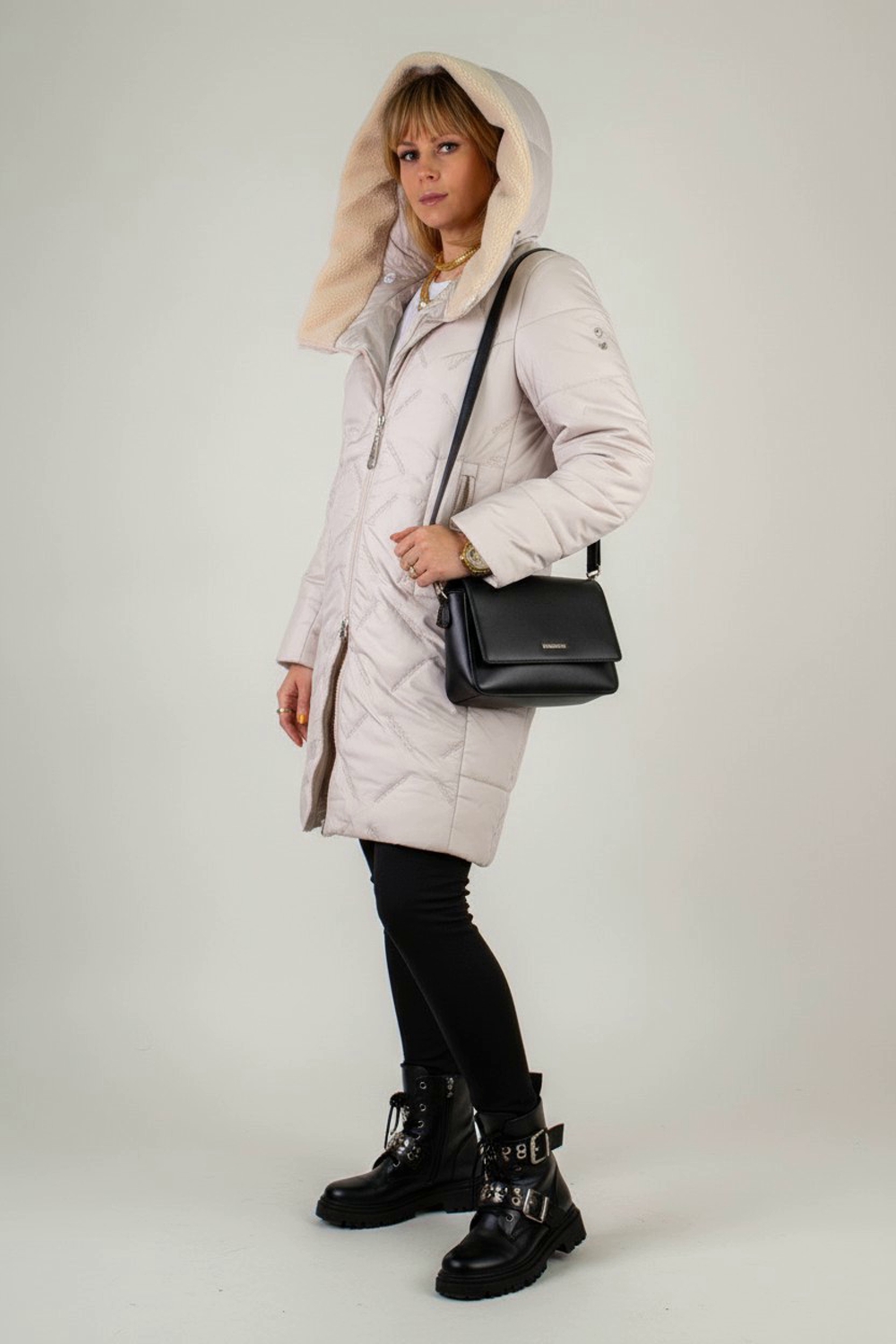 Зимняя удлинённая куртка с верблюжьей шерстью «Арт.320» длиной 92 см, в которой продуманы все детали для комфорта в ходные дни. Эта модель создана специально для суровых зим и европейских морозов: в её утеплителе соединены два слоя – натуральная верблюжья шерсть и лёгкий, «дышащий» файбер. Надёжная строчка каждой секции гарантирует равномерное распределение тепла без «пробелов» и комков, сохраняя при этом вес куртки минимальным. Элегантный силуэт и современный крой подчёркивают фигуру, а продуманная функциональность делает модель незаменимой в повседневной городской жизни и для загородных прогулок в морозы. Утепление двойное – натуральная верблюжья шерсть плюс высокотехнологичный файбер – обеспечивает идеальный баланс тепла и лёгкости. Оба слоя надёжно проложены строчкой-стежком по инновационной технологии. На верхнем слое ультрасовременная вышивка вместо традиционной стёжки придаёт поверхности оригинальную текстуру и объём без утяжеления: такой подход исключает сбивание наполнителя и сохраняет равномерное распределение тепла по всей поверхности изделия. Особая изюминка дизайна – капюшон с асимметричным воротником-стойкой. По краям воротника – пушистая меховая оторочка, которая органично обрамляет лицо и надёжно защищает от ветра. Восточный акцент смещённой застёжки-молнии на внутренней планке придаёт образу динамичность и оригинальность. Для удобства и безопасности вещей на куртке предусмотрено два боковых кармана на молнии и скрытый внутренний карман с утеплённой подкладкой. Все фурнитурные элементы – высокого качества: молнии плавно скользят, кнопки не тугие и нескрипучие, а швы прочны и аккуратны. Материал верха обработан водо- и грязеотталкивающей пропиткой: вода скатывается каплями, грязь и шерсть домашних питомцев не прилипают, а чистка куртки занимает минимум времени. Ткань приятна на ощупь, сохраняет мягкость даже при температуре ниже нуля, а ультрасовременная вышивка вместо традиционной стёжки добавляет объёма и фактуры без лишнего веса. Модель доступна в двух благородных оттенках: лёгкая и нежная светлая сирень придаёт образу романтичность и свежесть, а универсальный светло-бежевый гармонирует с любыми аксессуарами и обувью. Куртка «Арт.320» – это сочетание утончённого городского стиля, продвинутых технологичных решений и безупречного качества пошива. Ощутите тепло натуральной шерсти и надёжную защиту от зимы в каждой детали