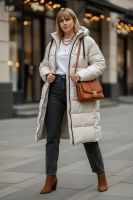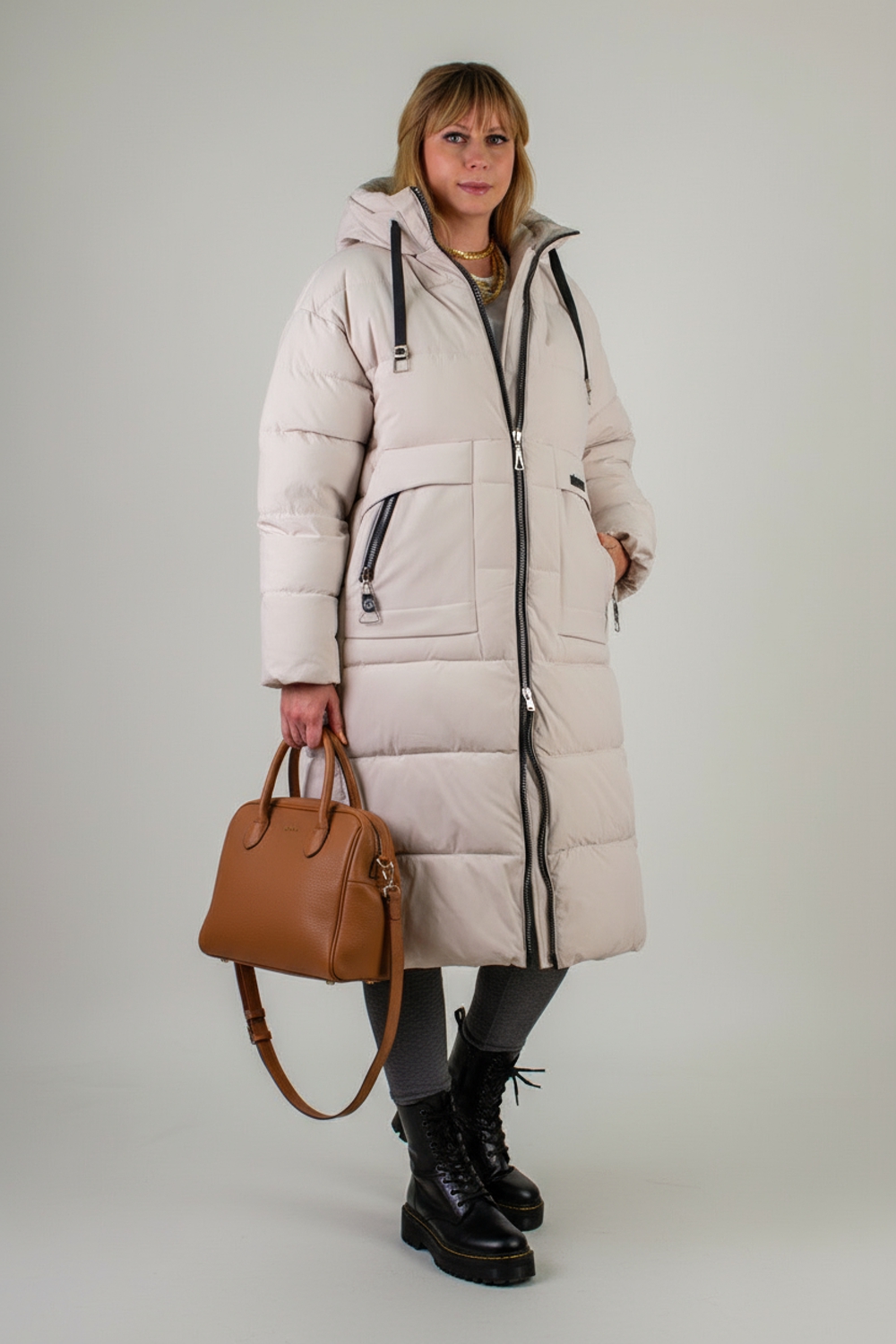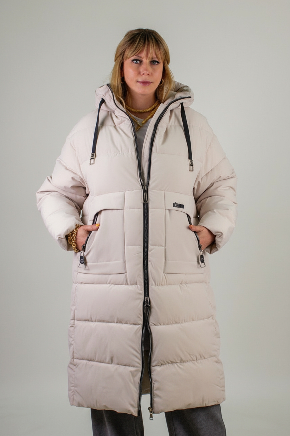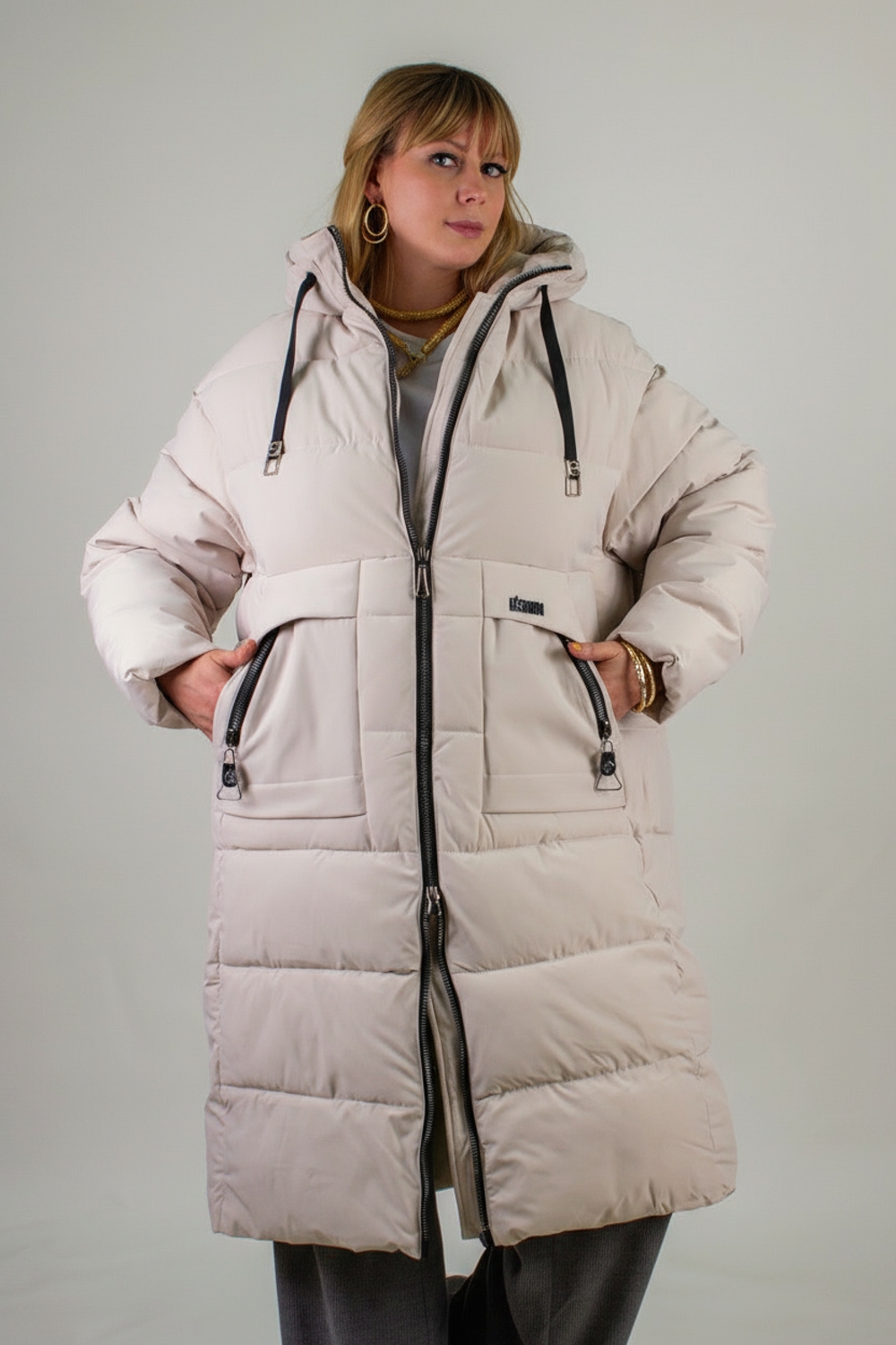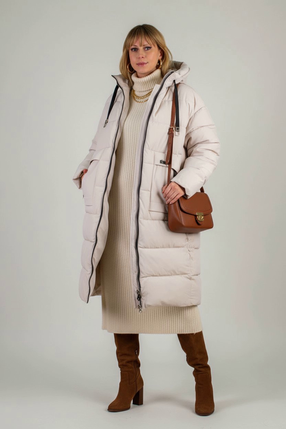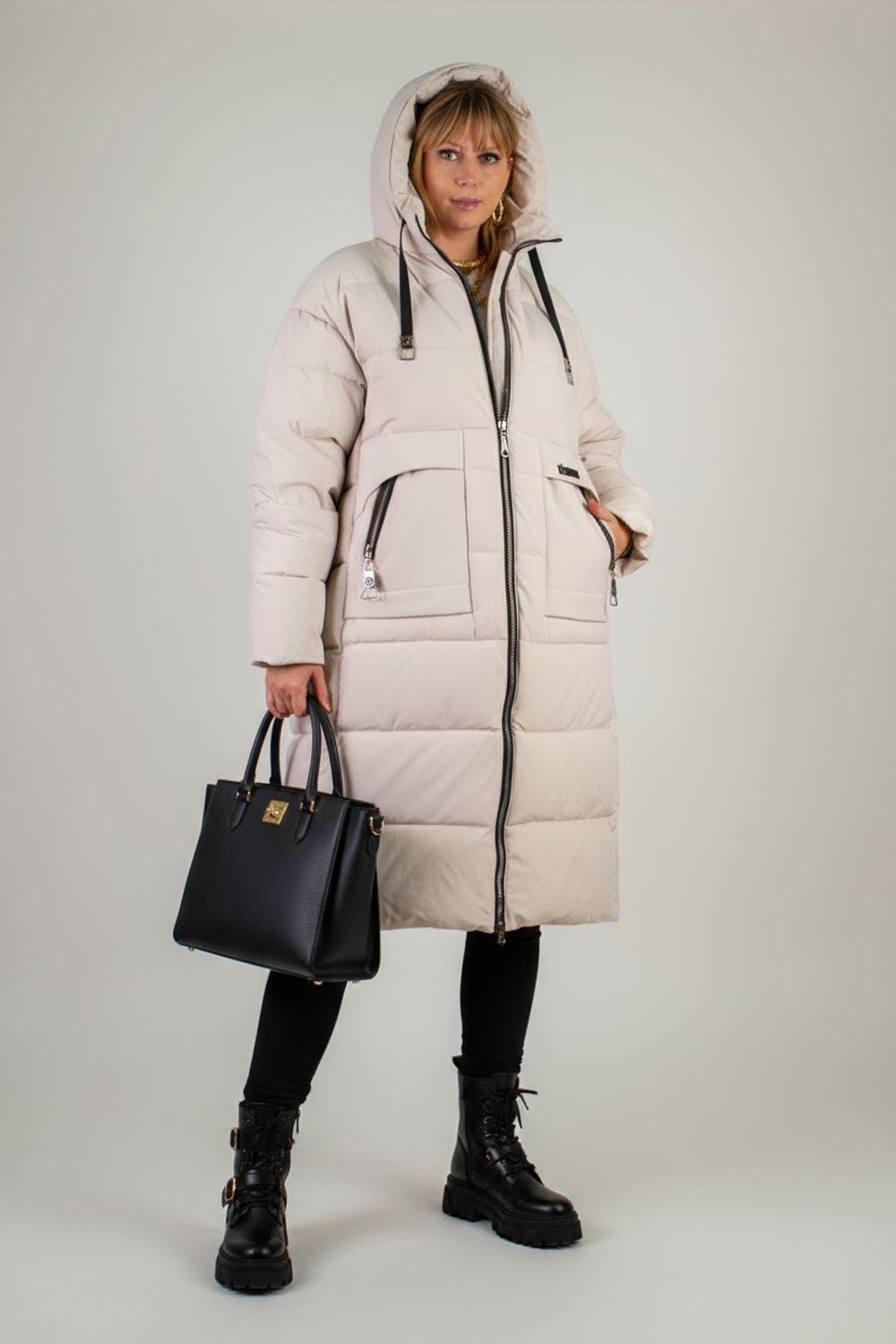 Зимняя куртка больших размеров арт. 2829 с высоким воротником-стойкой и двусторонней молнией – идеальное сочетание высокого качества, продуманного комфорта и актуального дизайна. Удлинённая модель свободного кроя опускается ниже колен, обеспечивая надёжную защиту от ветра и холода в суровые морозы. Матовая ткань высокого качества отличается повышенной износостойкостью и стойкостью к влаге, сохраняя безупречный внешний вид при активном режиме носки и позволяет оставаться сухой и опрятной при любом погодном сюрпризе, будь то дождь, мокрый снег или коварная слякоть. Куртка простегана равномерным стежком (не ультрастеп) – это гарантированная ровная фиксация утеплителя по всему объёму, без образования «холодных зон». В качестве наполнителя используется современный синтетический файбер: он лёгкий, хорошо сохраняет тепло и не впитывает влагу. Подкладка выдержана в точном цвете внешнего материала, что придаёт изделию цельный и завершённый вид изнутри. Практичность модели усилена продуманными деталями: • капюшон на завязках легко подгоняется под форму головы, защищая от ветра; • внутренняя планка за молнией не допускает продувания и придаёт изделию аккуратность; • манжеты на рукавах плотно облегают запястье, не давая холоду проникнуть внутрь. Для хранения вещей предусмотрены большие карманы асимметричной формы с кнопками и украшены молниями. А потайной внутренний кармашек станет надёжным хранилищем для телефона, кошелька или документов. Современный актуальный крой, удобная посадка и продуманная длина позволяют сочетать модель с любыми комплектами одежды: от повседневных джинсов до элегантного делового стиля. Куртка арт. 2829 – это универсальное решение для тех, кто ценит комфорт, тёплую защиту и безупречный внешний вид даже в самых экстремальных зимних условиях. Независимо от того, отправляетесь ли вы на прогулку по городу, в загородную поездку или встречаете праздник на свежем воздухе, эта куртка станет надёжным спутником и подчеркнёт вашу уверенность в любой ситуации.