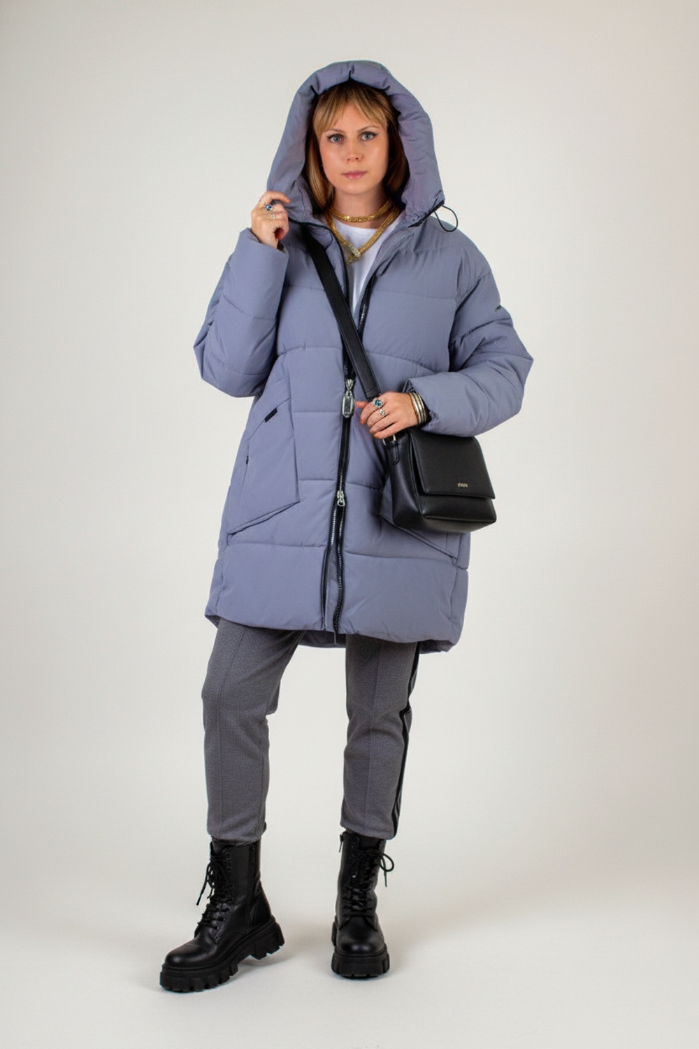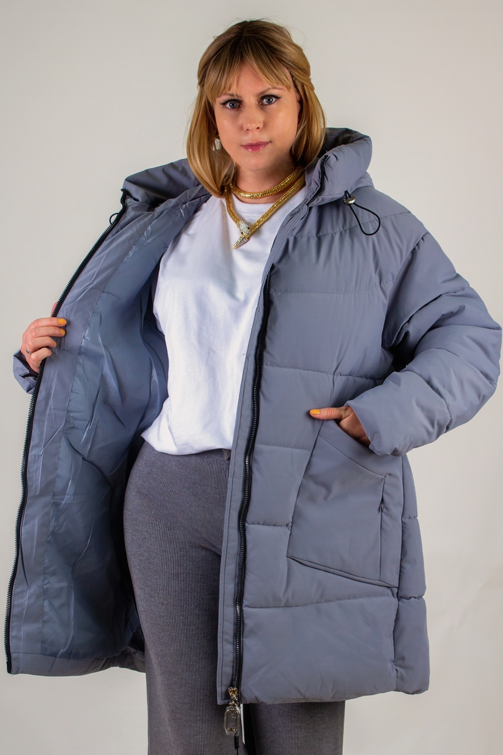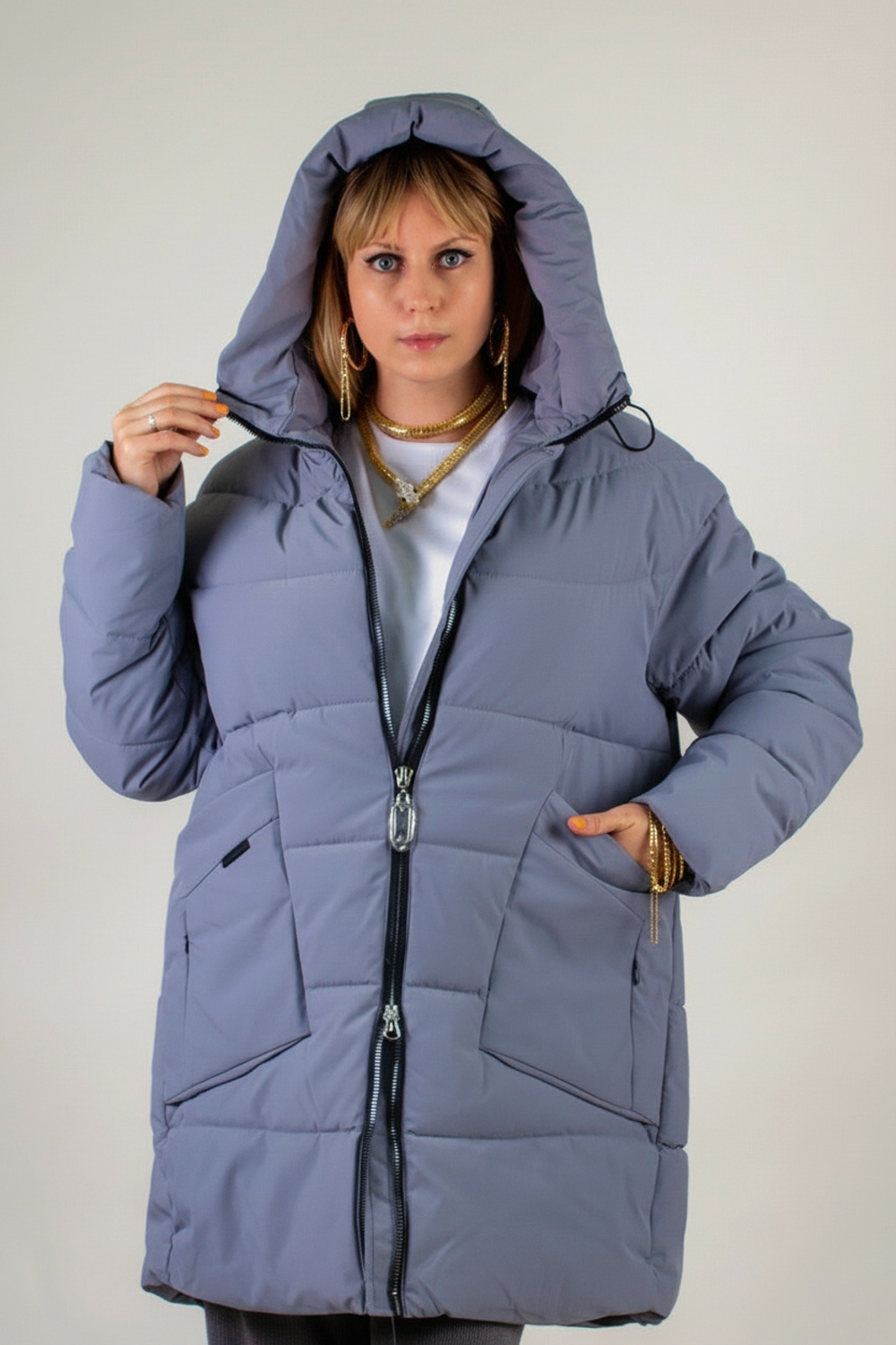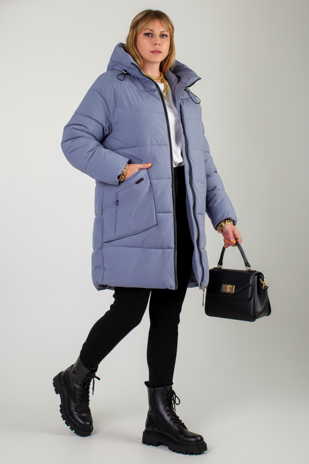 Зимняя куртка больших размеров арт. 2832 – оптимальное сочетание актуального дизайна, продуманного функционала и комфорта в холодное время года. Эта модель создана специально для женщин, ценящих свободу движений и стильный внешний вид. Особенности куртки: • Застёжка-молния с внутренней ветрозащитной планкой – защищает от ветра и снега, а двусторонний бегунок позволяет регулировать посадку при движении и в автомобиле. • Равномерно распределённый утеплитель «файбер» и простёганная (не ультрастеп) конструкция исключают образование холодных зон и сохраняют объёмный теплоэффект на протяжении всего сезона. • Два накладных кармана с декоративными клапанами скрывают за собой два боковых тайных кармана – удобное решение для хранения смартфона, ключей и мелочей. • Трикотажные манжеты на рукавах плотно прилегают к запястью, не дают холодному воздуху проникать внутрь. • Глубокий капюшон с фиксаторами и высокий воротник-стойка обеспечивают дополнительную защиту от ветра и снега. • Внутренний карман на молнии – для безопасного хранения документов и денег. Материал и качество: – Верх из плотной матовой ткани, легко очищается от грязи, пыли и шерсти домашних животных. – Наполнитель «файбер» – лёгкий и тёплый утеплитель, сохраняет форму и не скатывается. – Безупречный пошив, прочная фурнитура прослужат не один сезон. Цветовые решения – универсальный светло-бежевый и практичный серый. Удлинённая линия силуэта визуально вытягивает фигуру и надёжно защищает бедра от холода. Модель подходит для зимнего и «евро-зима» сезонов: вы не почувствуете ни капли дискомфорта при температуре до –25 °C при правильном базовом слое одежды. Куртка арт. 2832 – это стильный базовый элемент гардероба, который легко сочетать с джинсами, брюками и юбками. Будьте уверены: в ней вы будете выглядеть элегантно и чувствовать себя максимально тепло и уютно в любых условиях! На модели так же представлено: Женская туника арт. 1991