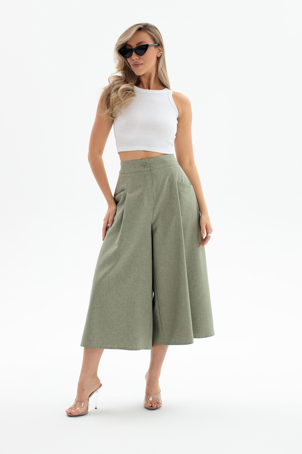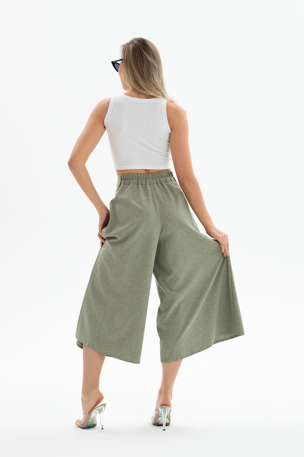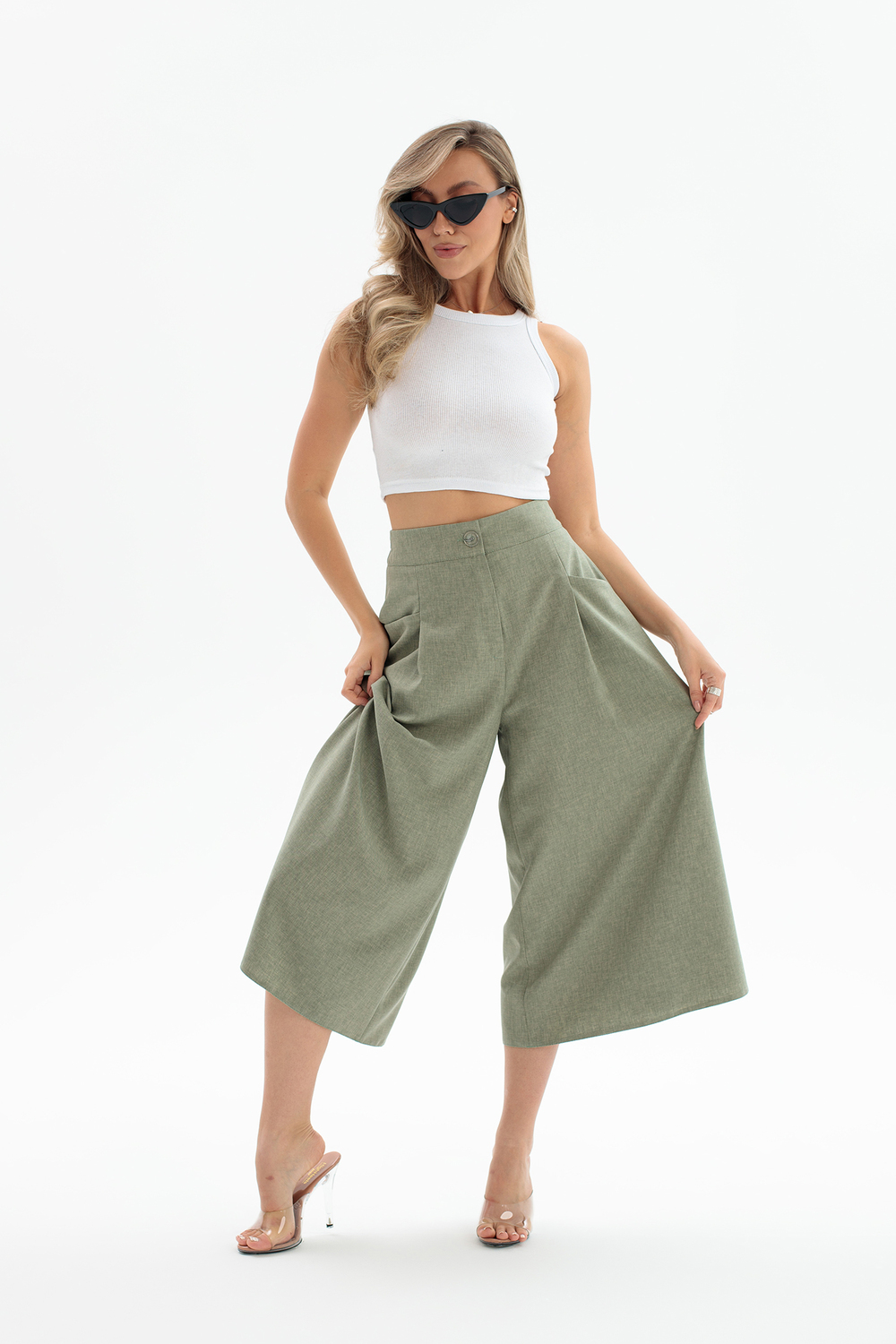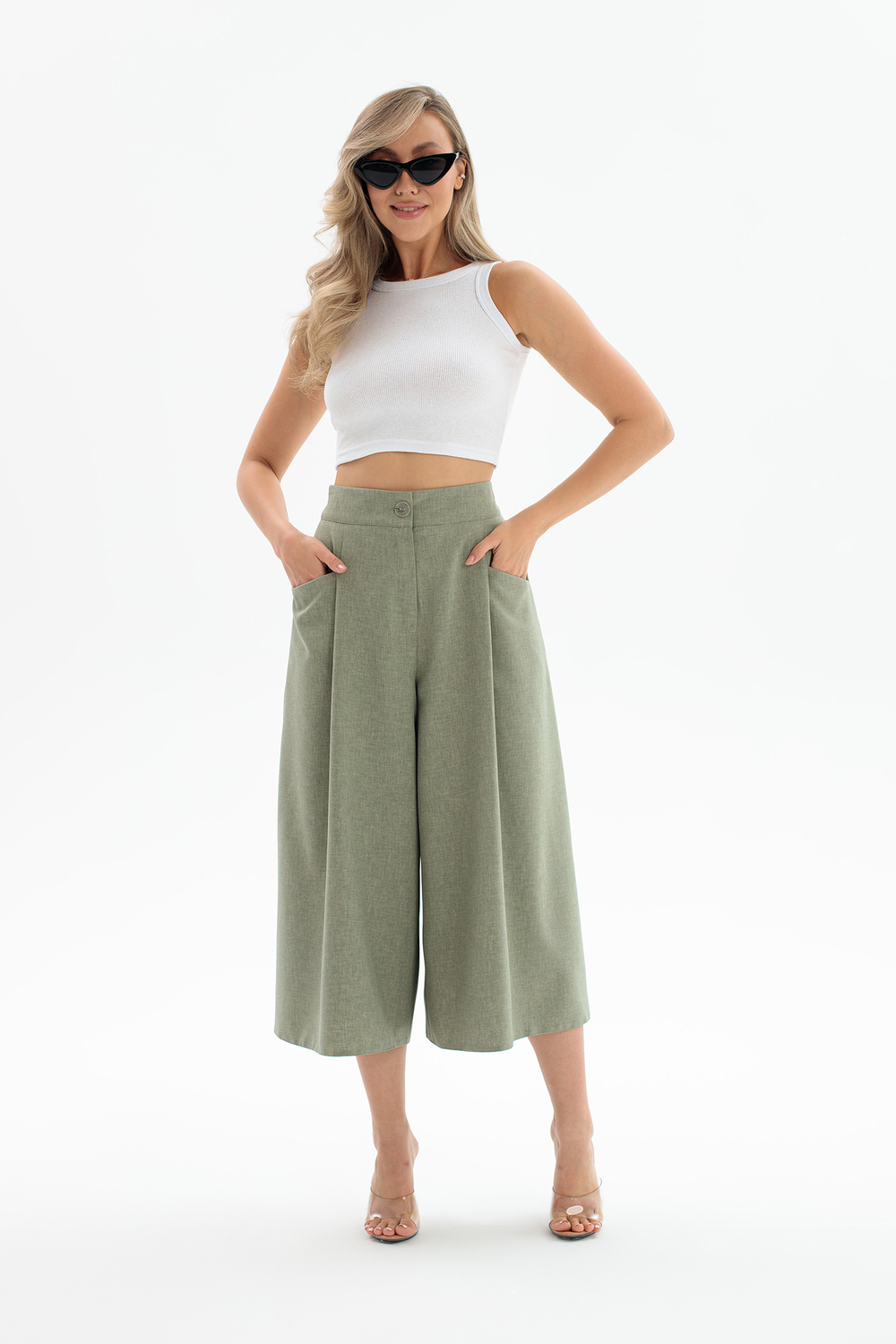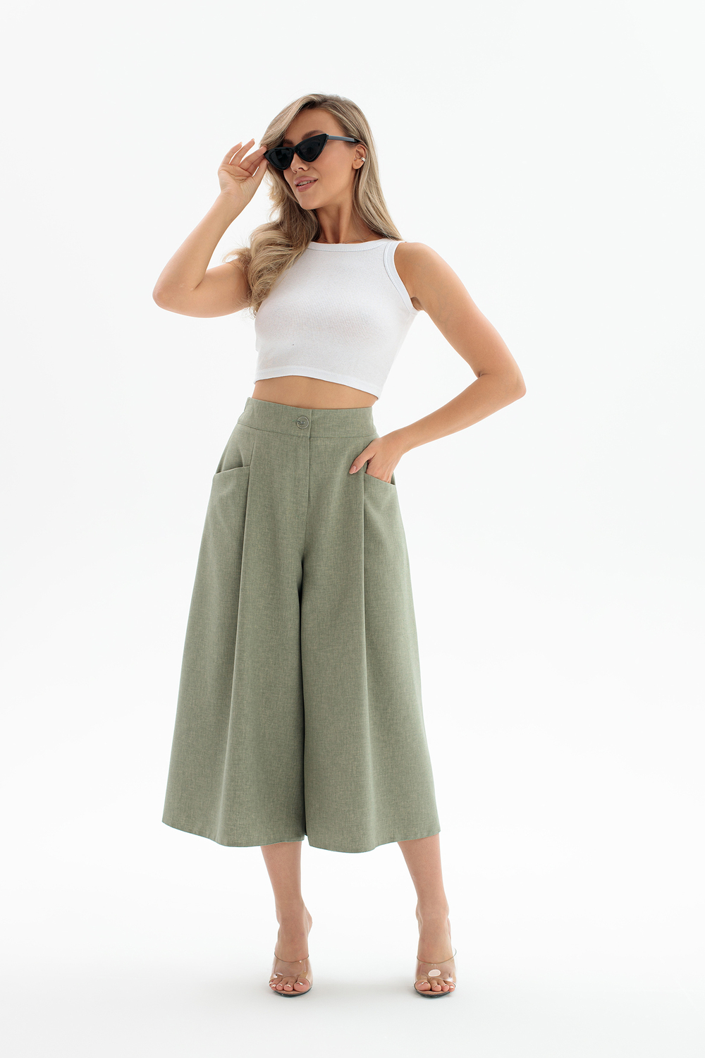 Укороченные широкие брюки - кюлоты с карманами и резинкой на талии подойдут женщинам любой комплекции и возраста. Комбинируя с различным верхом и обувью можно кардинально менять образ от строгого делового до расслаблено неформального.