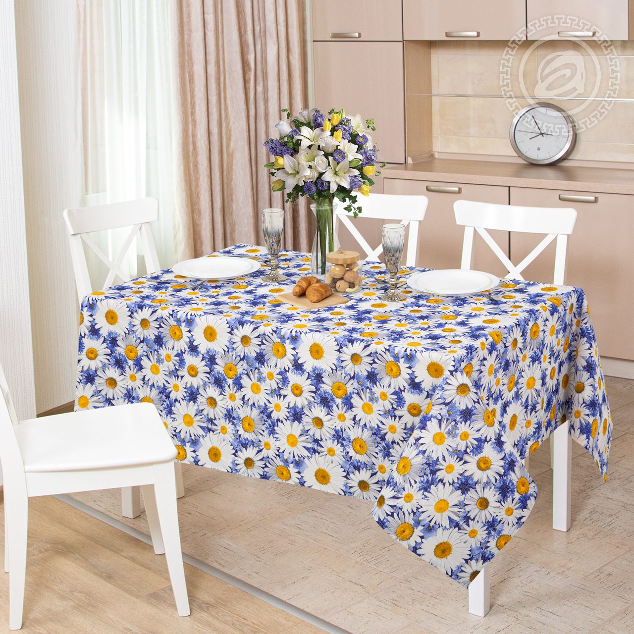 Как чудесен «Летний букет»! Он полон очарования, элегантности и изящества. Здесь нежные фиалки и чарующие ромашки, которые так напоминают о солнышке, теплом дуновении ветерка, неспешных летних прогулках и завораживающих пейзажах. Скатерть рогожка с волшебной цветочной композицией дарит ощущение спокойствия и уюта. А для единства стиля на кухне хорошо сочетаются скатерти и полотенца из рогожки «Летний букет», которые будут радовать вас каждый день.