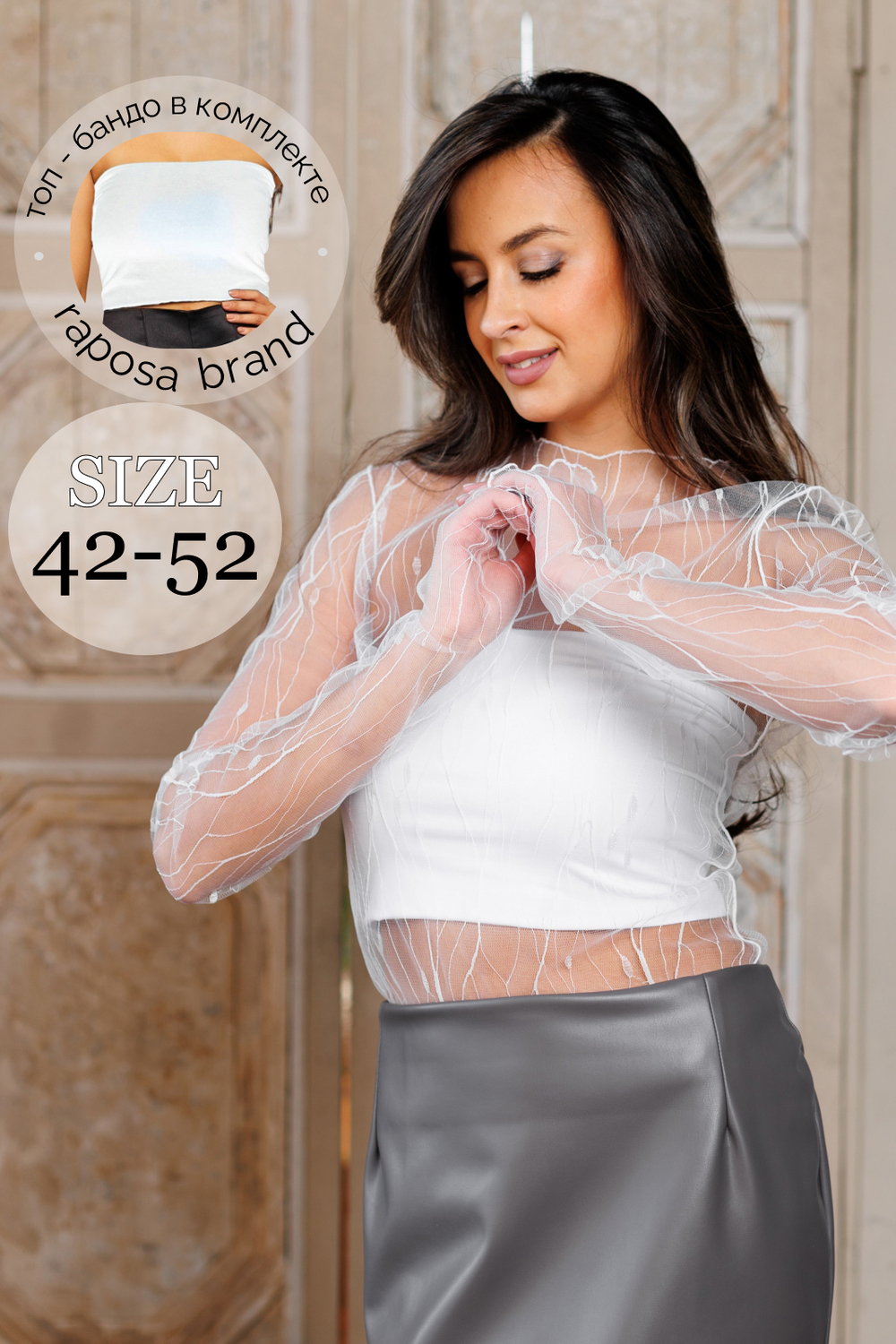 Лонгслив сетка и топ бандо - идеальное сочетание комфорта и стиля, созданное специально для модных женщин, которые ценят неповторимость. Уникальный женский топ бандо станет незаменимым предметом гардероба, доступным и практичным решением для создания яркого и неповторимого образа. Красивый женский полупрозрачный лонгслив – не просто обычная блузка, а настоящая находка для тех, кому важно выглядеть стильно и модно. Эта кофта женская сделана из качественной сетки, которая несомненно подчеркивает женскую красоту и изящество. Длинные рукава с вырезом под пальцы придают особый шарм и утонченность, добавляет неповторимости Вашему образу. Блузка нарядная, идеально подходит для особых случаев, вечеринок и торжественных мероприятий, на свадьбу 2025 или девичник, подружкам невесты, выпускной 9, 11 класс, День рождения. Ее элегантный дизайн и прекрасные отделочные элементы делают эту кофточку женскую невероятно воздушной и невесомой. Вы будете притягивать восхищенные взгляды своим образом. Прозрачный топ идеально сочетается с любыми брюками, юбками или джинсами. Он дополнит Ваш образ и добавит ему изюминку. Вы сможете создать необыкновенные ансамбли и быть в центре внимания. Блузка вечерняя подарит возможность проявить свою индивидуальность и выразить свой уникальный стиль. Для тех, кто ценит качество и комфорт, этот нарядный топ станет настоящим открытием. Мягкая и приятная на ощупь ткань позволит чувствовать себя комфортно в течение всего дня. Вы сможете наслаждаться каждым моментом, не ограничивая себя в движении. charme топ изготовлен из плотной ткани, которая обеспечивает особую поддержку и плотно облегает тело. НЕ БОЙТЕСЬ РАСТЯГИВАТЬ его, ведь он специально создан для удобства и комфорта. Водолазка прозрачная с длинным рукавом –не просто одежда, это настоящая история о красоте и стиле. Выбирайте креативное решение - блузку с длинными рукавами. Будьте яркими и неповторимыми вместе с этим уникальным праздничным лонгсливом - сеткой. Водолазка паутинка от бренда Raposa.