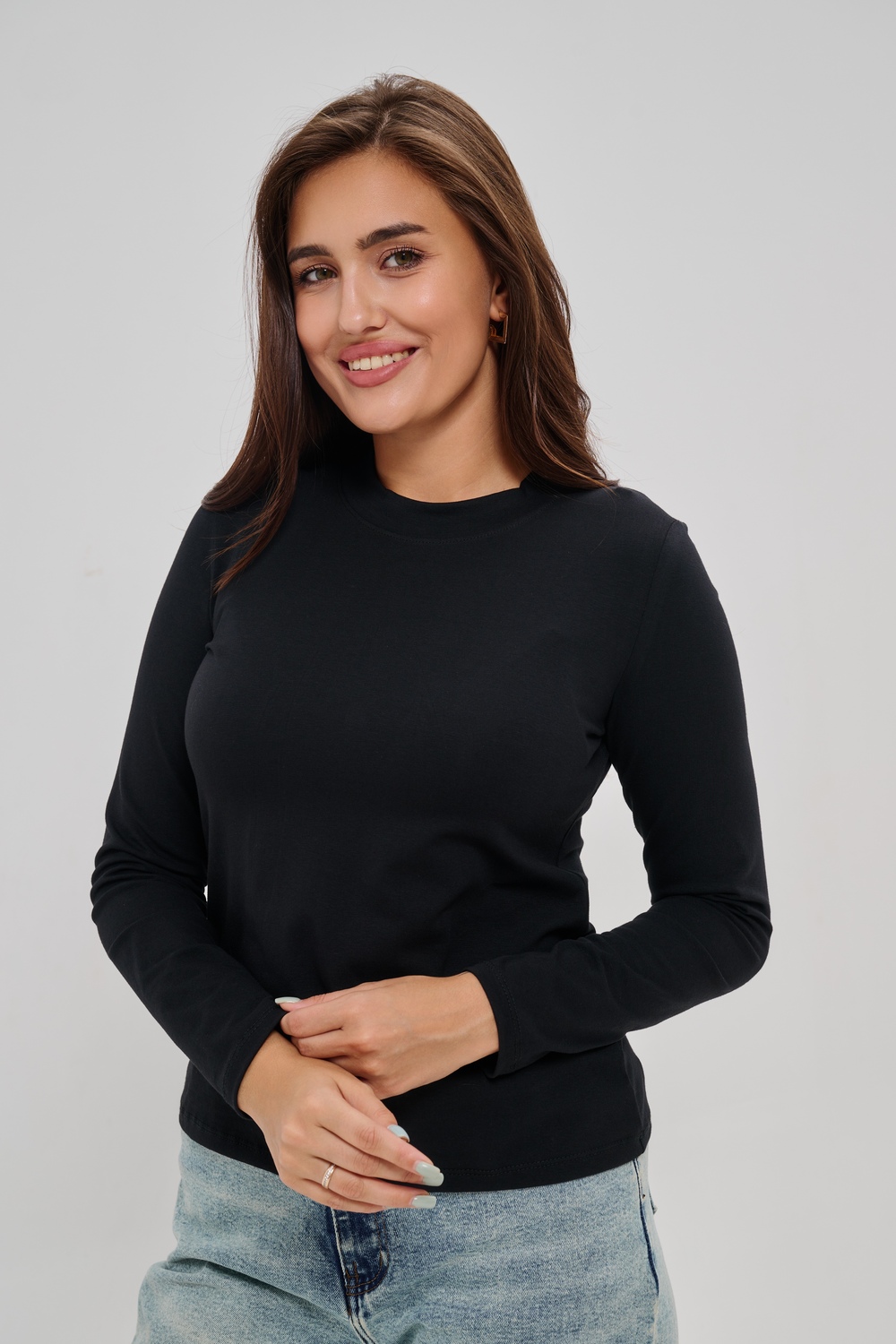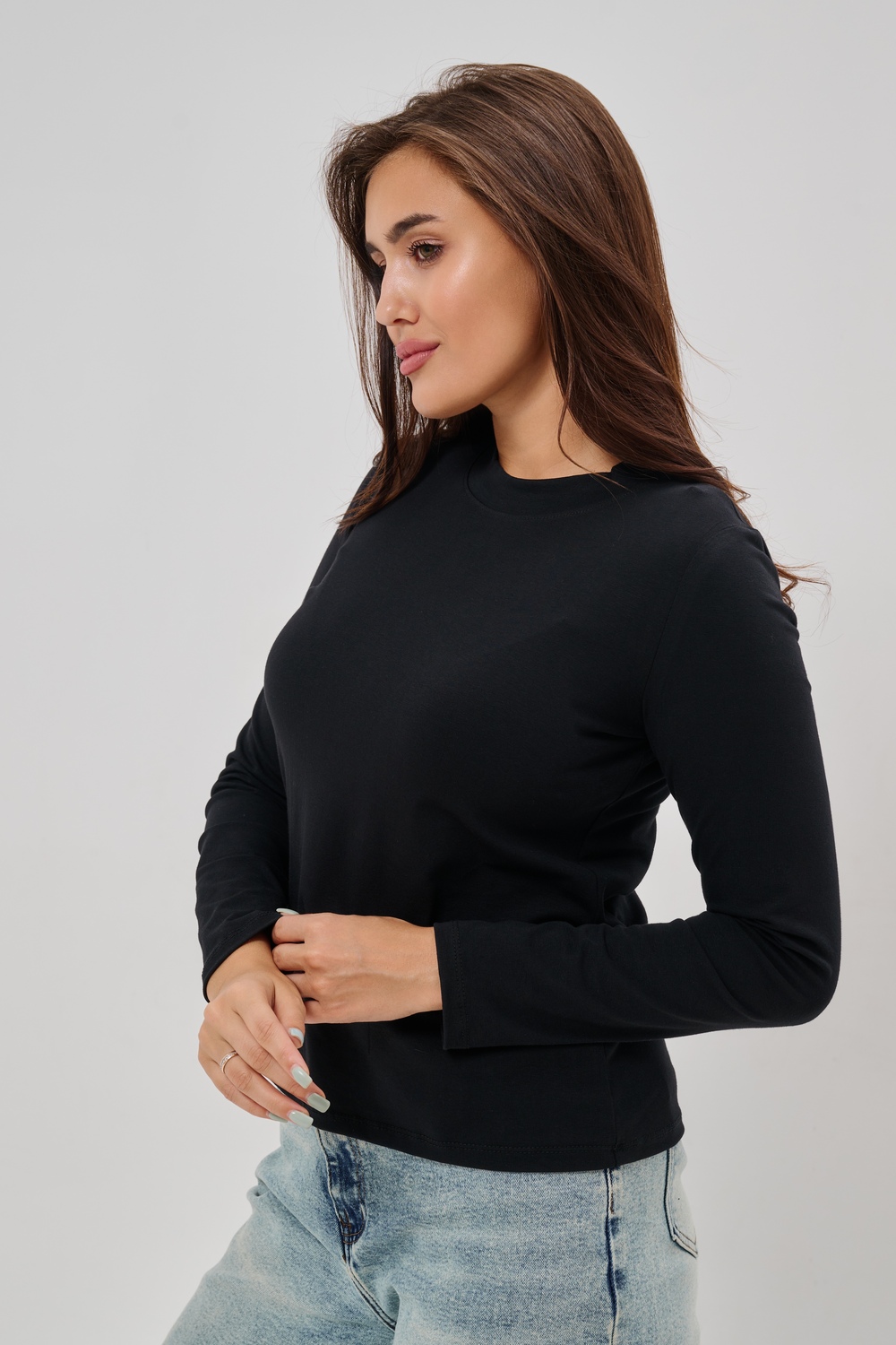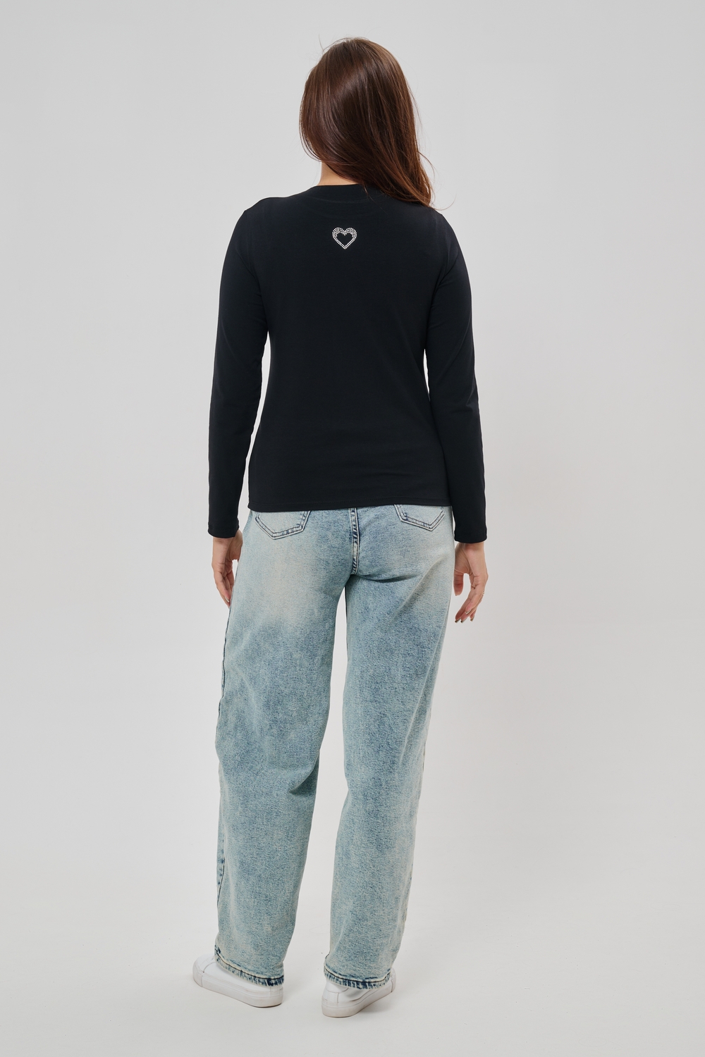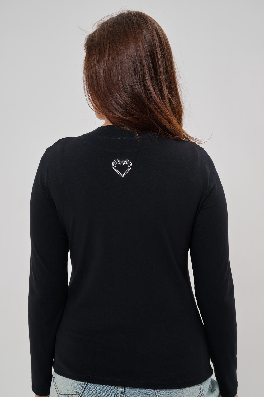 Женский лонгслив из высококачественной кулирки обладающий умеренно приталенным силуэтом и круглым вырезом горловины. Представлен в базовых однотонных цветах, имеет дополнительную градацию размеров для оптимальной посадки. Задняя сторона украшена орнаментом из страз в форме сердца. Универсальная модель для межсезонья, успешно гармонирует с разнообразными элементами гардероба различного стиля.