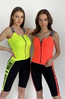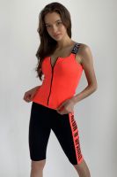 Майка облегающая, средней длины, с округлой горловиной. Размер регулируется за счет эластичности полотна. Бретели выполнены из эластичной тесьмы с надписями. Горловина и проймы обработаны бейкой из основного полотна.