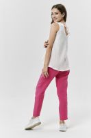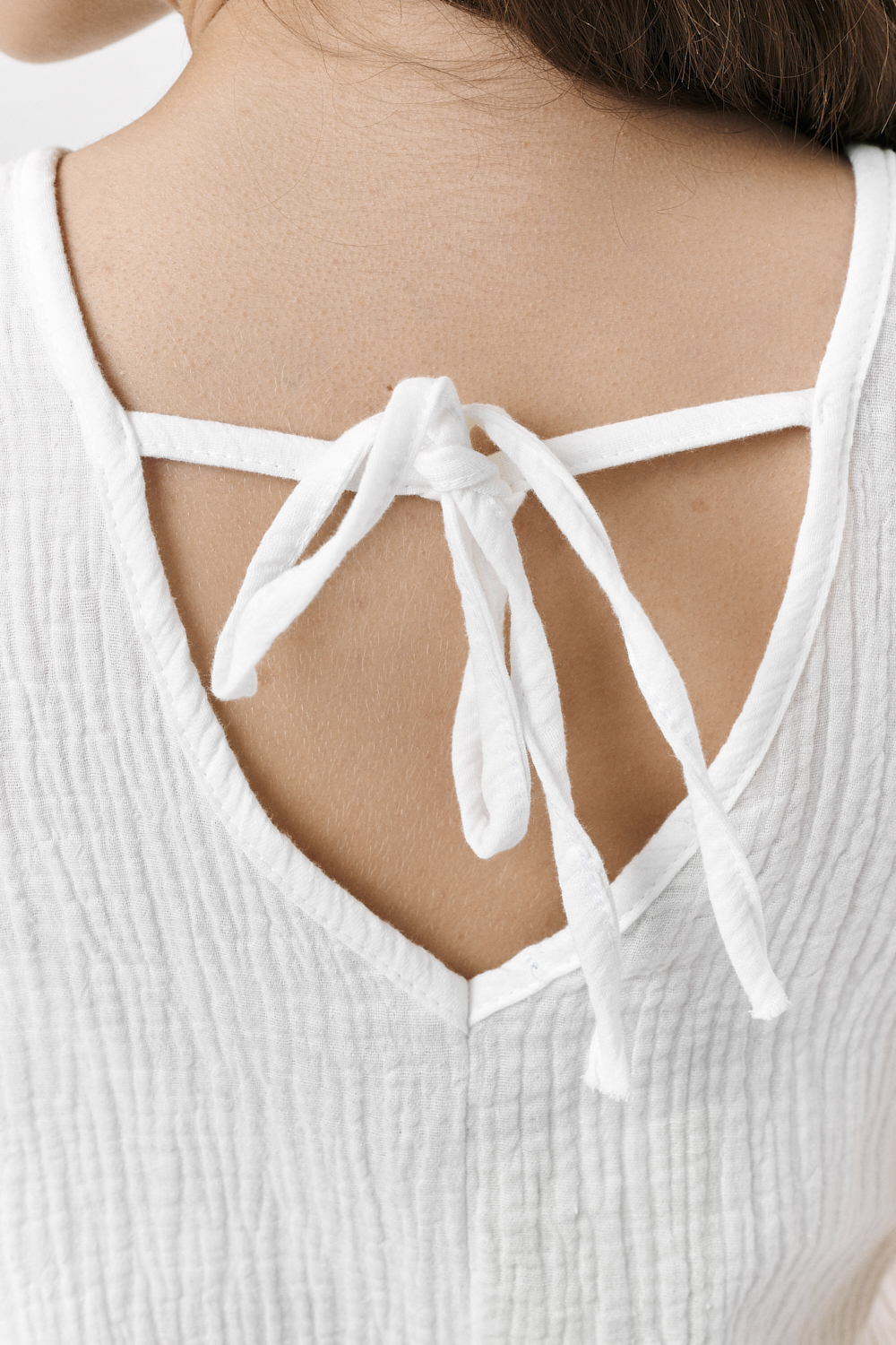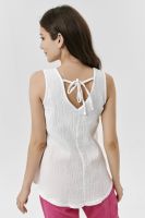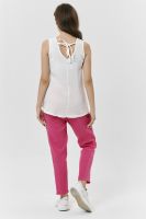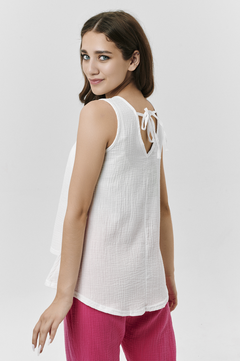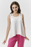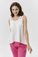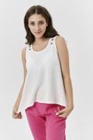 Майка трапецивидного силуэта средней длины, с округлой горловиной, без рукавов, с удлиненной спинкой. На кокетках полочки расположены декоративные люверсы. Горловина и проймы обработаны бейкой из основного полотна.